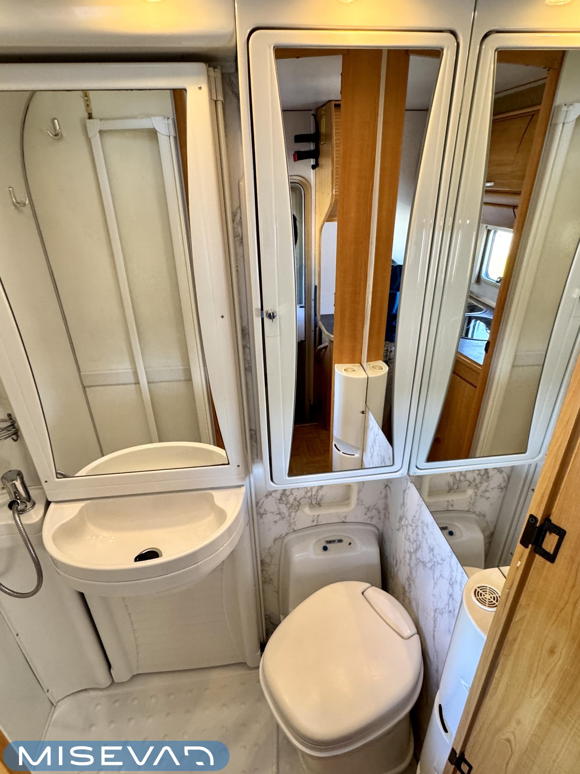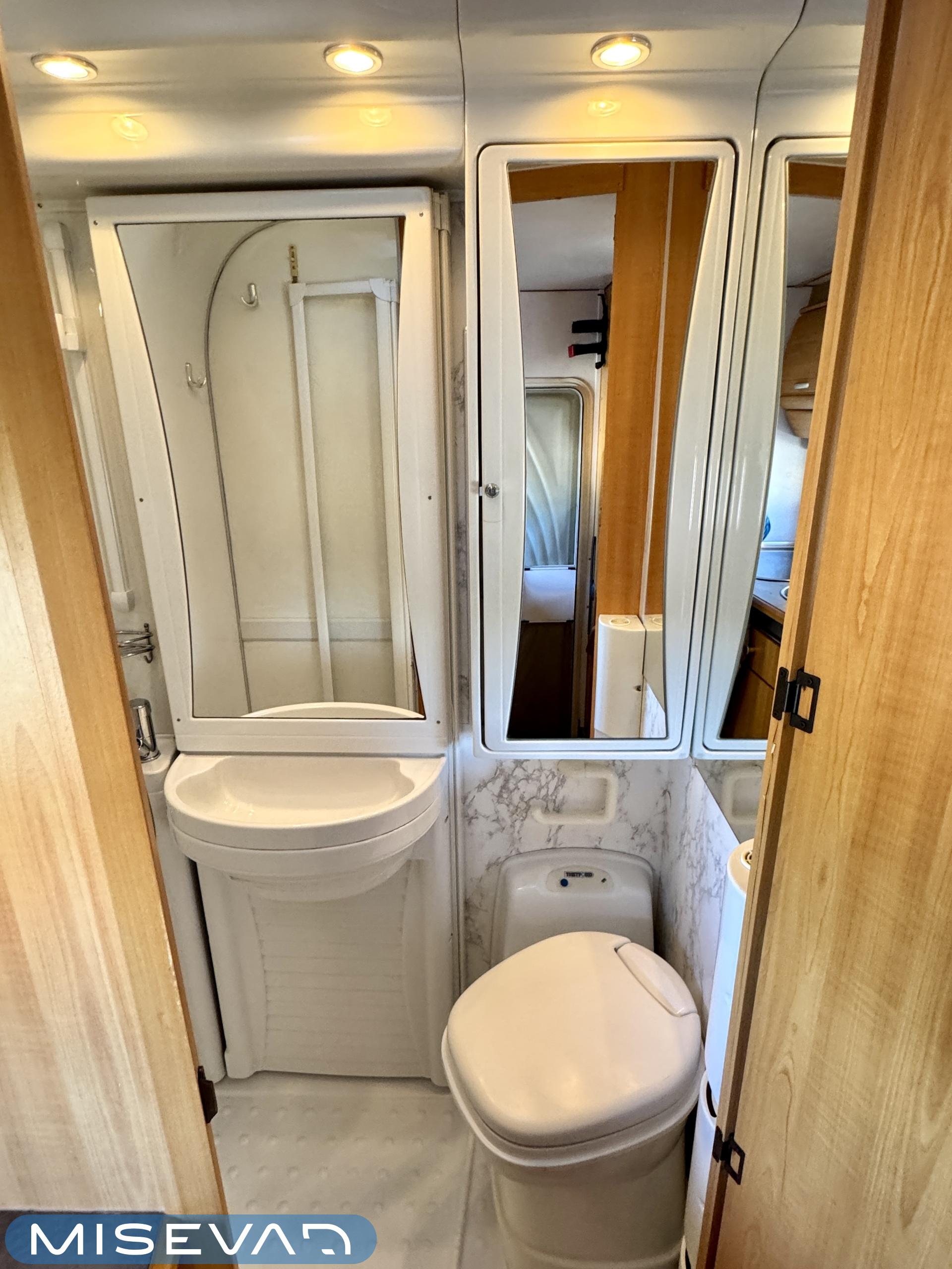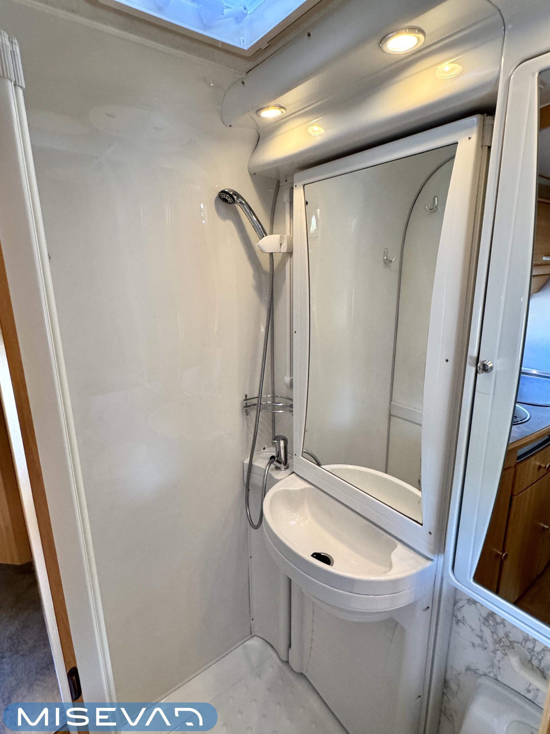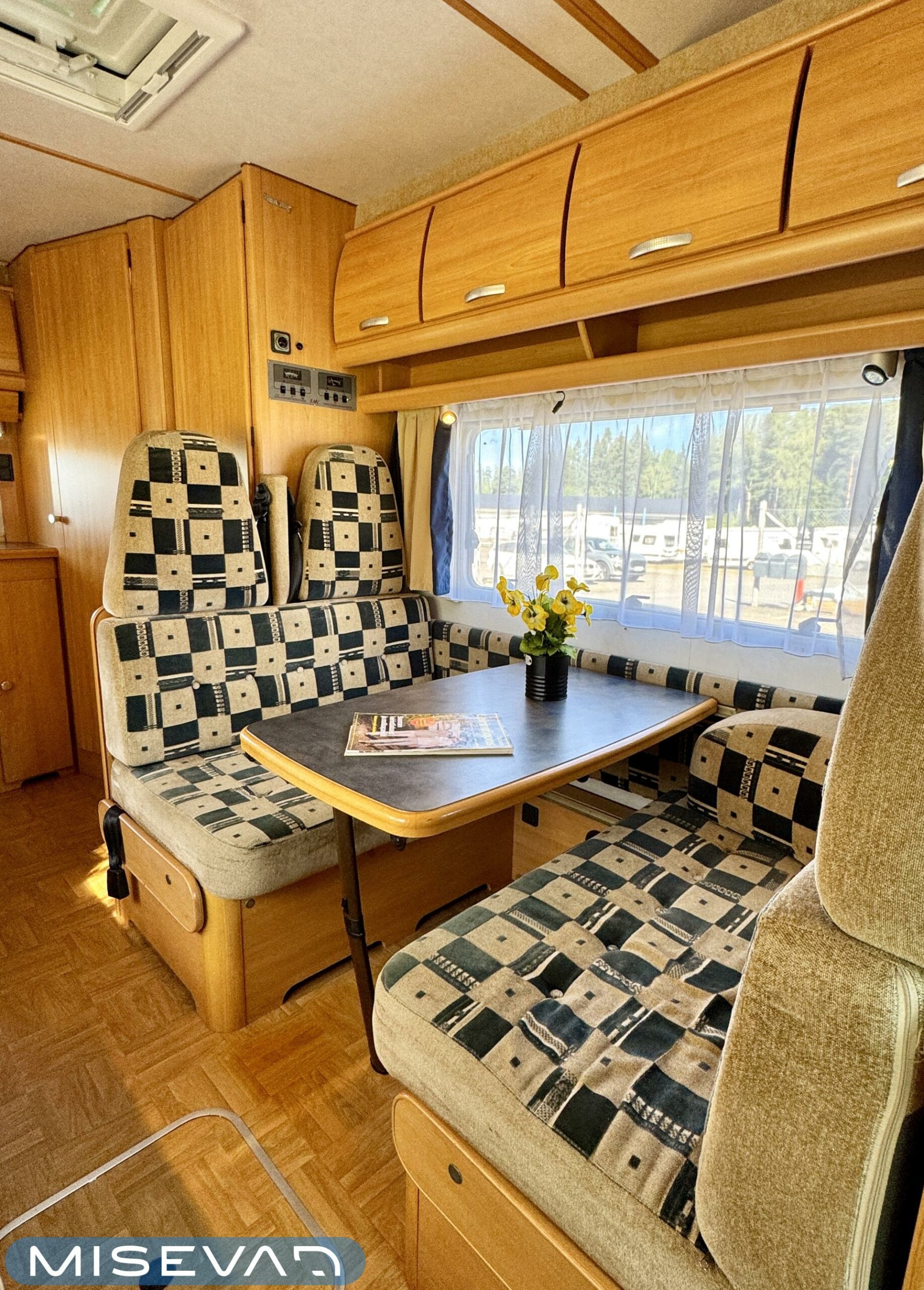 Autosta näkee heti, että sitä on pidetty hyvin. Asuintila on siisti ja todella avara. Suuri parivuode kutsuu pötköttelemään, kooltaan se on jopa 140cm x 200cm. Keskellä autoa on avara pöytäryhmä sivusohvalla, jonka ympärille mahtuu helposti kuusikin henkilöä viettämään iltaa. Karavaanikokki saa takakeittiössä oman rauhan ruoanlaittoon ja laskutilaa on kokkailuun. Pesu-/ wc-tila on reilun kokoinen takaosassa. Kokonaisuus on varusteltu myös runsaalla kaappitilalla. Fiatin iso kone takaa että puhti ei lopu kesken ja mukavia kilometrejä on varmasti edessä!