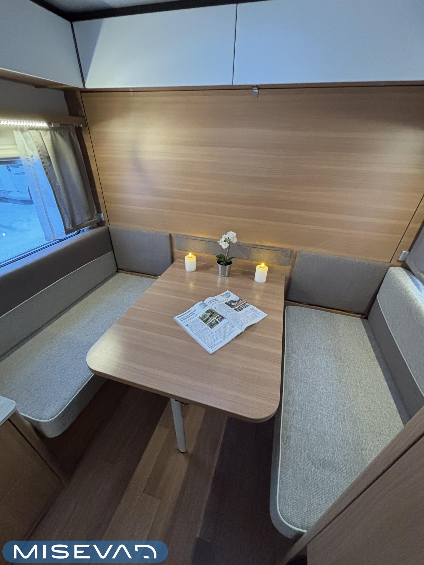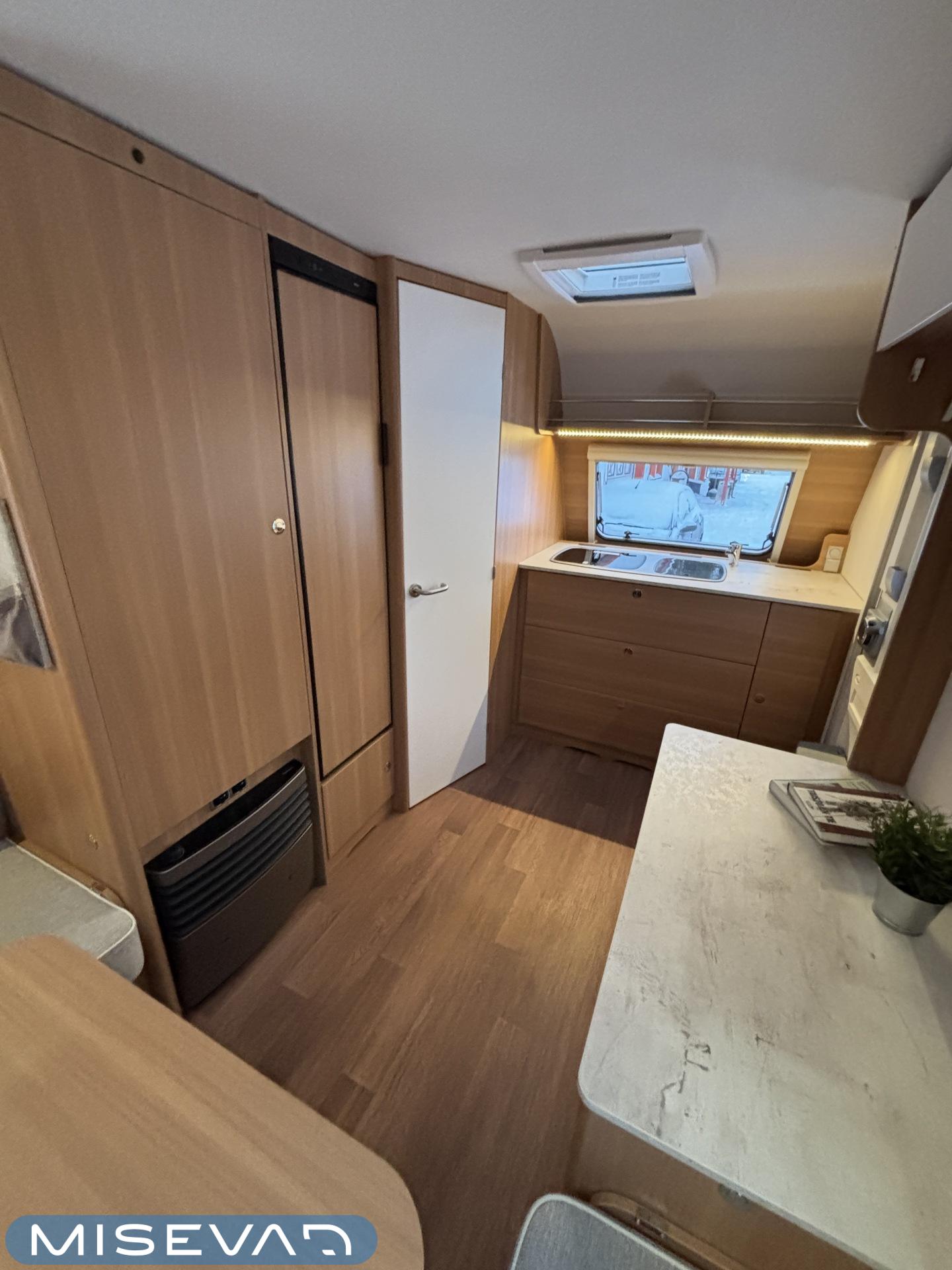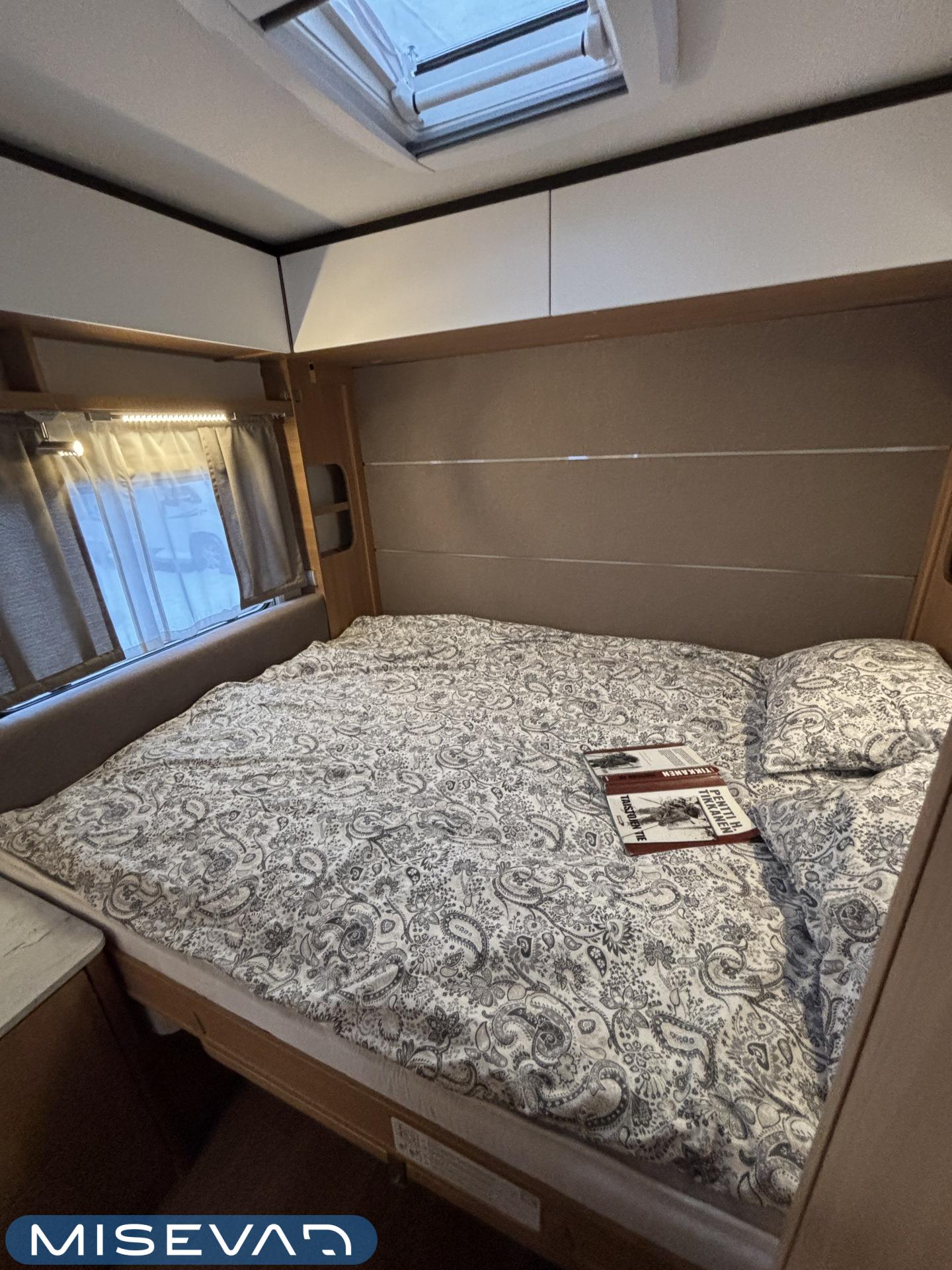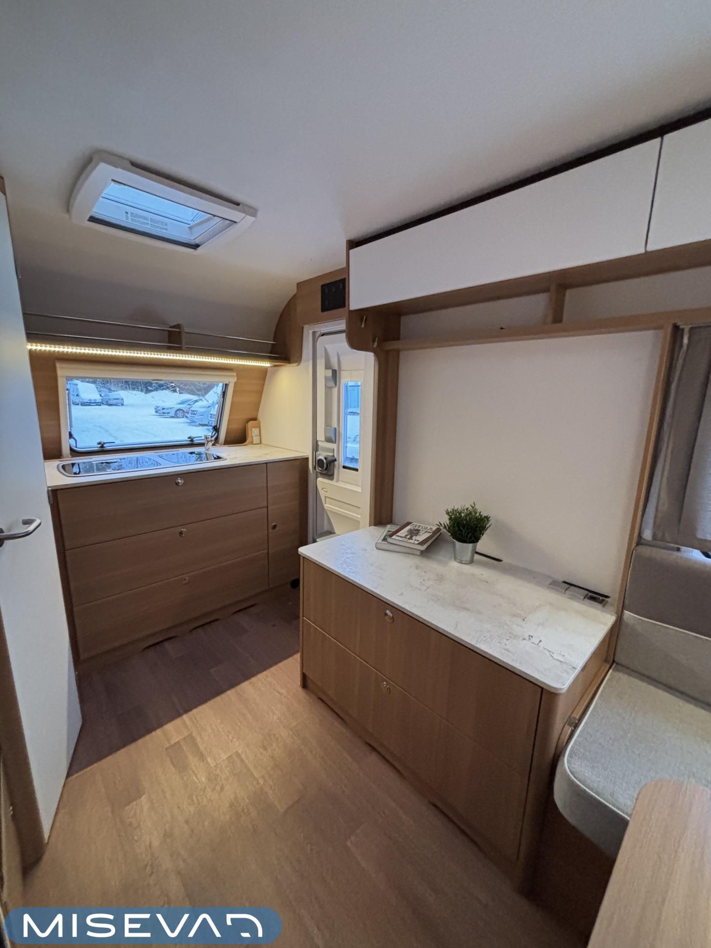 Nyt on näppärä ja ketterä paketti minkä vetämiseen ei veturiltakaan vaadita urotekoja. Vaunu on lattia-alaltaan uskomattoman avaran oloinen. Osasyy tähän on se, että vuode on kätevästi asemoitu ”päiväasennossa” pystyyn takaseinälle. Kun sitten tulee nukkumaanmenoaika, niin pöytä vaan ylös omaan telineeseen ja vuode sitten takaseinältä alas ja siinä se on siinä. Keskeltä vaunua löytyy reilun kokoiset vetolaatikot omaava ”TV taso”. Keittiö on sijoitettu vaunun etuosaan ja keittiön vieressä on WC-tilat. Näihin tehoneliöihin on saatu varusteltua kaikki matkailuajaneuvon perusvarusteet ja jääkaappikin on mallia korkea. Oikein siistikuntoinen tapaus, melkein voisi lähteä jopa ”vaihtoehto” uudelle linjalle tämän tapauksen kanssa. Vaunulla on ollut vain yksi käyttäjäomistaja.