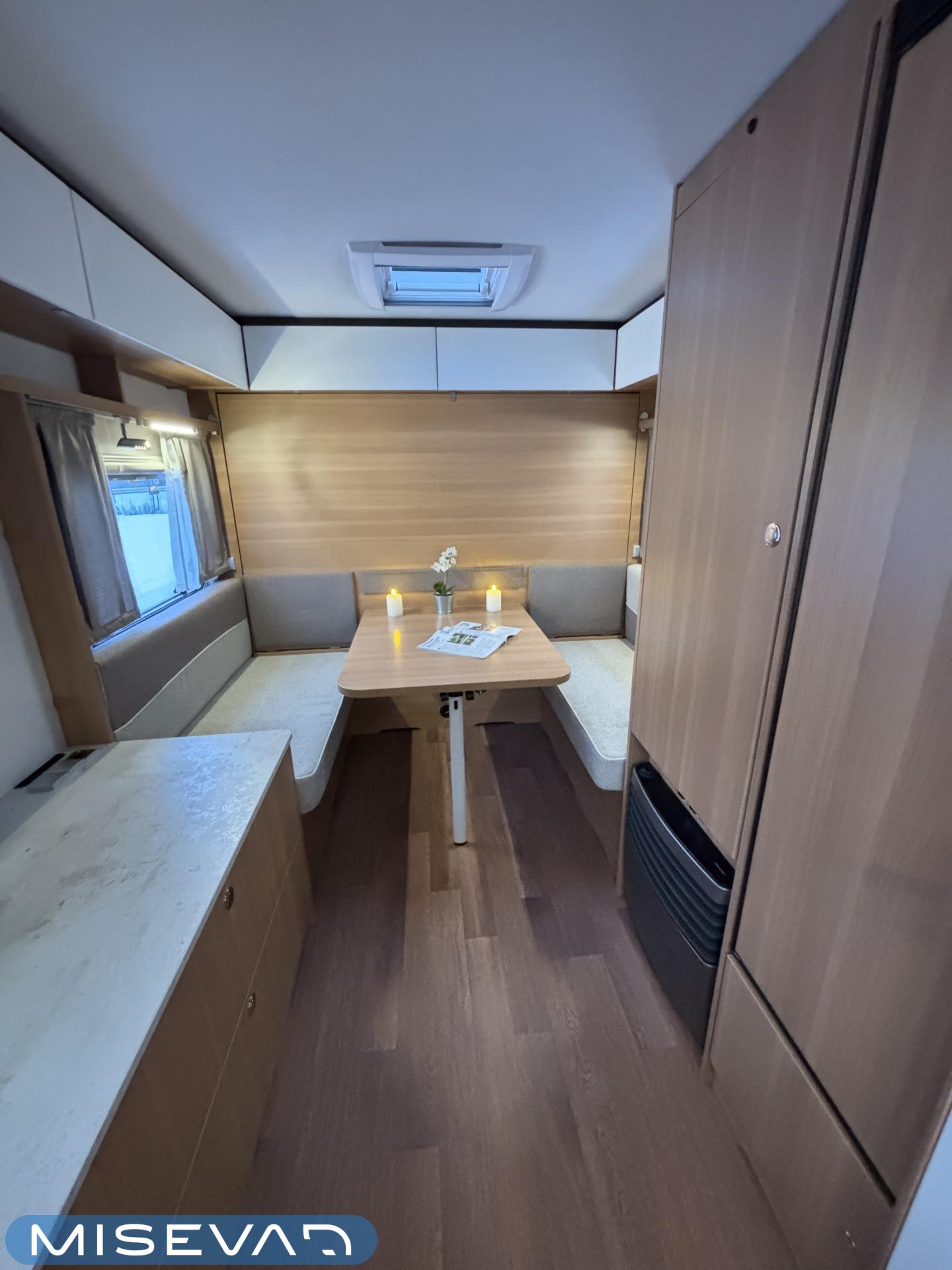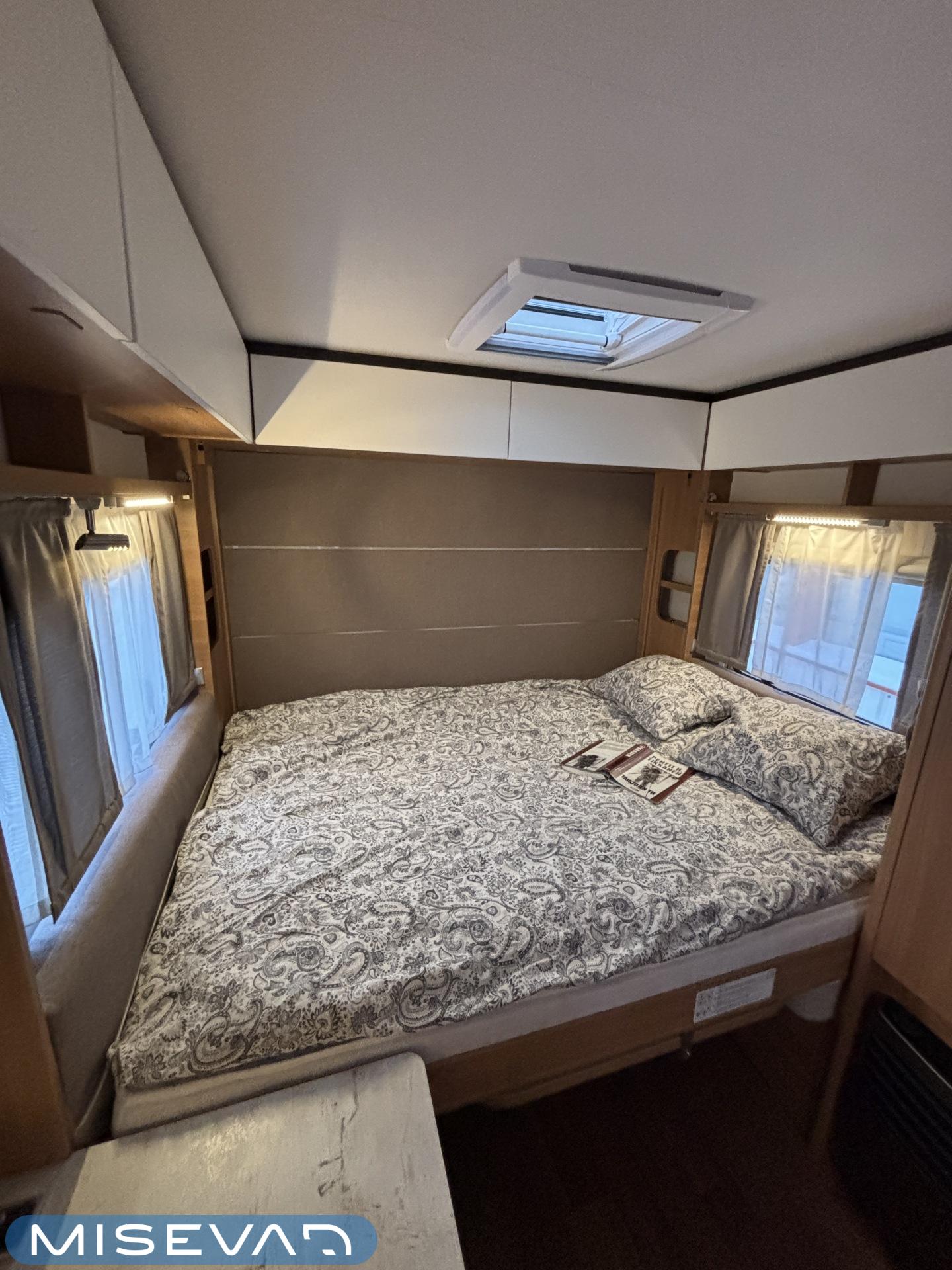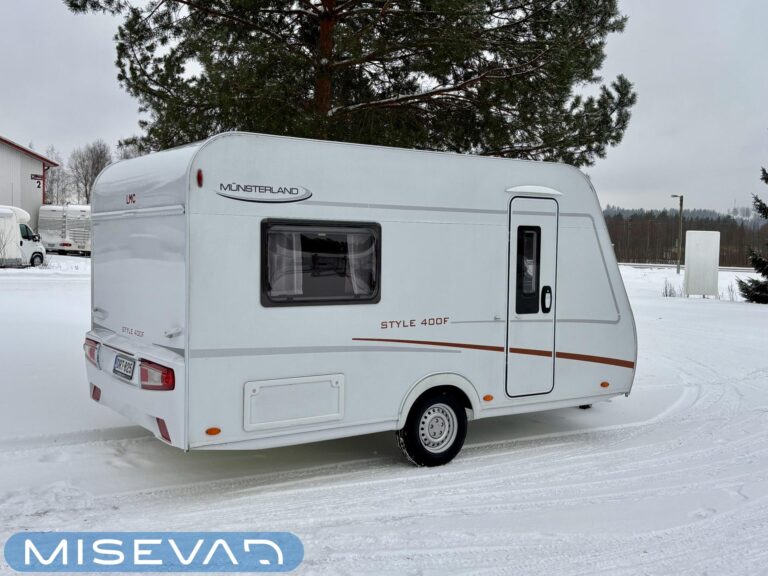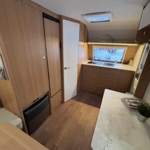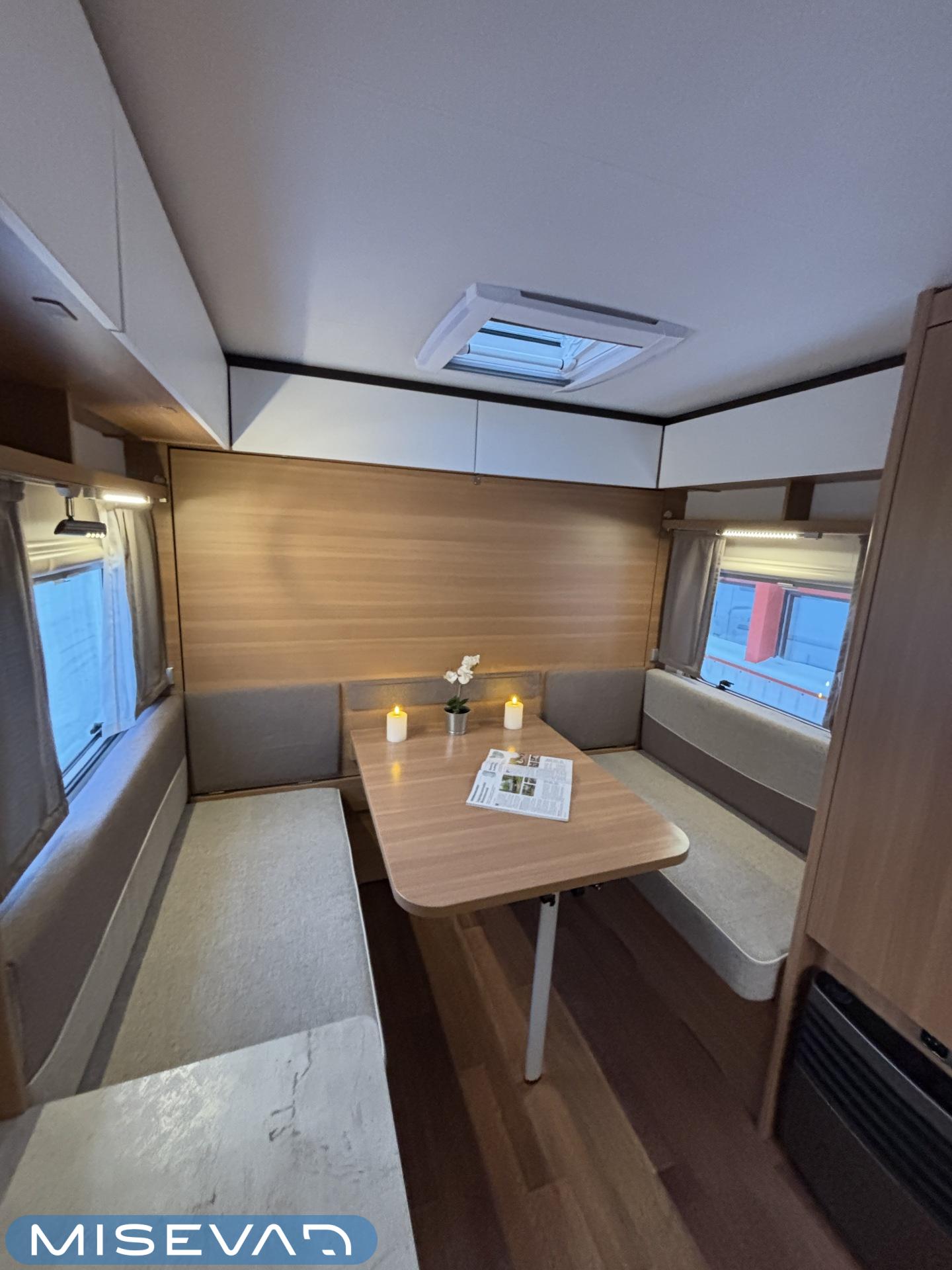 Nyt on näppärä ja ketterä paketti minkä vetämiseen ei veturiltakaan vaadita urotekoja. Vaunu on lattia-alaltaan uskomattoman avaran oloinen. Osasyy tähän on se, että vuode on kätevästi asemoitu ”päiväasennossa” pystyyn takaseinälle. Kun sitten tulee nukkumaanmenoaika, niin pöytä vaan ylös omaan telineeseen ja vuode sitten takaseinältä alas ja siinä se on siinä. Keskeltä vaunua löytyy reilun kokoiset vetolaatikot omaava ”TV taso”. Keittiö on sijoitettu vaunun etuosaan ja keittiön vieressä on WC-tilat. Näihin tehoneliöihin on saatu varusteltua kaikki matkailuajaneuvon perusvarusteet ja jääkaappikin on mallia korkea. Oikein siistikuntoinen tapaus, melkein voisi lähteä jopa ”vaihtoehto” uudelle linjalle tämän tapauksen kanssa. Vaunulla on ollut vain yksi käyttäjäomistaja.