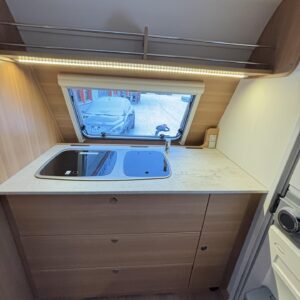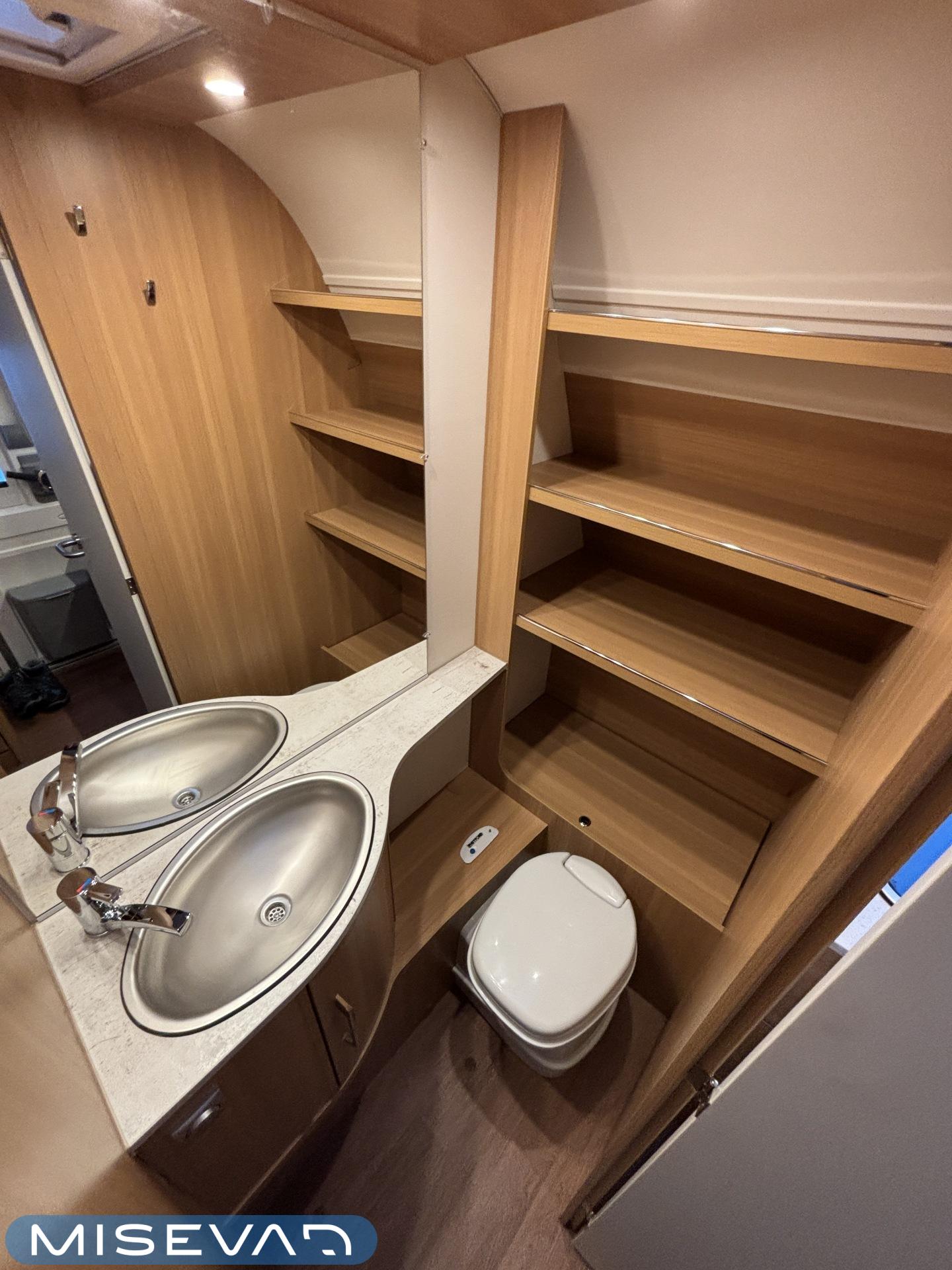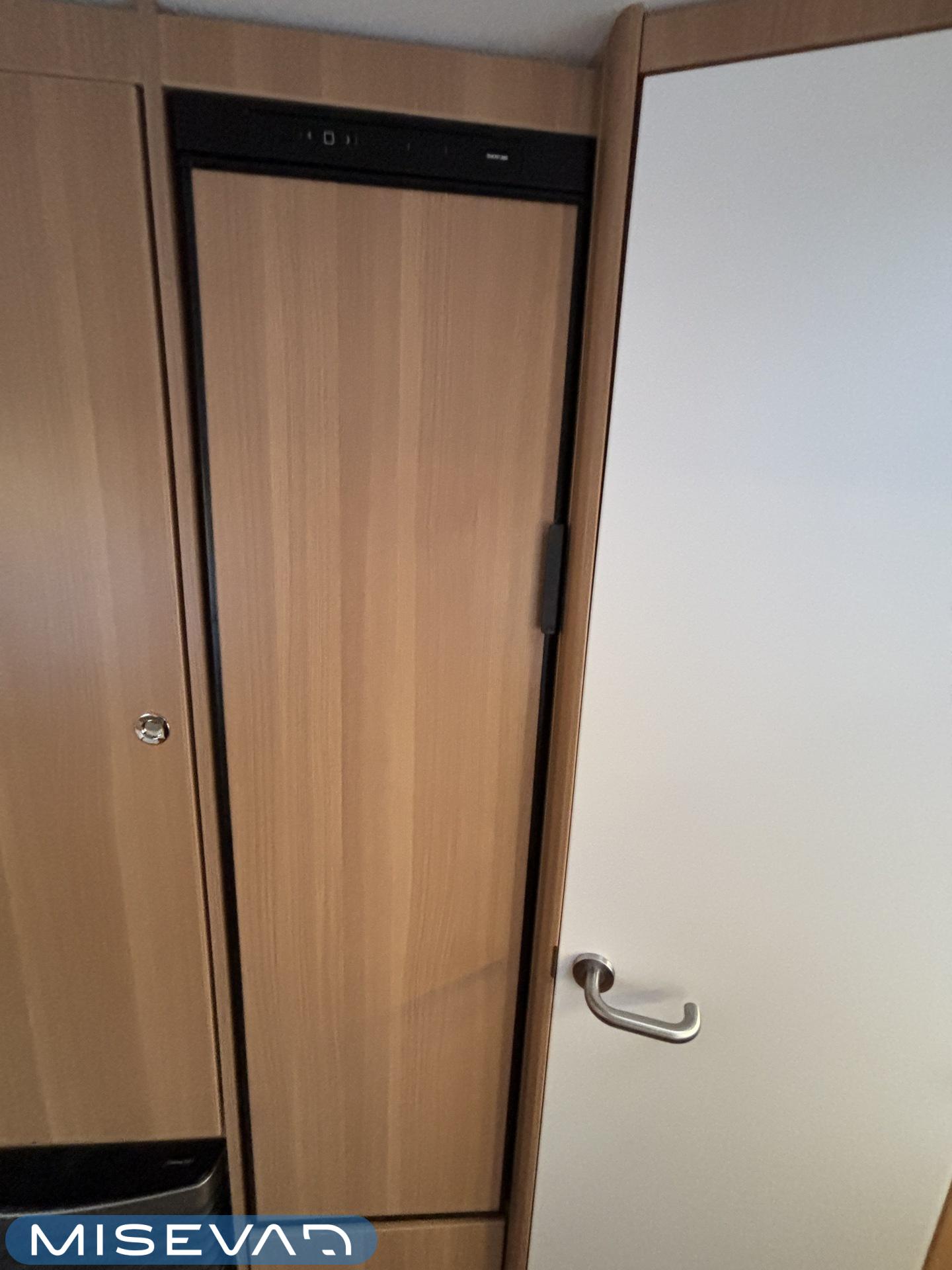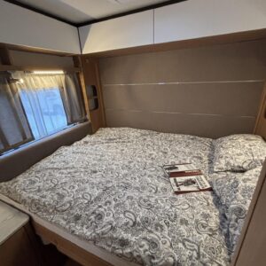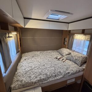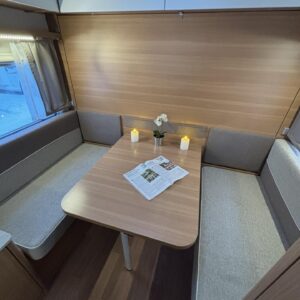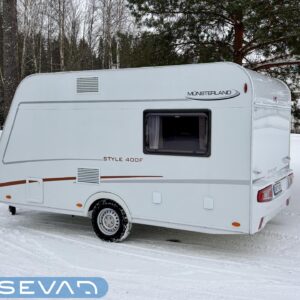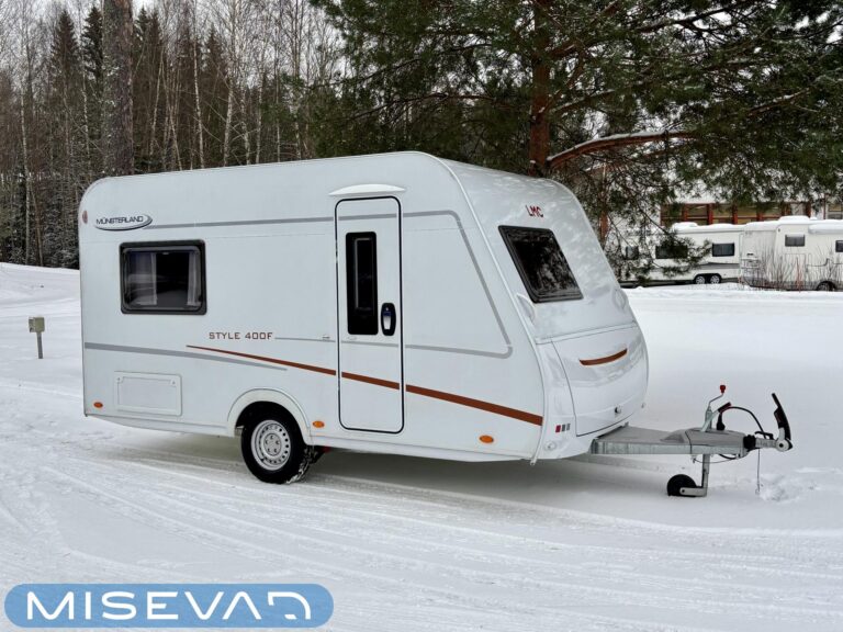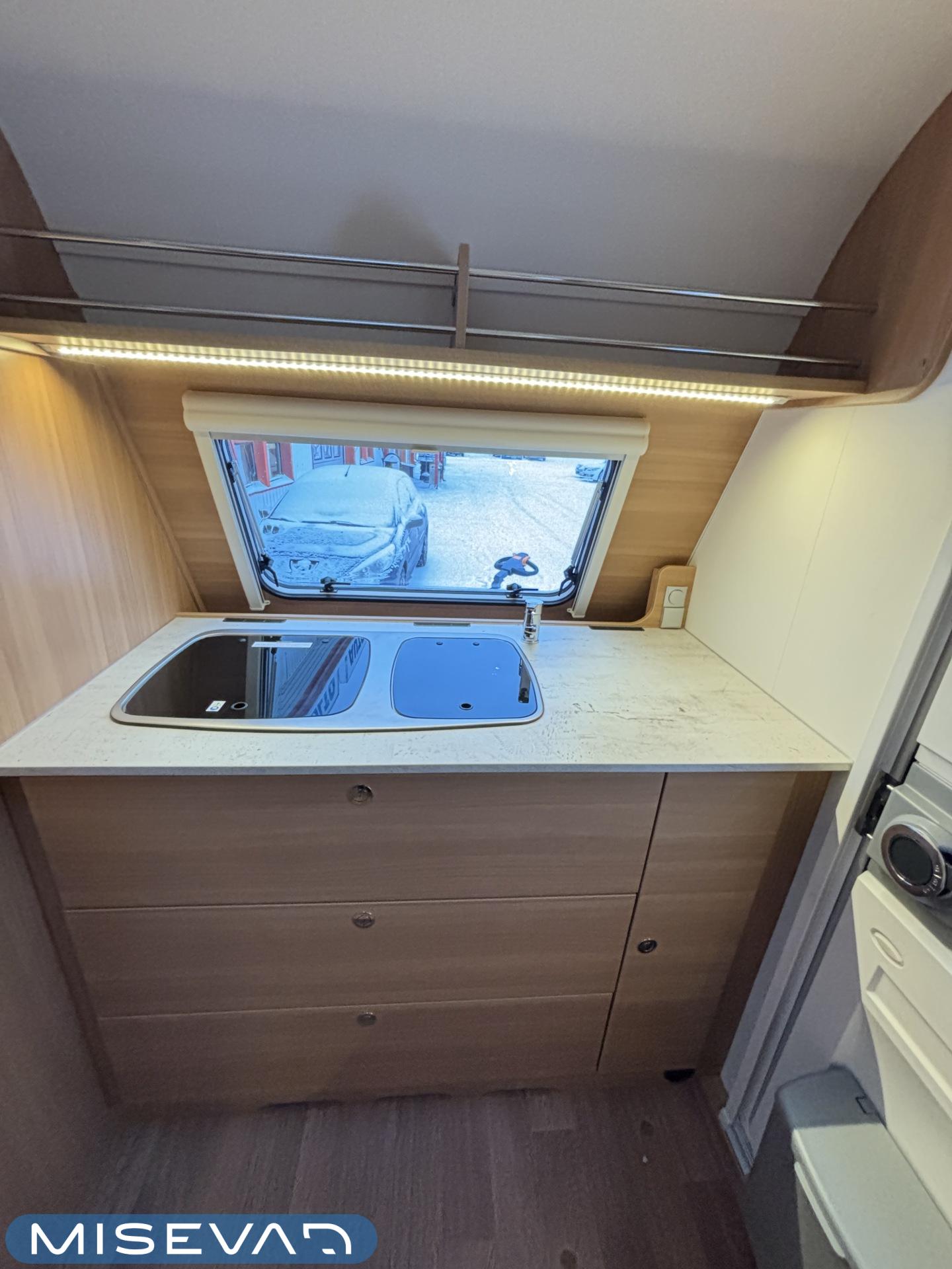 Nyt on näppärä ja ketterä paketti minkä vetämiseen ei veturiltakaan vaadita urotekoja. Vaunu on lattia-alaltaan uskomattoman avaran oloinen. Osasyy tähän on se, että vuode on kätevästi asemoitu ”päiväasennossa” pystyyn takaseinälle. Kun sitten tulee nukkumaanmenoaika, niin pöytä vaan ylös omaan telineeseen ja vuode sitten takaseinältä alas ja siinä se on siinä. Keskeltä vaunua löytyy reilun kokoiset vetolaatikot omaava ”TV taso”. Keittiö on sijoitettu vaunun etuosaan ja keittiön vieressä on WC-tilat. Näihin tehoneliöihin on saatu varusteltua kaikki matkailuajaneuvon perusvarusteet ja jääkaappikin on mallia korkea. Oikein siistikuntoinen tapaus, melkein voisi lähteä jopa ”vaihtoehto” uudelle linjalle tämän tapauksen kanssa. Vaunulla on ollut vain yksi käyttäjäomistaja.