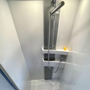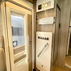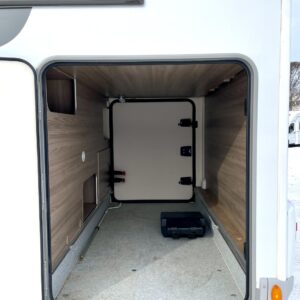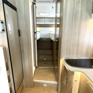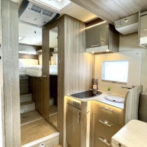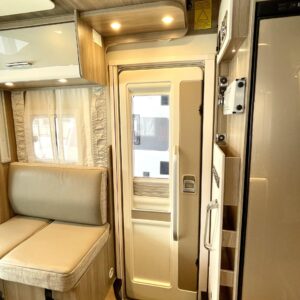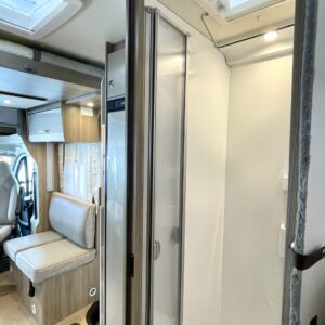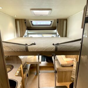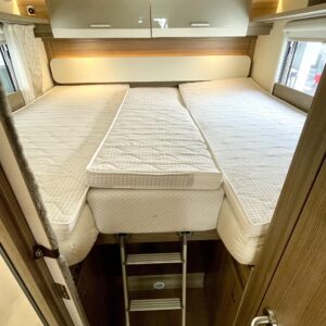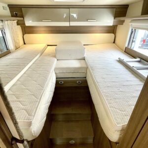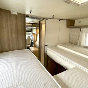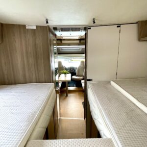 Tässä autossa on suuremmistakin reissuvehkeistä tutut erilliset wc- ja suihkutilat käytävän molemmin puolin. Wc:n ovi toimii auki ollessaan myös osastoivana väliovena eristäen auton takaosan tilavan makuuhuoneen muusta tilasta. Erillisvuoteet yhdistyvän välikappaleen avulla suureksi siskonpediksi. Autossa yöpyykin helposti pari aikuista ja kolme lasta. Sängyn alla on suuri takatalli joka vetää tarvittaessa useammankin polkupyörän.