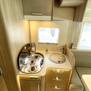 Auton keskiosan istuinryhmä muuntautuu käden käänteessä turvavyöllisiksi matkustamopenkeiksi. Perille saavuttua istuinryhmä toimii oleskelutilana jopa kuudelle. Näppärässä kulmakeittiössä on kolmipolttiminen liesi, jolla lihapullapannu ja muusi kypsyvät yhtaikaa. Kokin selän takana on korkea pakastelokerolla varustettu jääkaappi koko pesueen eväille.