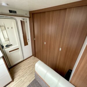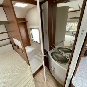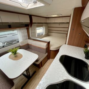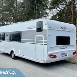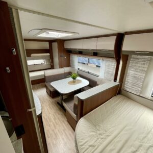 Lapsiperheen rientoihin sopiva LMC. 4. henkisen perheen unelmavaunu jossa lapsille pyhitetty takapää kerrosvuoteineen ja aikuisille oma makuuhuone etupäässä.