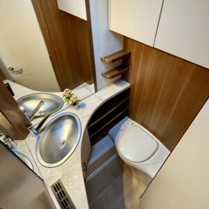 Hyvin varusteltu keittiö liesineen ja suurella jääkaapilla antaa loistavat mahdollisuudet ruoanlaittoon myös pidemmillä reissuilla.