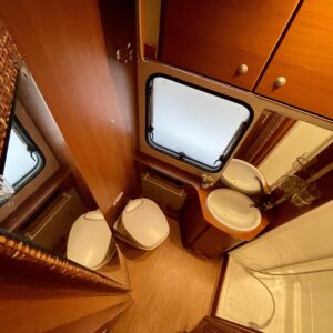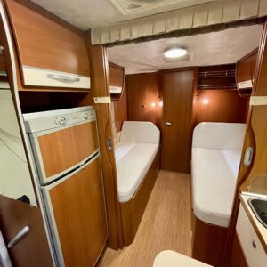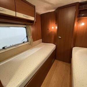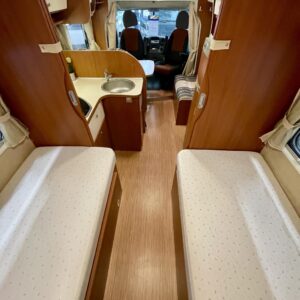 Tässä autossa matkanteko ja asuminen ovat tasapainossa. Matalat erillisvuoteet takaavat mukavat unet ja helpon kulun ilman kiipeilyä. Vuoteiden takana, auton peräosassa, odottaa tilava wc sekä erillinen suihkutila oma rauhallinen spa-hetki keskellä luontoa.