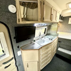 Autoa varusteltu hurjasti ja pidetty hyvänä. Tukeva paripyöräalusta, ympärivuoteiseen käyttöön soveltuvat hyväkuntoiset renkaat ja vetokoukku. Lämpöeristys seinissä ja pieni ovi asuintilaan.