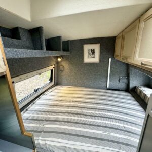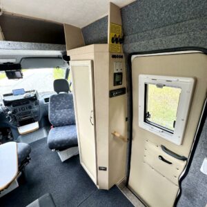 Edessä istuinryhmä neljälle, keskellä keittiö, jossa reilusti laskutilaa ja pesuhuone kasetti-WC:llä. Takana parivuode, jossa sivulle leviävä erkkeri, jonka ansiosta vuode on yli 2m pitkä. Takana monikäyttöinen kalusteseinä ja vuoteen alla suuri tavaratila. Reilusti kaappitilaa kaikkialla.
