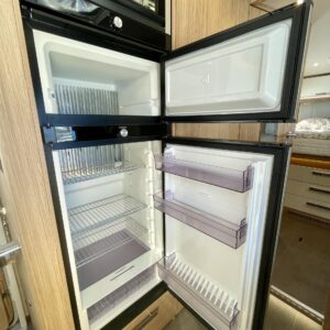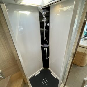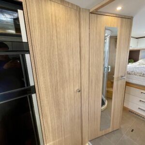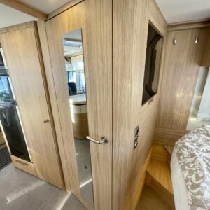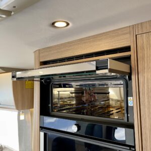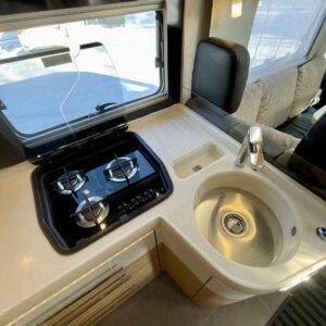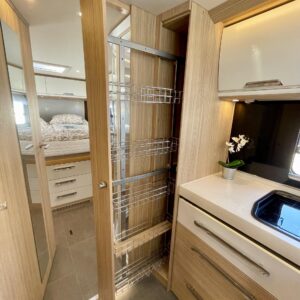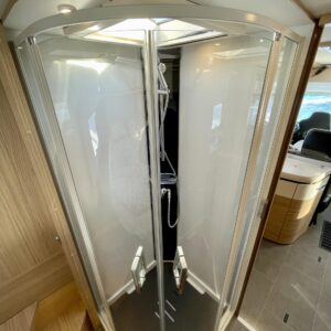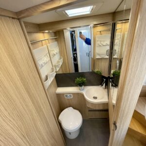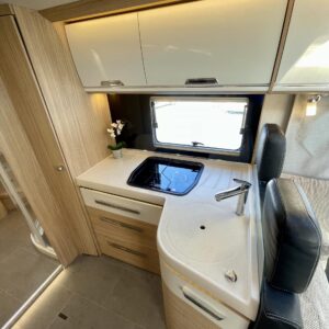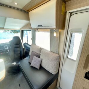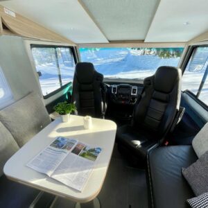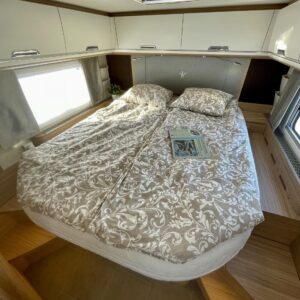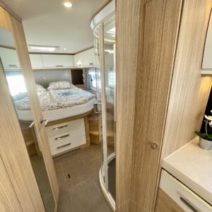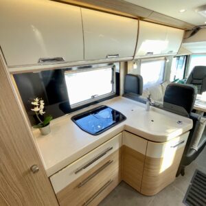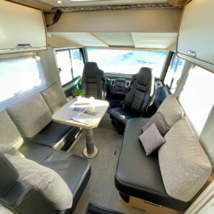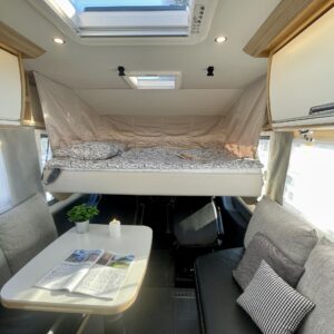Auton takatilaa hallitsee upea saarekevuode. Keskeltä löytyvät erilliset suihku- ja wc-tilat sekä keittiö kaasu-uunilla ja molempiien suuntiin aukeavilla jääkaapilla ja erillisellä pakastimella. Keulassa on tilava pöytäryhmä kääntyvin ohjaamon penkein, sekä sähköllä alas laskettavavuode.