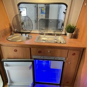 Jääkaappi, Kasetti WC, Takakeittiö, Lattialämmitys (sähkö), Trumatic, Liesi, Kattoluukku, Lattialämmitys, Tukijalat