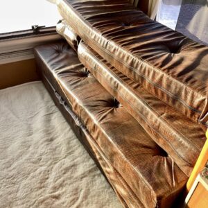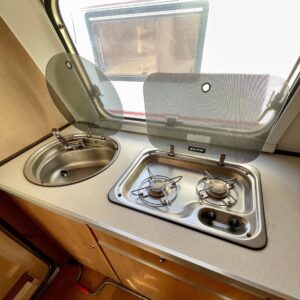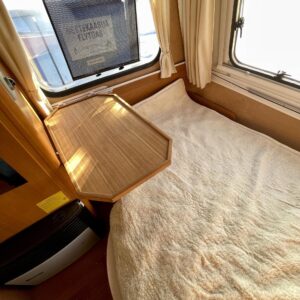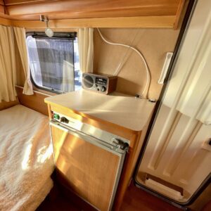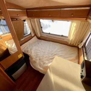 Uudemman Poksin tyylisillä tarroilla varustettu ulkoasu kääntää katseet ja nostaa hymyn huulille. Sisätiloihin on rakennettu poikittainen parisänky sekä pieni tarjoilupöytä, jotka tekevät vaunusta viihtyisän ja käytännöllisen.