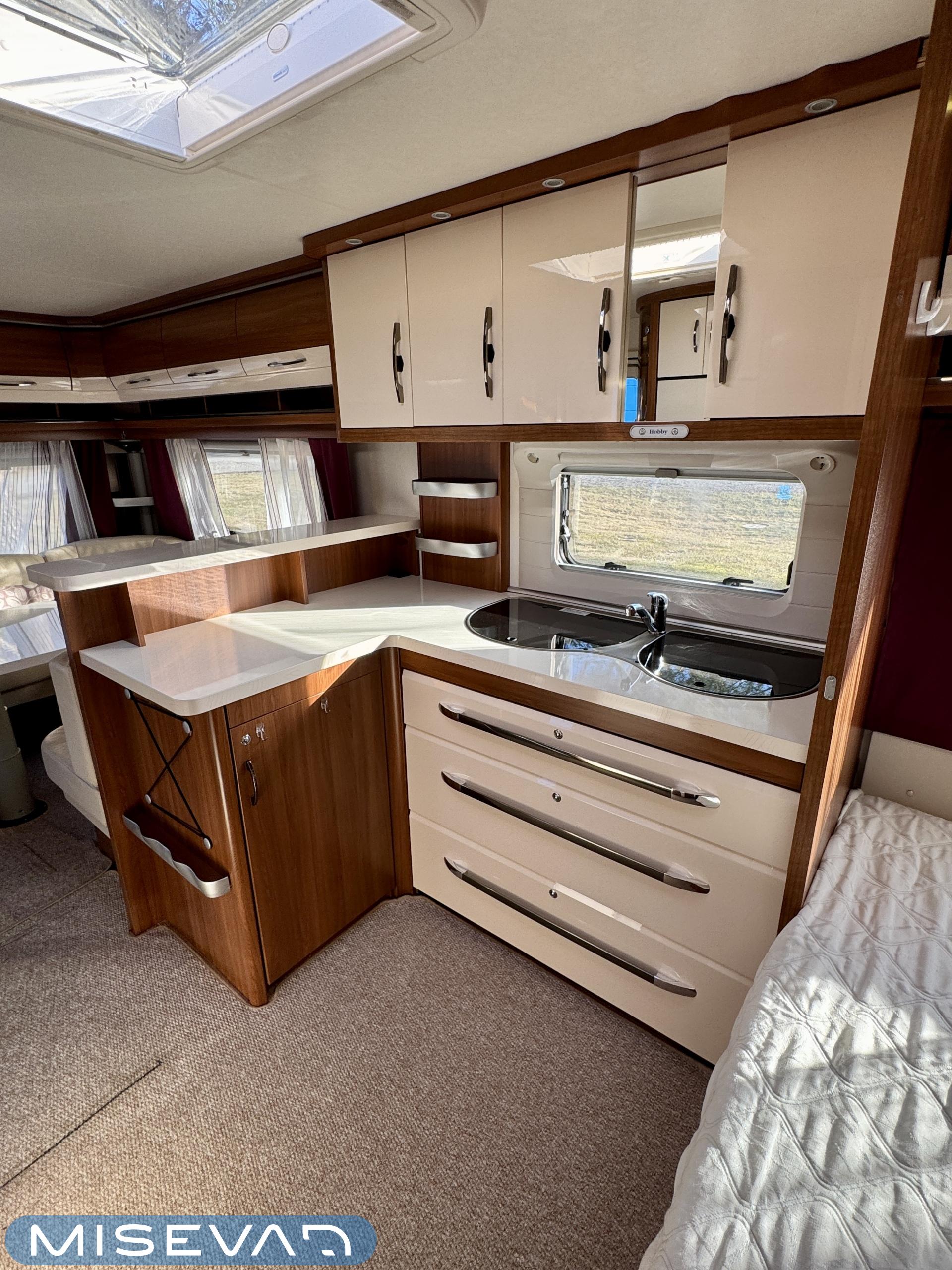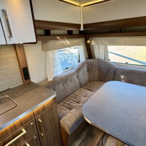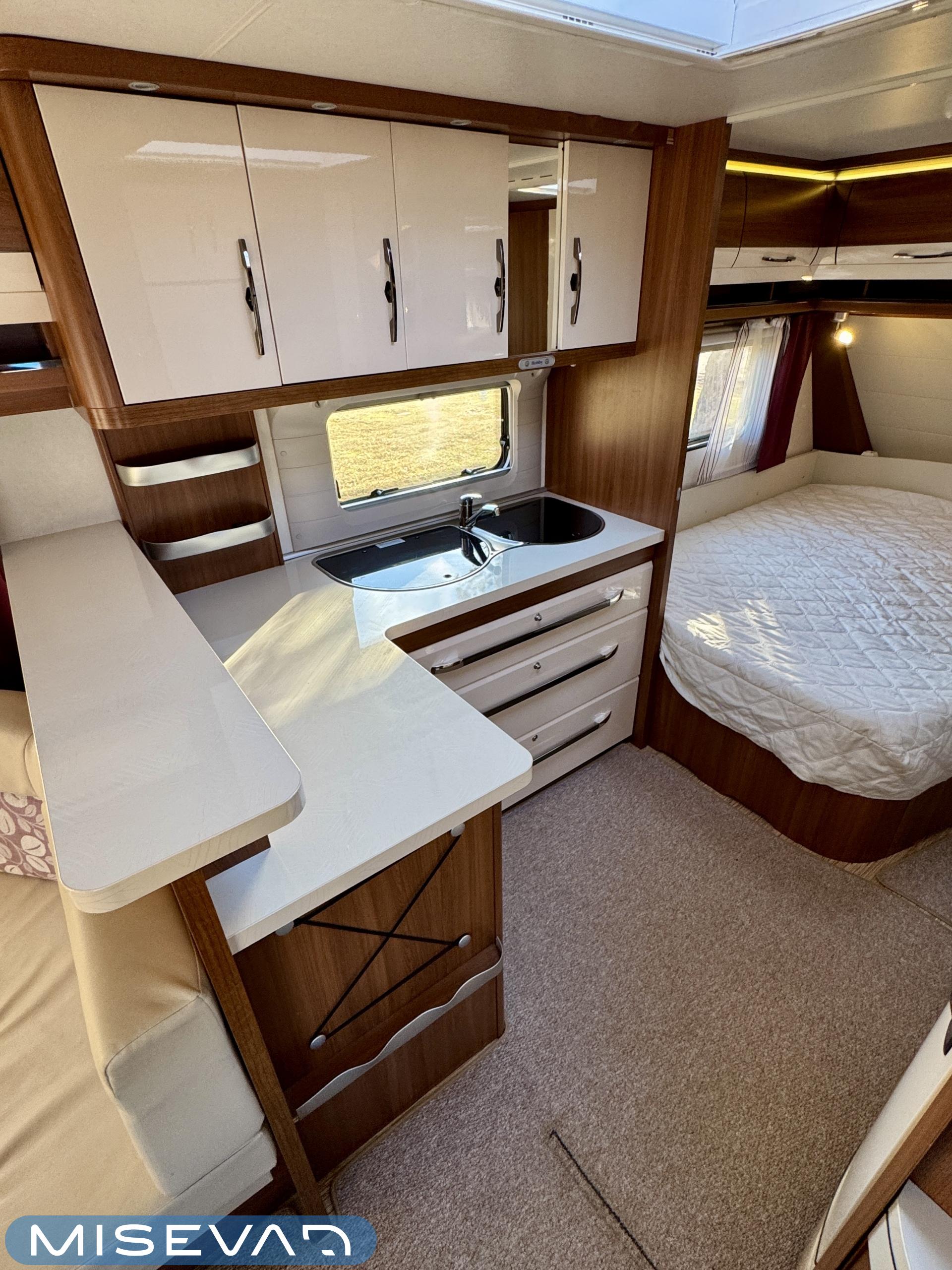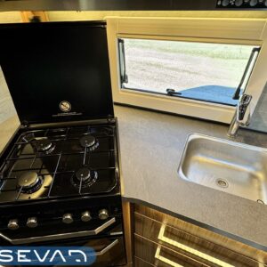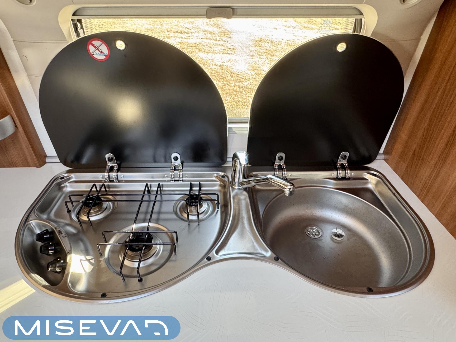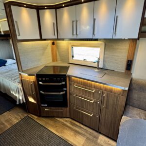 Vaunun keskivaiheilta löytyy keittiö, jonka varustukseen kuuluu kaasulieden lisäksi iso jääkaappi erillisellä pakastinlokerolla, liesituuletin, mikro ja kaasu- uuni grillillä.