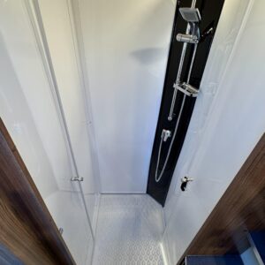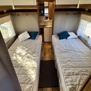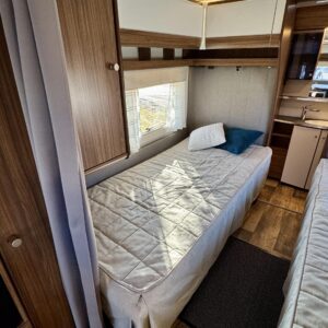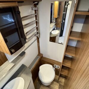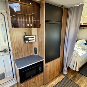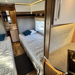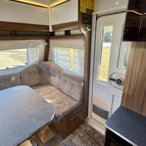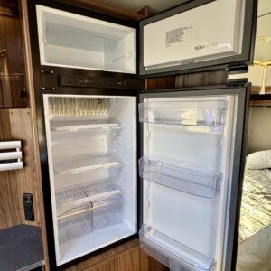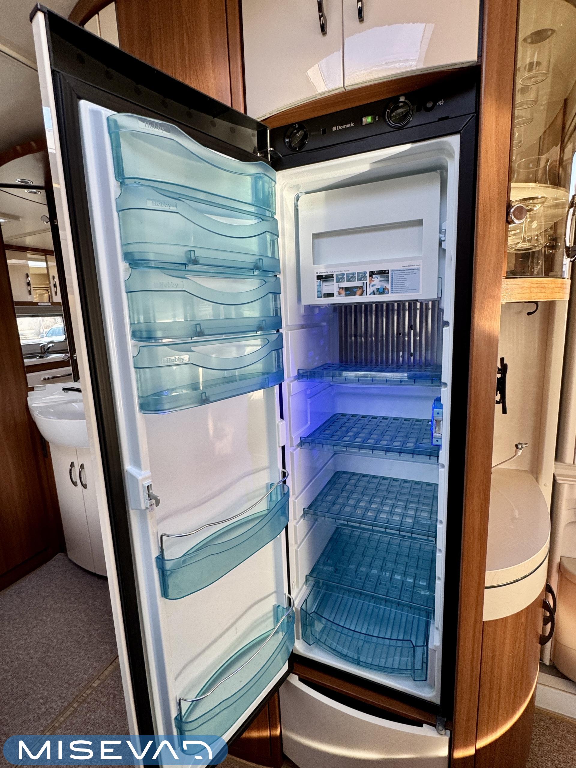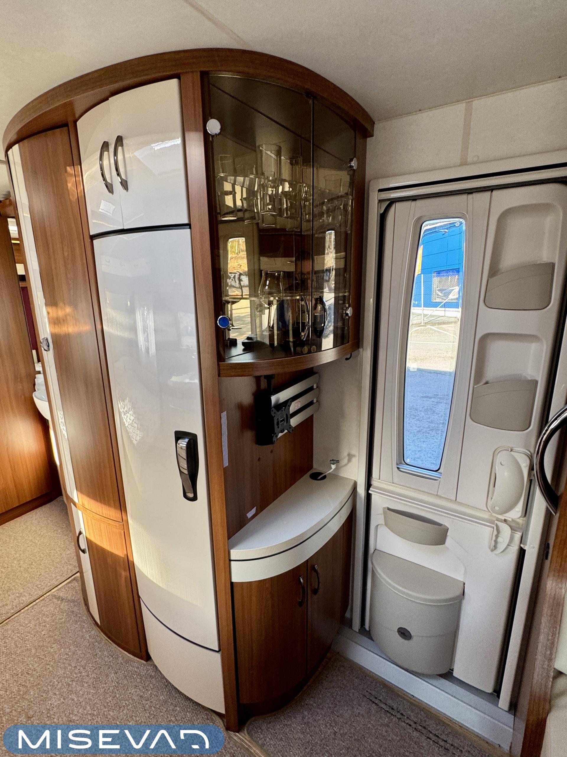 Vaunun keskivaiheilta löytyy keittiö, jonka varustukseen kuuluu kaasulieden lisäksi iso jääkaappi erillisellä pakastinlokerolla, liesituuletin, mikro ja kaasu- uuni grillillä.