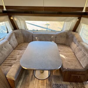 Vaunun etuosassa on viihtyisä pöytäryhmä, jonka ympärille mahtuu kivasti 5 – 6 henkeä menneitä muistelemaan ja tulevaa suunnittelemaan. Pöytäryhmästä saa tarpeen vaatiessa loihdittua lisää makuupaikkoja.