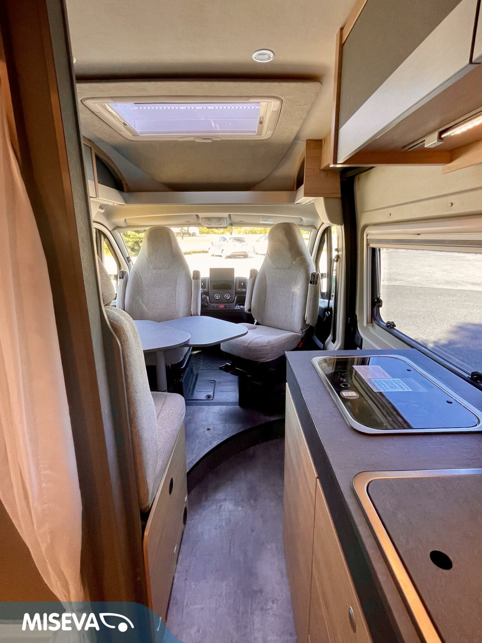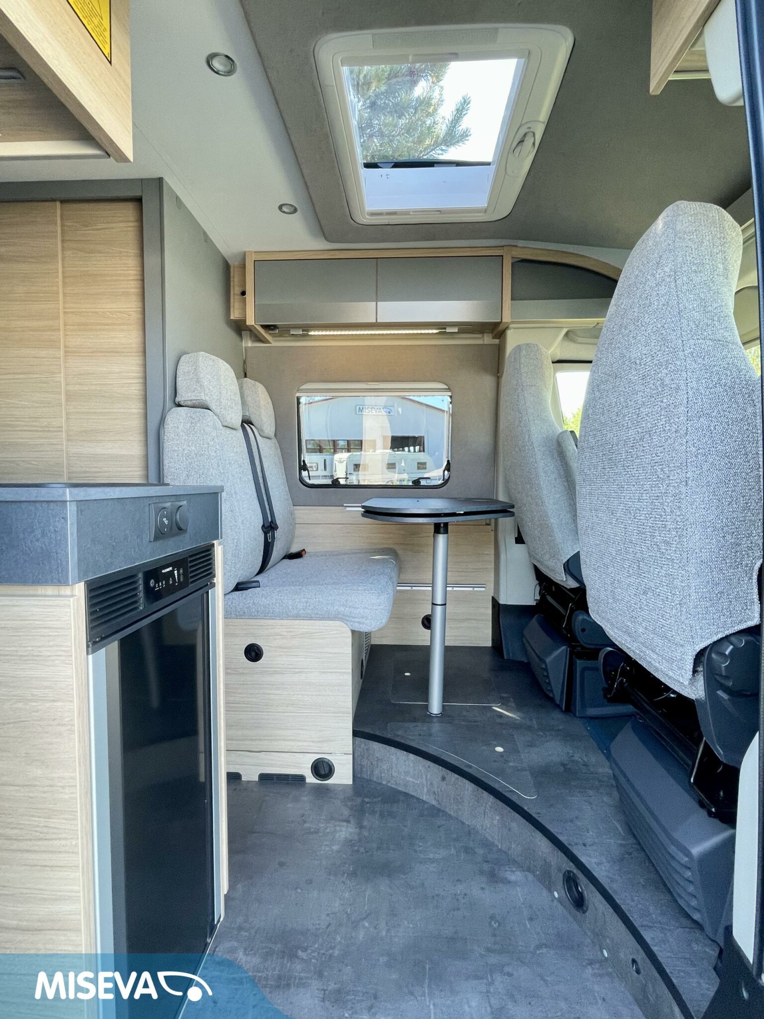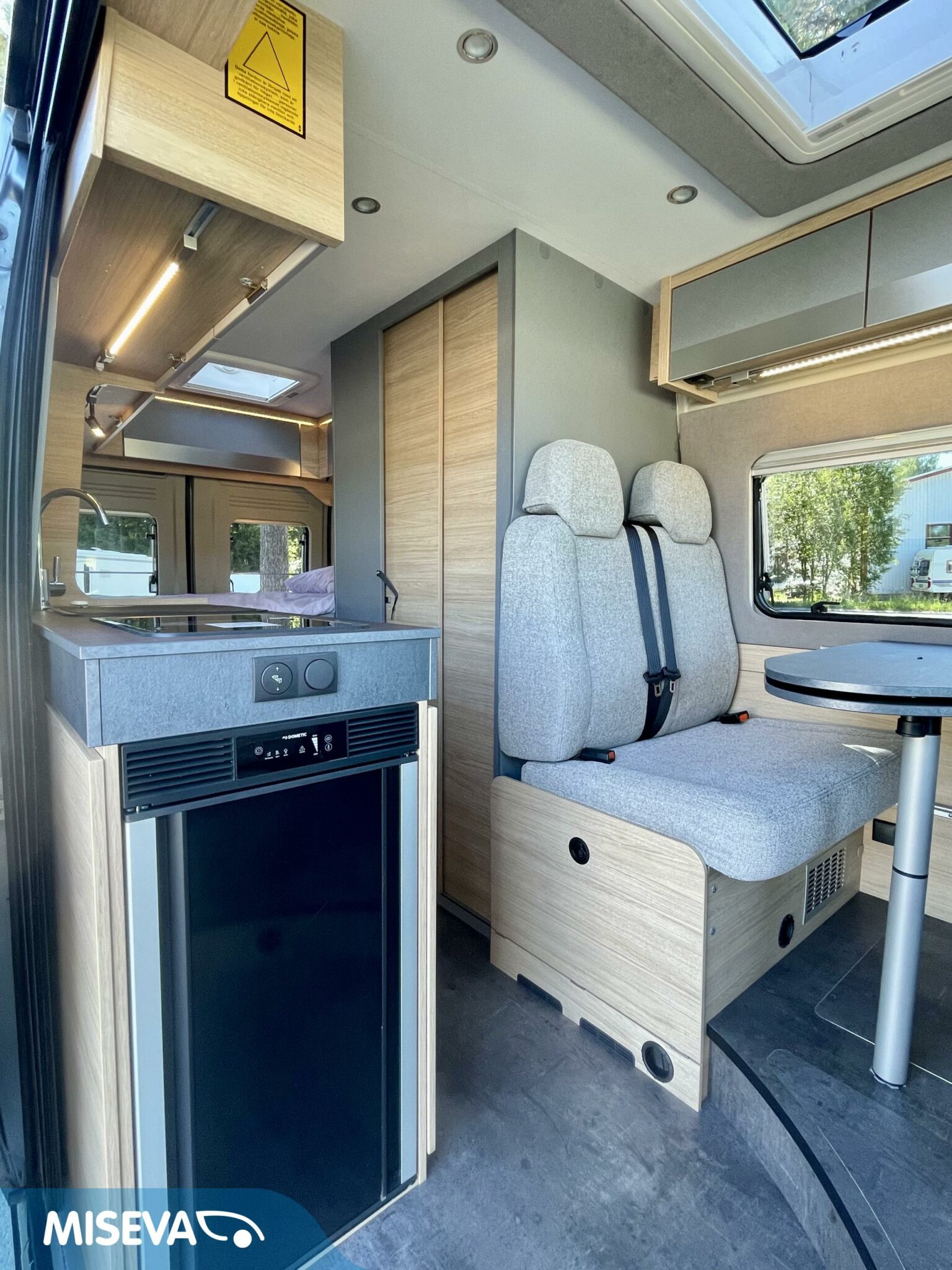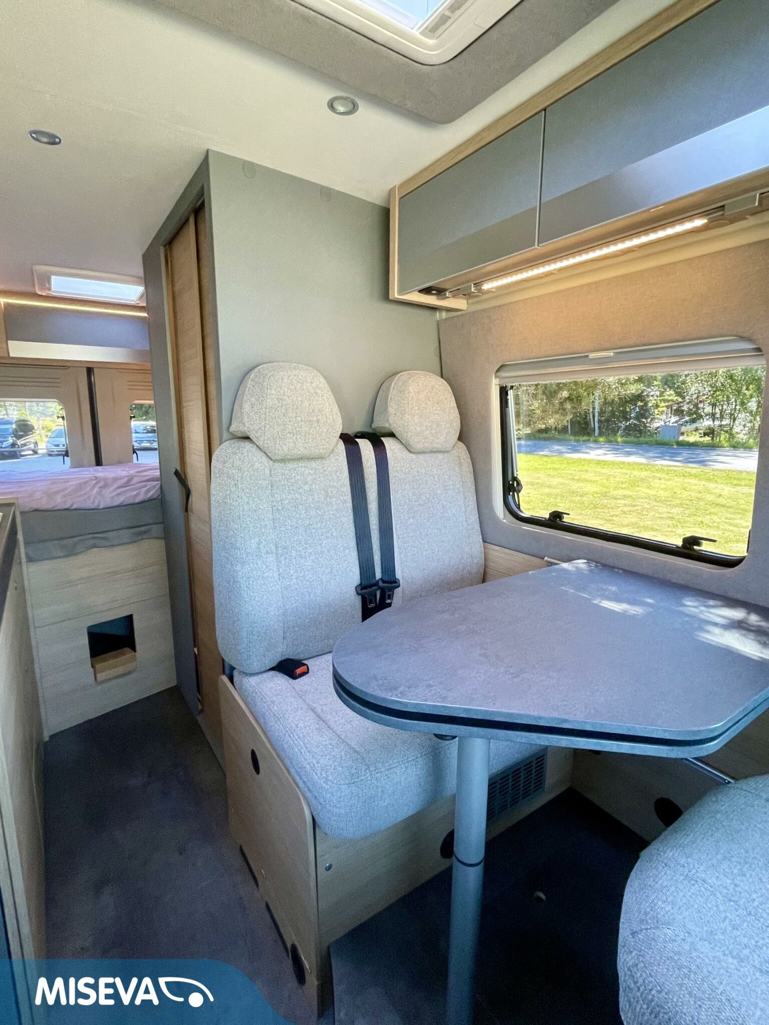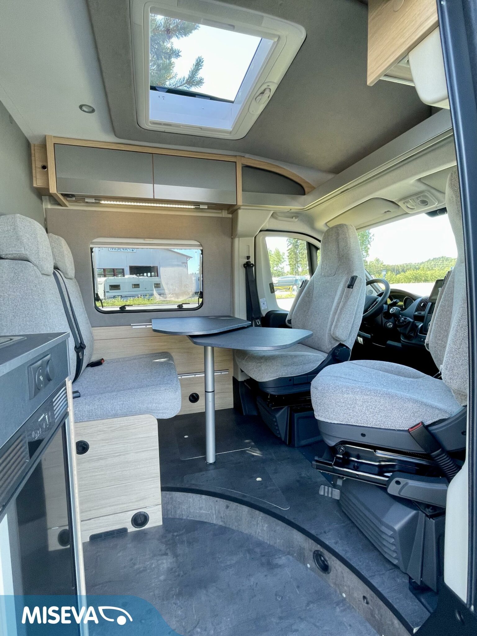 Auton etuosassa on pöytäryhmä kääntyvin etupenkein. Takaosasta löytyy parivuode. Parivuoteen alla on iso tavaratila.