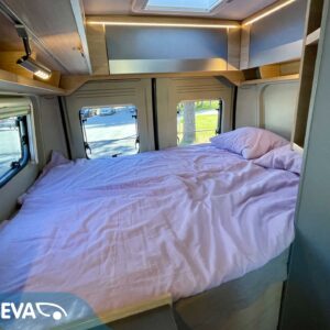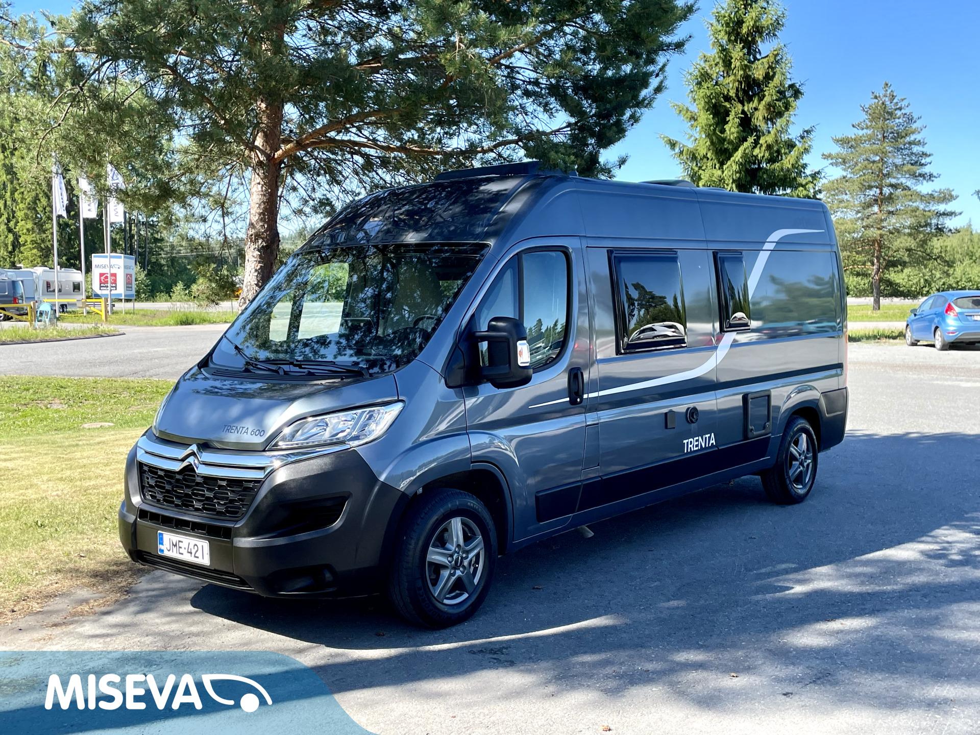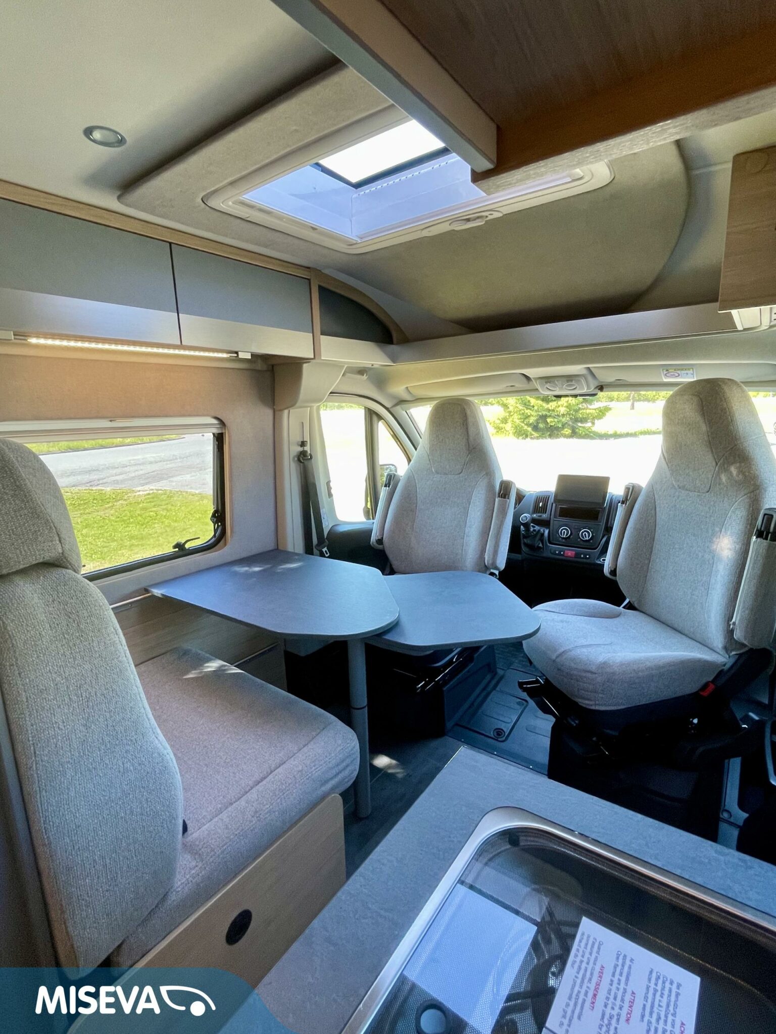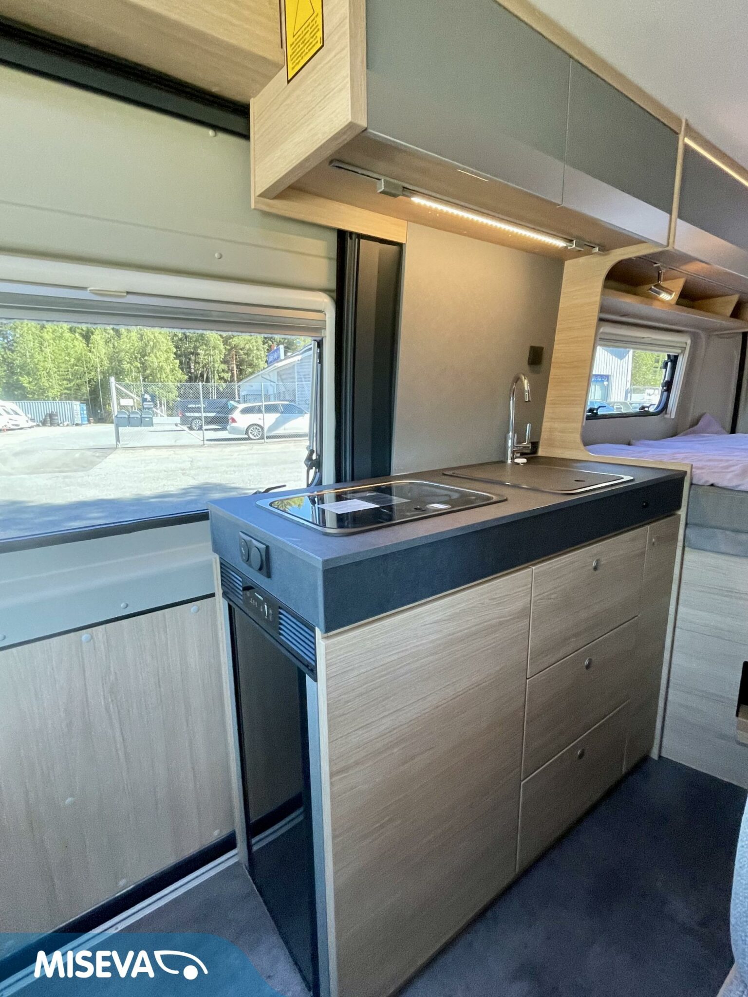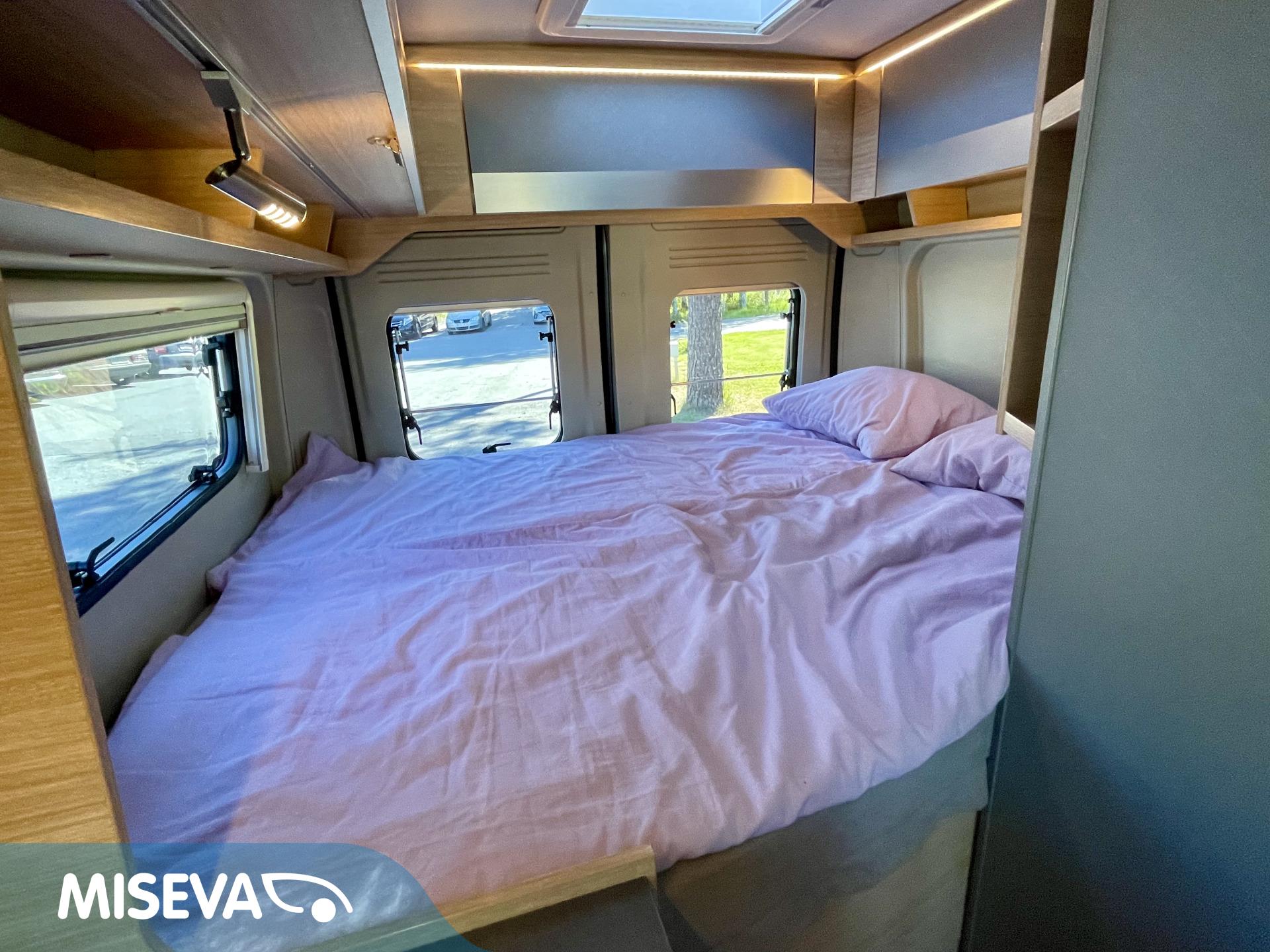 Auton etuosassa on pöytäryhmä kääntyvin etupenkein. Takaosasta löytyy parivuode. Parivuoteen alla on iso tavaratila.