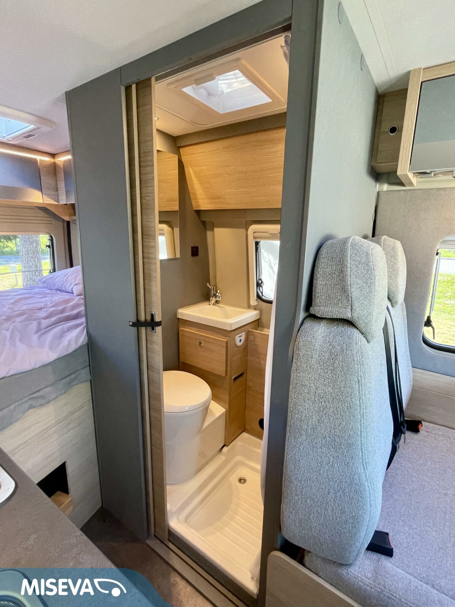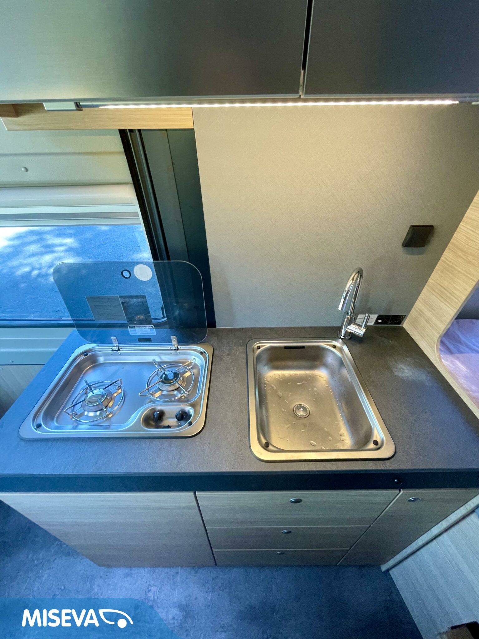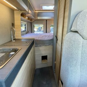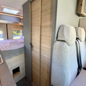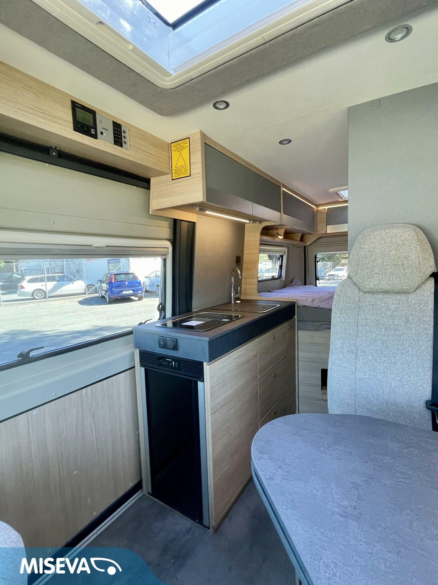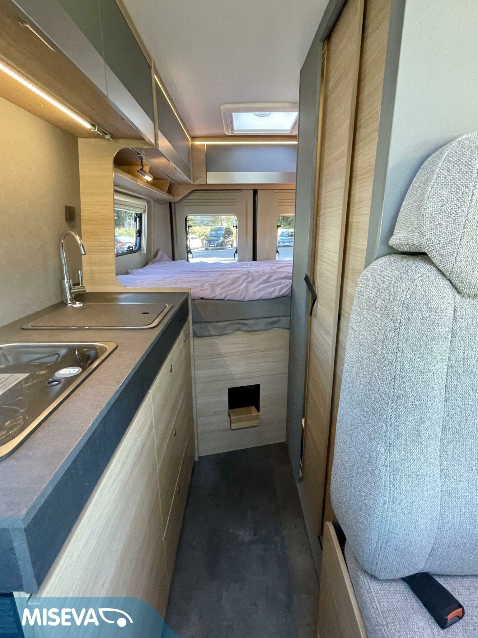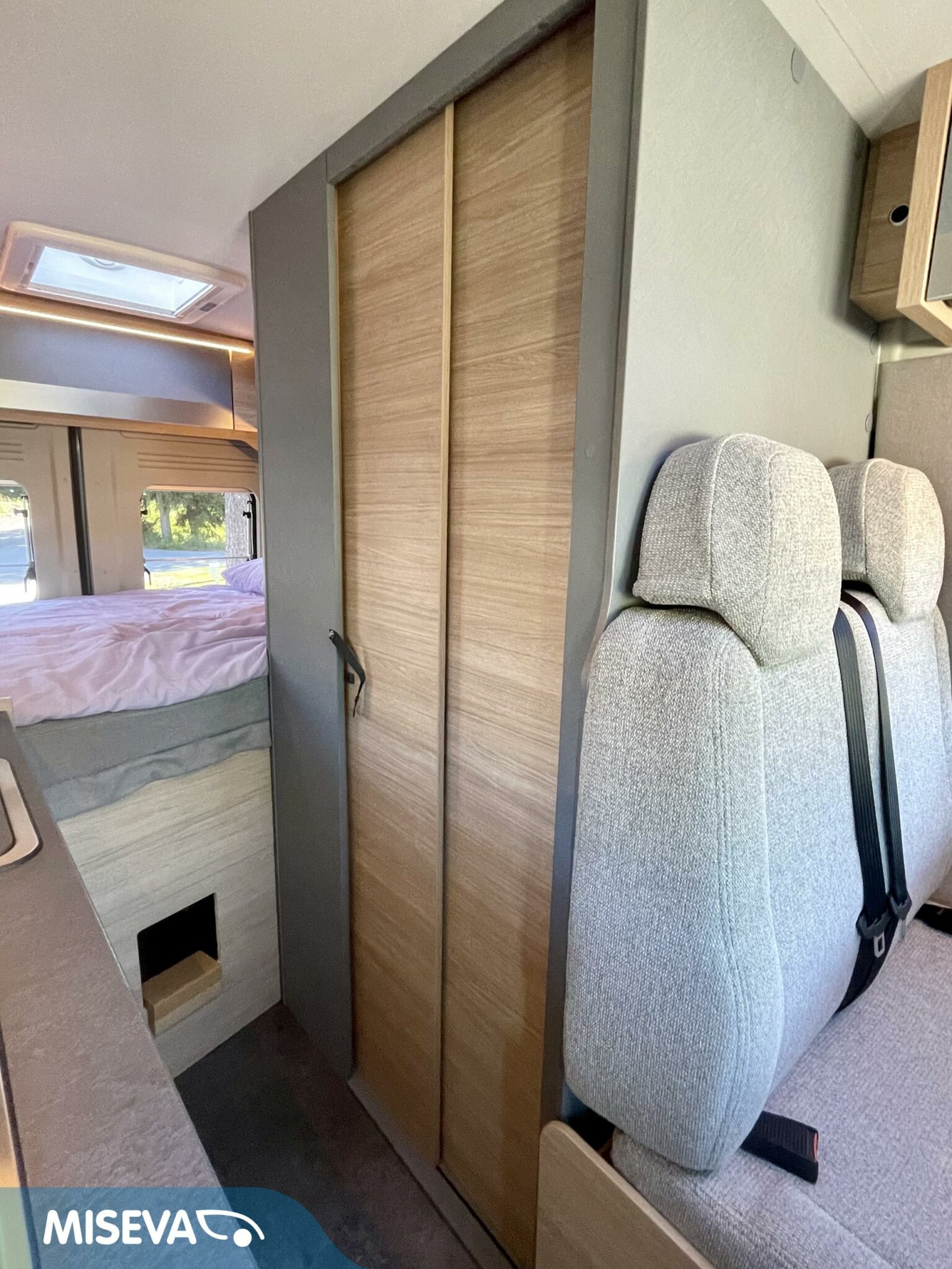 Auton etuosassa on pöytäryhmä kääntyvin etupenkein. Takaosasta löytyy parivuode. Parivuoteen alla on iso tavaratila.