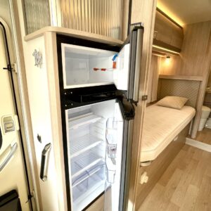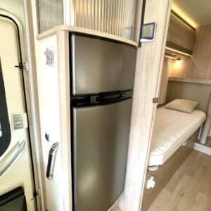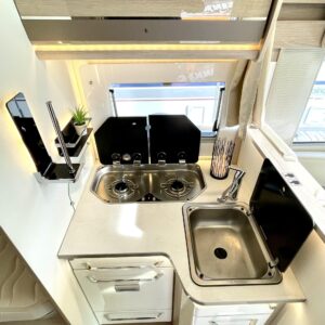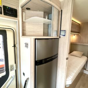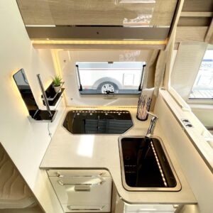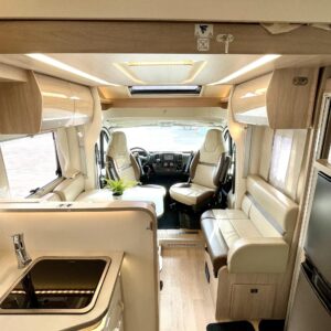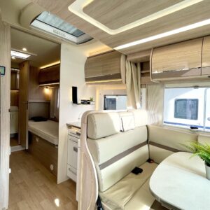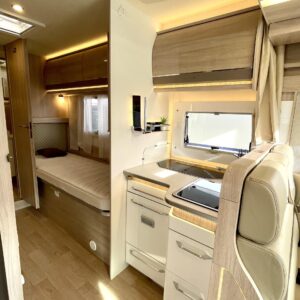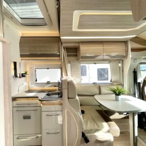 Moderni L-keittiö sisältää kolmipolttimisen kaasulieden, vesipisteen lavuaarilla, liesituulettimen ja kokkikolmoen selän takana majailee iso kolmitoimijääkaappi erillisellä pakastinosalla. Jääkaappi toimii tarvittaessa ajon aikana 12V- sähköllä tai kaasulla, paikallaan ollessa 230V- maasähkö käy myös. Olohuoneen ja keittiön suuret kattoluukut antavat reilusti luonnonvaloa, tämä yhdistettynä vaaleisiin pintoihin tekee sisustasta erittäin avaran ja silmälle rauhallisen.