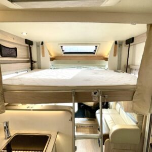 Alden nestekeskuslämmitys, erillisvuoteet, Lazerin lisäkaukovalot, kotelomarkiisi, automaattinen pullonvaihtaja, polkupyöräteline ja sähköinen nostovuode. Siinäpä muutamia varusteita joilla tämä yksilö on varustettu.
