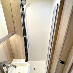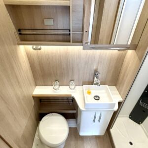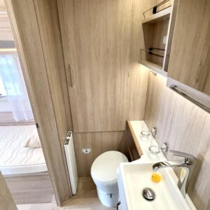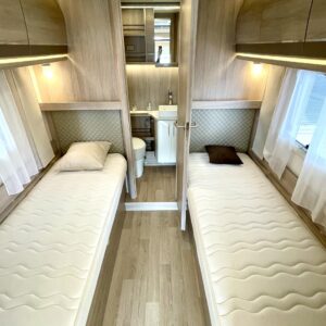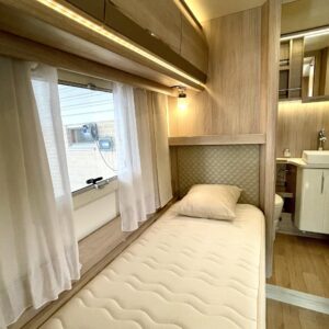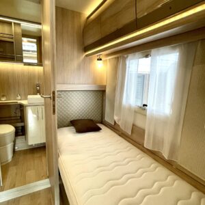 Pitkät erillisvuoteet sijaitsevat käytävän molemmin puolin, makuutila on eristettävissä omalla väliovellaan rauhalliseksi lepotilaksi. Käytävän päässä sijaitsee suuri ja avara wc/suihkutila, jossa moderni desing paiskaa hienosti kättä käytännöllisyyden kanssa. Maljamaisessa lavuaarissa päivän pölyt irtoavat naamasta vaivattomasti, tulpattuna malja toimii mainiosti vaikka kylpyankan pihalampena perheen pienempien (ja miksei isompienkin) riemuksi. Epäsuora luonnollisen sävyinen led-valaistus helpottaa iltajuhliin valmistautuvan juhlaväen pakkelointia ja suortuvien oikomista.