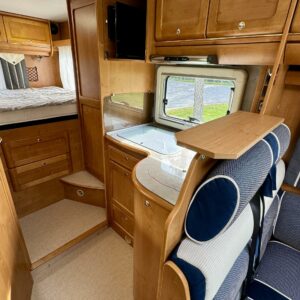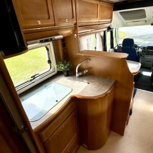 Keskeltä autoa löytyy keittiö, jonka varustukseen kuuluu ison jääkaappi- pakastimen lisäksi kaasu- uuni ja liesituuletin.