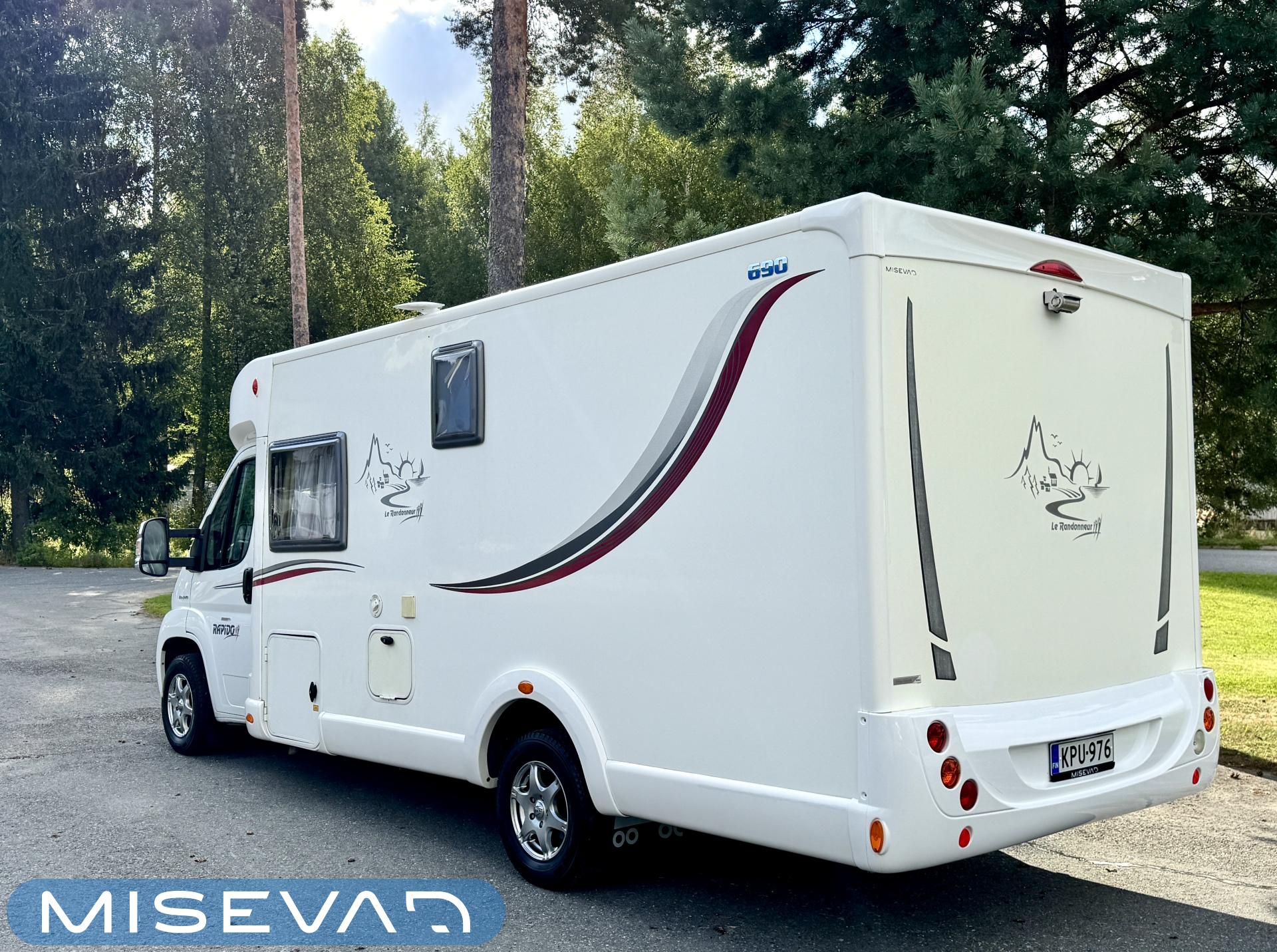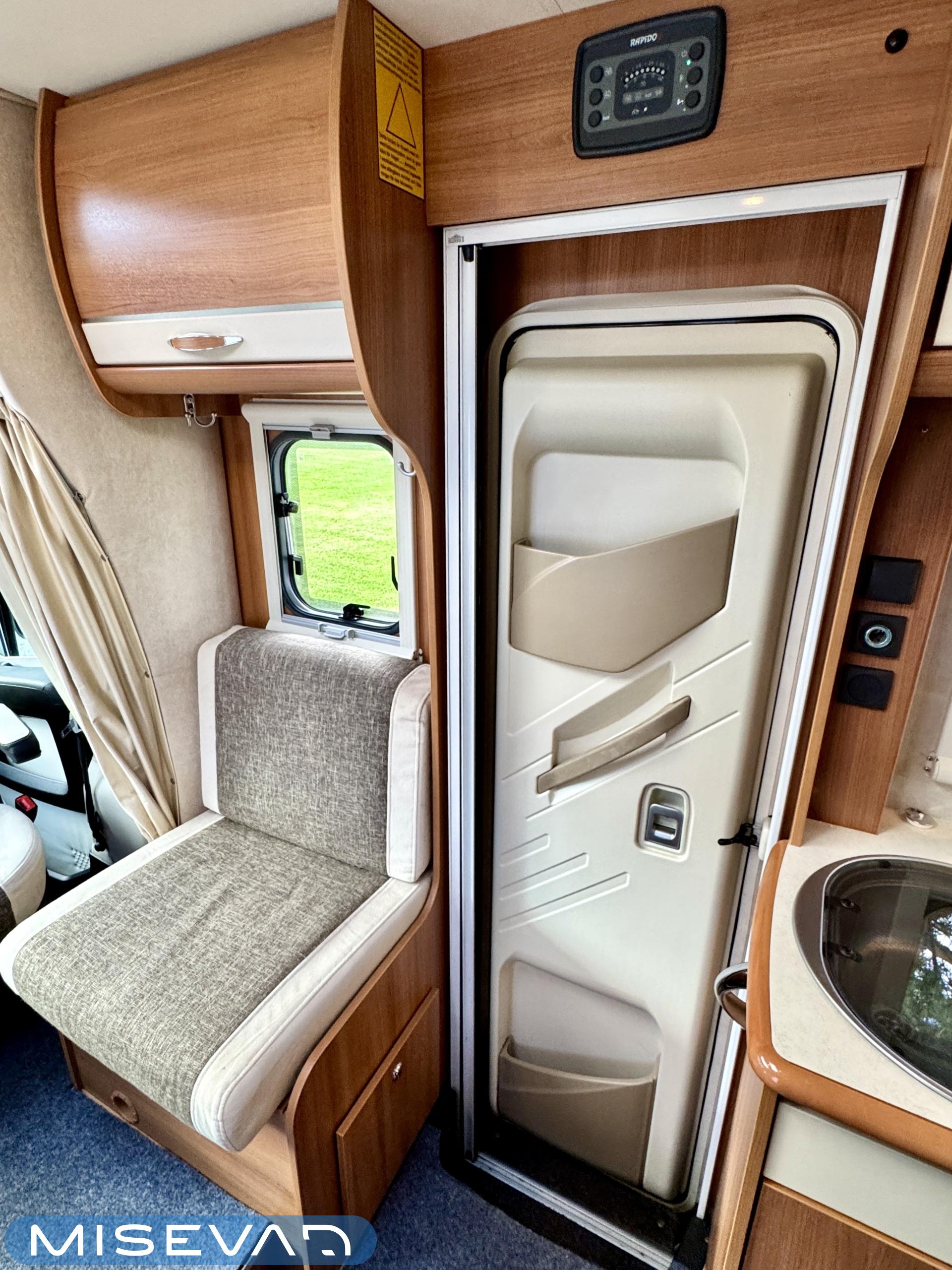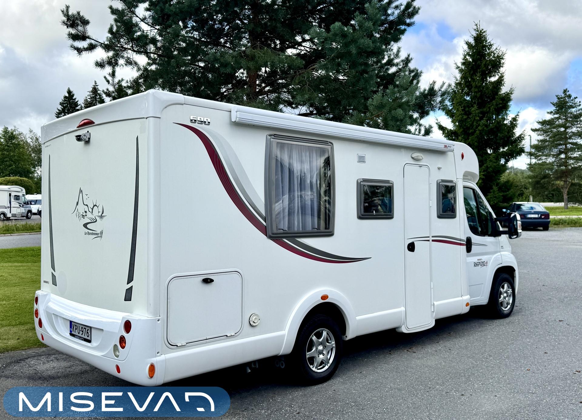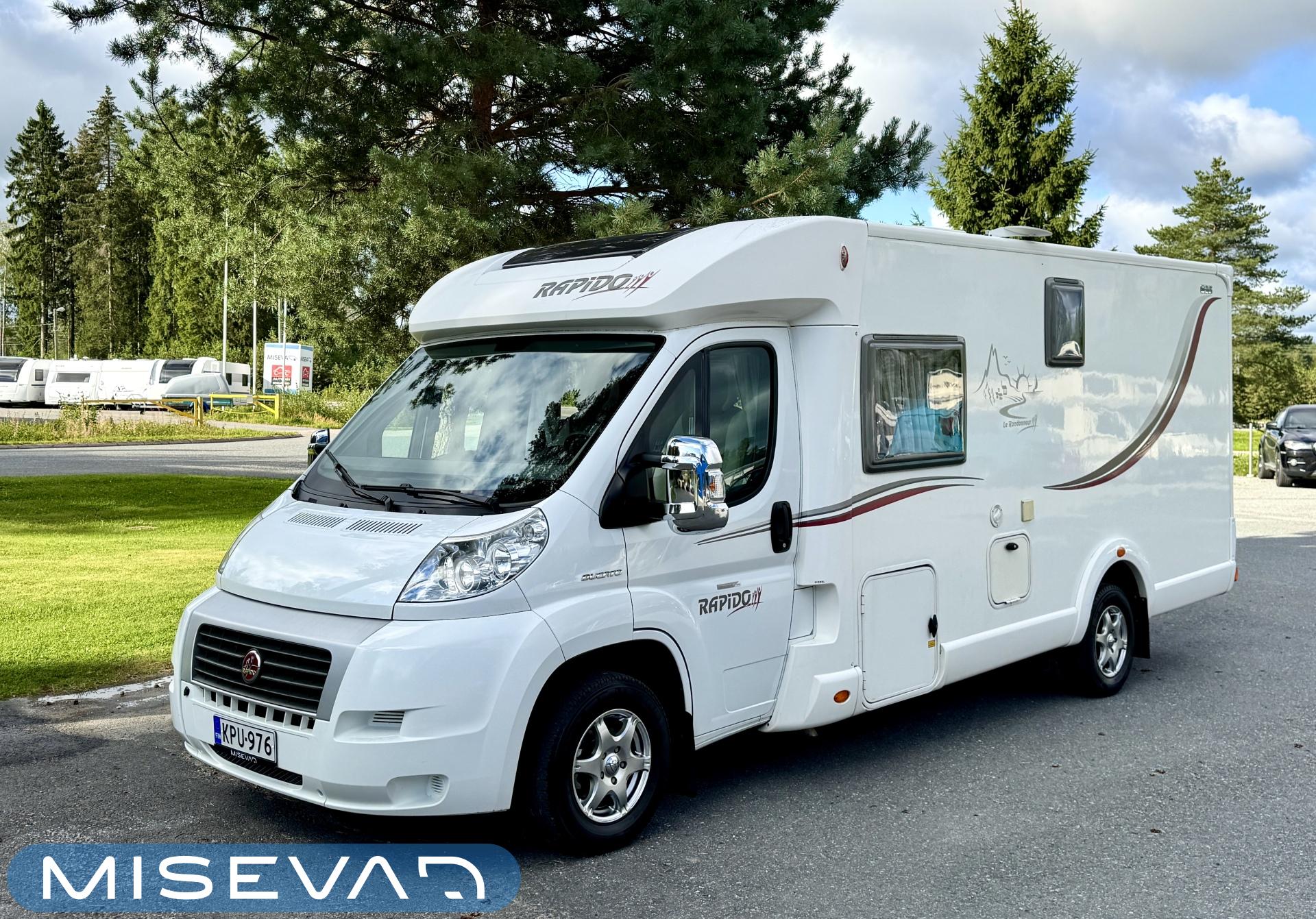 Rapidot erottuvat yleensä edukseen ja monesti sisätilat on mietitty käytäntöä silmällä pitäen. Tämän auton ehdoton valtti on saarekesänky. Ei tarvitse kömpiä kenenkään yli tai ali, sänkyyn mennessä. Toinen erikoisuus on takana sijaitseva suihku. Tilan voi halutessaan käyttää myös vaatekaappina. Wc sijaitsee auton keskiosassa, omana huoneenaan. Keittiöstä löytyy tarvittava kaappitila padoille ja kattiloille. Vastapäätä keittiötä on iso jääkaappi erillisellä pakastimella. Ruokaa mahtuu kyytiin matkustajien lisäksi kivasti. Ja iso, erillinen pakastin on mukava kaveri syksyn sienimetsille. Etupenkit kääntyvät ruokailupöydän ympärille ja tilaan mahtuu helposti neljästä viiteen istujaa. Ruokapöytä muuntuu tarvittaessa myös sängyksi. Panoraama ikkuna tuo etuosaan valoa ja se on aurinkoinen lisä kokonaisuutta ajatellen. Kuumina päivinä toimii myös hyvin tuuletusikkunana. Yleisilme on siisti ja selvästi autoa on pidetty hyvänä omistajiensa toimesta. Olisiko tässä auto juuri sinulle?