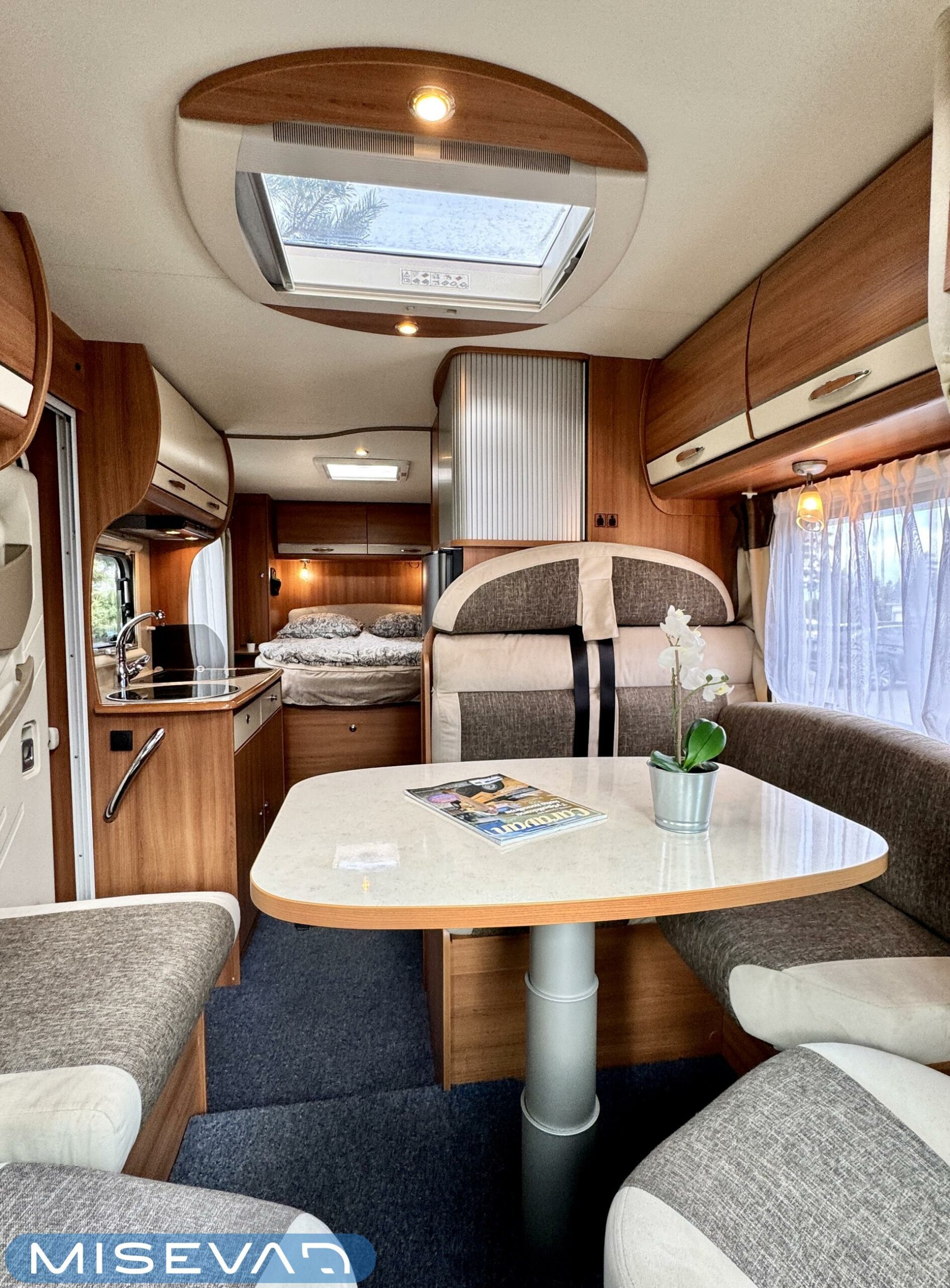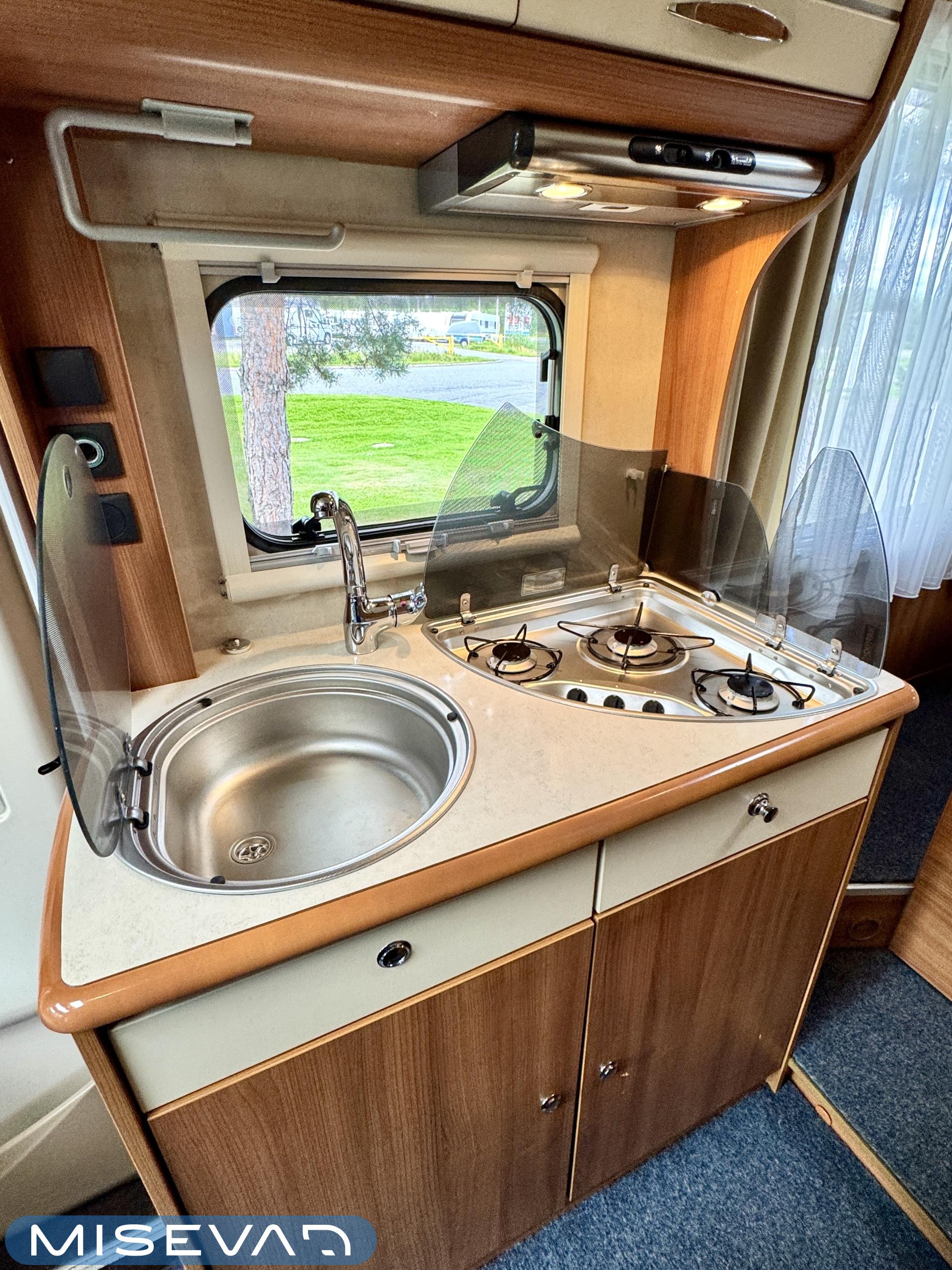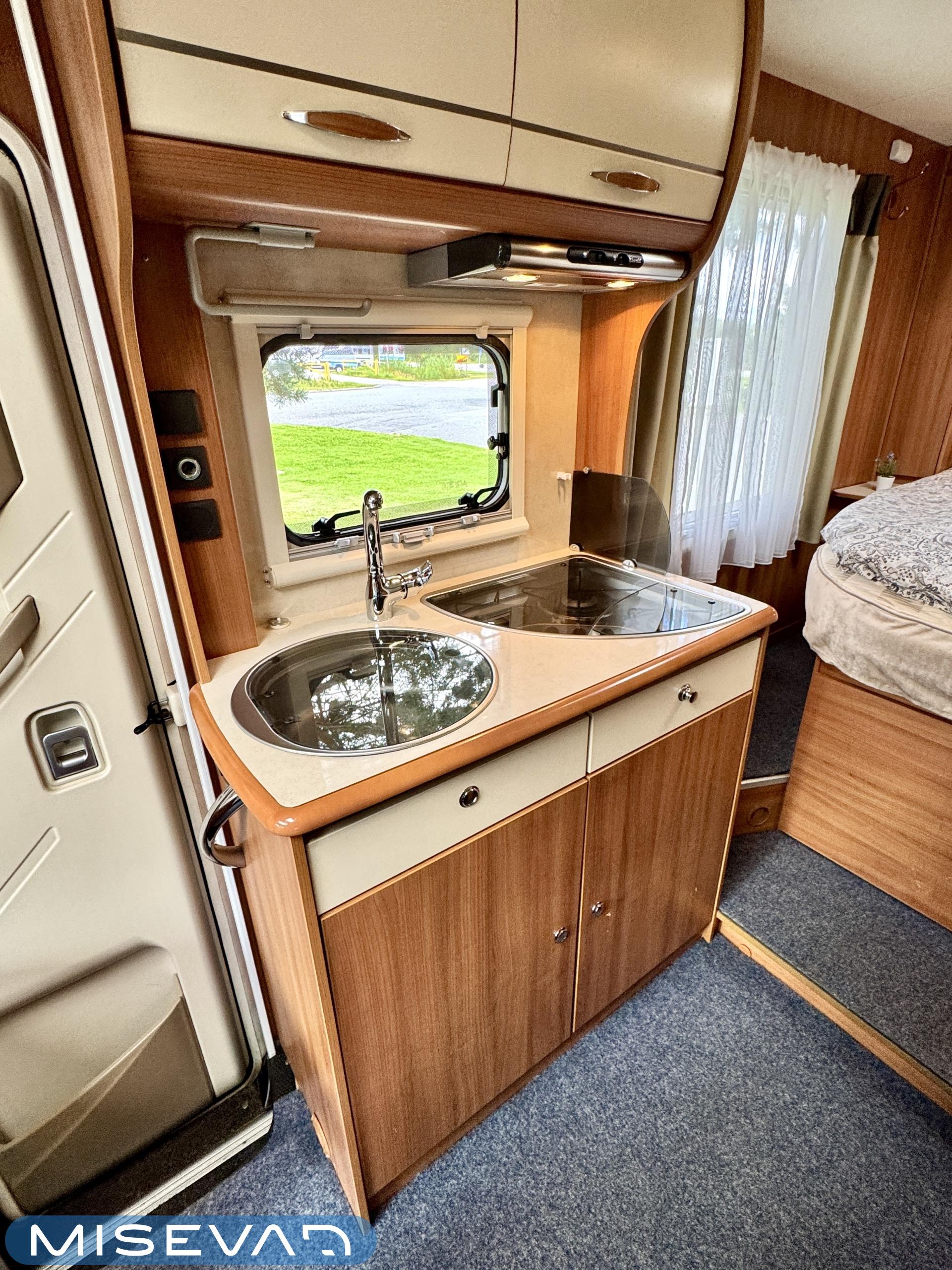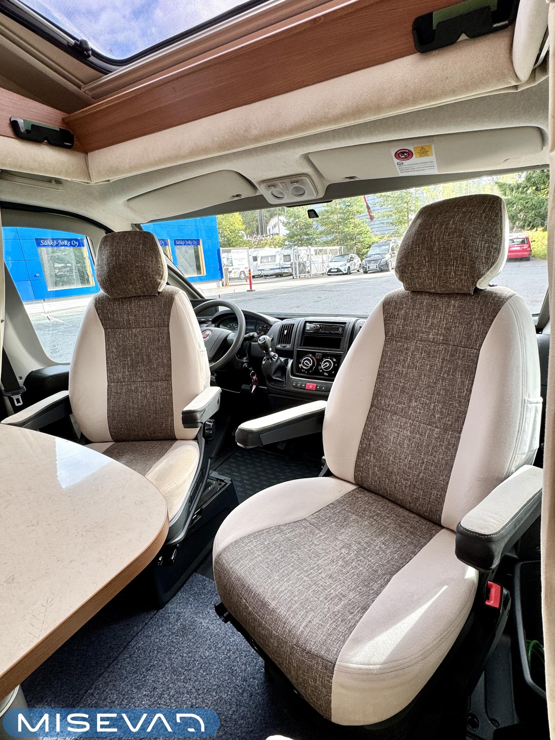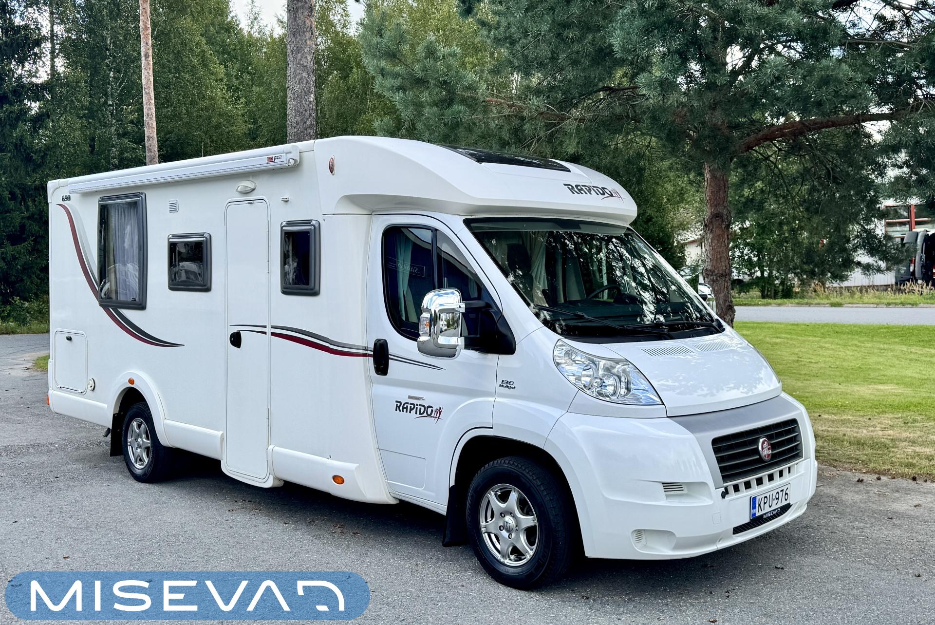 Rapidot erottuvat yleensä edukseen ja monesti sisätilat on mietitty käytäntöä silmällä pitäen. Tämän auton ehdoton valtti on saarekesänky. Ei tarvitse kömpiä kenenkään yli tai ali, sänkyyn mennessä. Toinen erikoisuus on takana sijaitseva suihku. Tilan voi halutessaan käyttää myös vaatekaappina. Wc sijaitsee auton keskiosassa, omana huoneenaan. Keittiöstä löytyy tarvittava kaappitila padoille ja kattiloille. Vastapäätä keittiötä on iso jääkaappi erillisellä pakastimella. Ruokaa mahtuu kyytiin matkustajien lisäksi kivasti. Ja iso, erillinen pakastin on mukava kaveri syksyn sienimetsille. Etupenkit kääntyvät ruokailupöydän ympärille ja tilaan mahtuu helposti neljästä viiteen istujaa. Ruokapöytä muuntuu tarvittaessa myös sängyksi. Panoraama ikkuna tuo etuosaan valoa ja se on aurinkoinen lisä kokonaisuutta ajatellen. Kuumina päivinä toimii myös hyvin tuuletusikkunana. Yleisilme on siisti ja selvästi autoa on pidetty hyvänä omistajiensa toimesta. Olisiko tässä auto juuri sinulle?