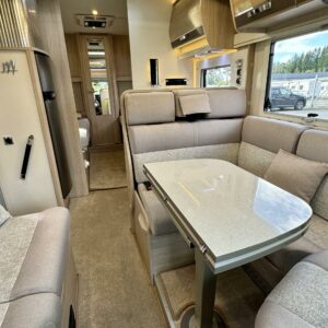 Auton etuosassa on tyylikkäästi verhoiltu L- istuinryhmä. Sivusohvan ja kääntyvien etuistuinten ansiosta pöydän ympärille mahtuu kivasti 7 -8 henkeä. Pöytäryhmän päälle saa tarvittaessa laskettua sähköavusteisesti nostovuoteen.