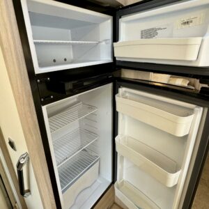 Keskemmältä autoa löytyy keittiö isolla jääkaappi- pakastimella ja liesituulettimella varustettuna.