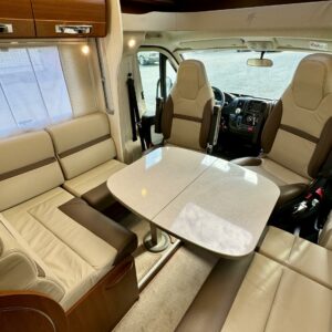 Auton etuosassa on tyylikkäästi verhoiltu L- istuinryhmä. Sivusohvan ja kääntyvien etuistuinten ansiosta pöydän ympärille mahtuu kivasti 7 -8 henkeä. Pöytäryhmän päälle saa tarvittaessa laskettua sähköavusteisesti nostovuoteen.
