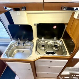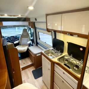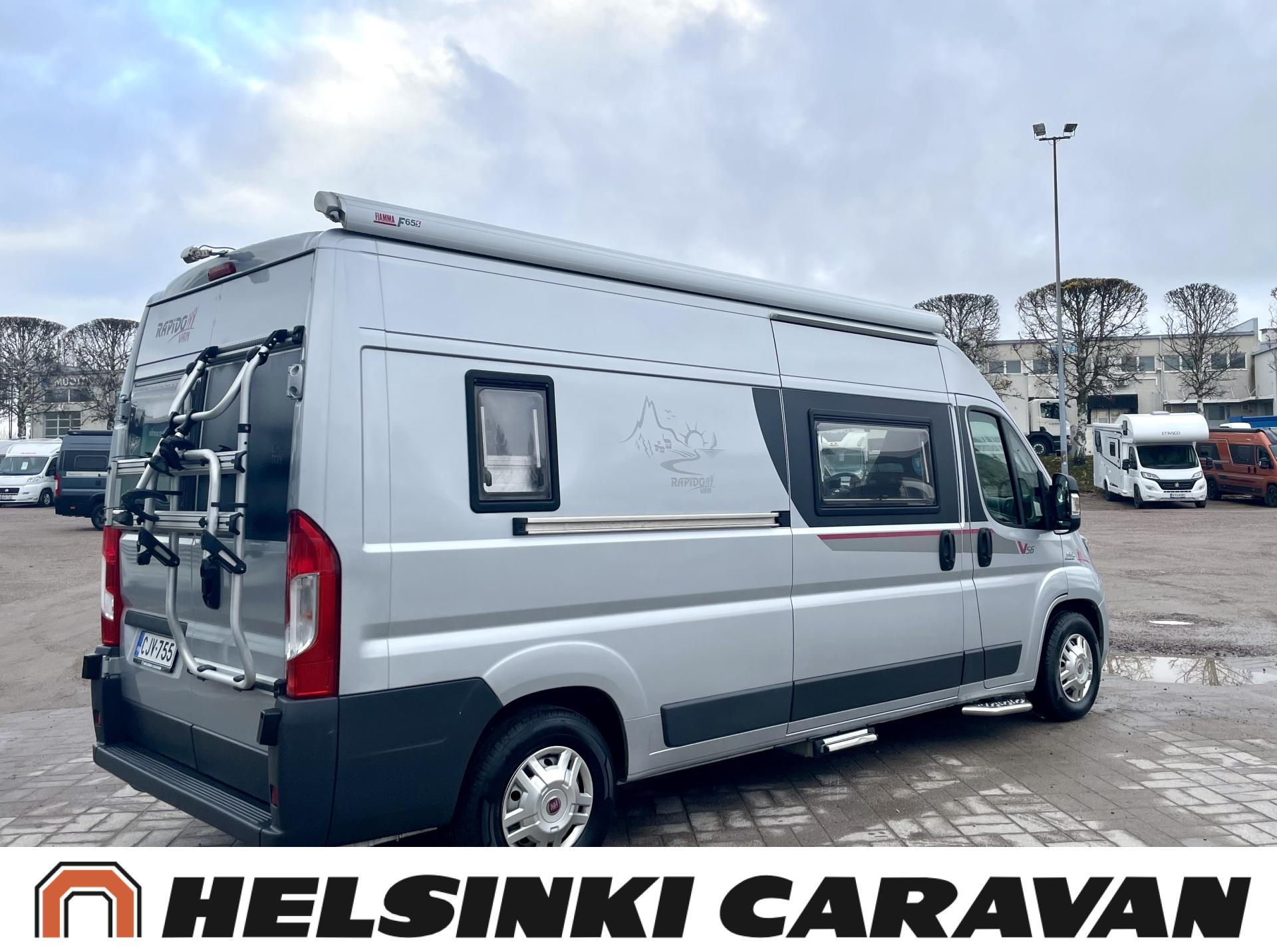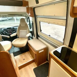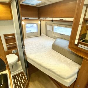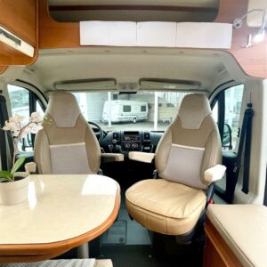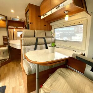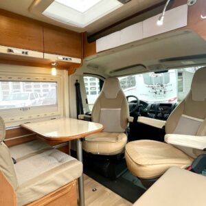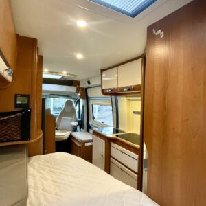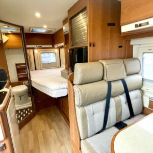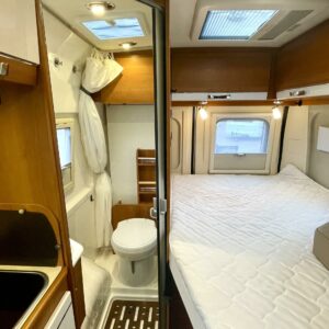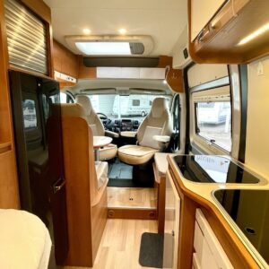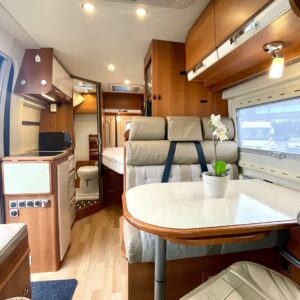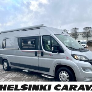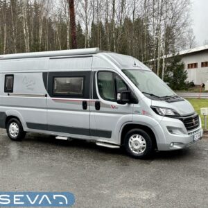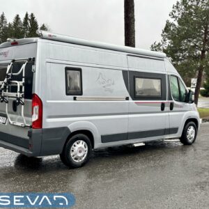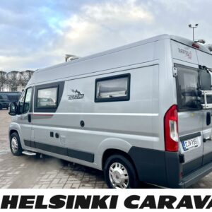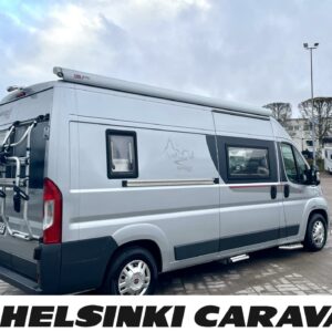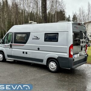 Hieman erilaisella pohjaratkaisulla oleva retkiauto. Voisiko tätä kutsua jopa ”hybridi”malliseksi, kun ”retkiauton” kuoriin on aseteltu melko yleisesti käytössä oleva ”matkailuauton” pohjaratkaisu. Eli auton takaosassa on pitkittäinen parivuode, sekä kylppäritilat. Keskelle on asemoitu keittiö. Etuosassa on pöytäryhmä minne yhdistyvät kääntyvät ohjaamon penkit, sekä sivupenkki. Tämä on selkeästi avoimemman oloinen lattia-alaltaan, kun yleisemmin käytössä olevat retkiautojen pohjaratkaisut. Huomattavaa on myös jääkaapin todella toimiva sijoittelu ja kaappi on lisäksi tilavuudeltaan reilun kokoinen. Sisätilat lämpenee Trumaticin ilmakeskuslämmityksen avulla ja verkkovirrassa ollessa lisäpuhtia saadaan sähkövastuksista (sähköpatruuna). Oikein mukava lisävaruste on myös sähköinen lattianlämmitys. Ohjaamovarusteina mm. ilmastointi, vakionopeudensäädin, sekä peruutuskamera. Pihan puolen varusteista manittakoon markiisi, sekä pyöräteline. Tule tutustumaan, näitä on verrattain harvoin tarjolla.