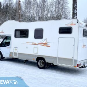 Tilava, reilusti yli 7 m pitkä alkoviauto jossa mahtuu mukavasti kuusikin henkeä liikkumaan ja majoittumaan. Vakaan matkanteon takeena Transitin paripyöräalusta.
