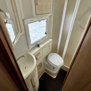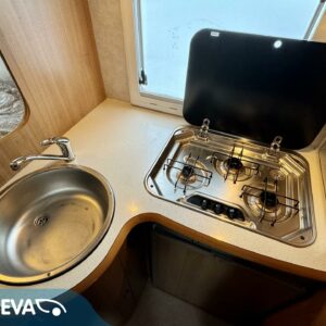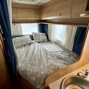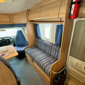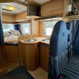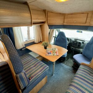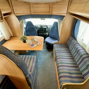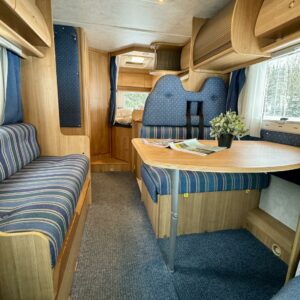 Auton etuosasta löytyy viihtyisä istuinryhmä pitkällä sivusohvalla. Pöydän ympärille mahtuu mukavasti 6 henkeä seuraavaa matkakohdetta suunnittelemaan. Pöytäryhmästä saa tarvittaessa sijattua toisen parivuoteen.