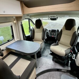 Auton etuosassa on viihtyisä ja valoisa istuinryhmä neljälle.
