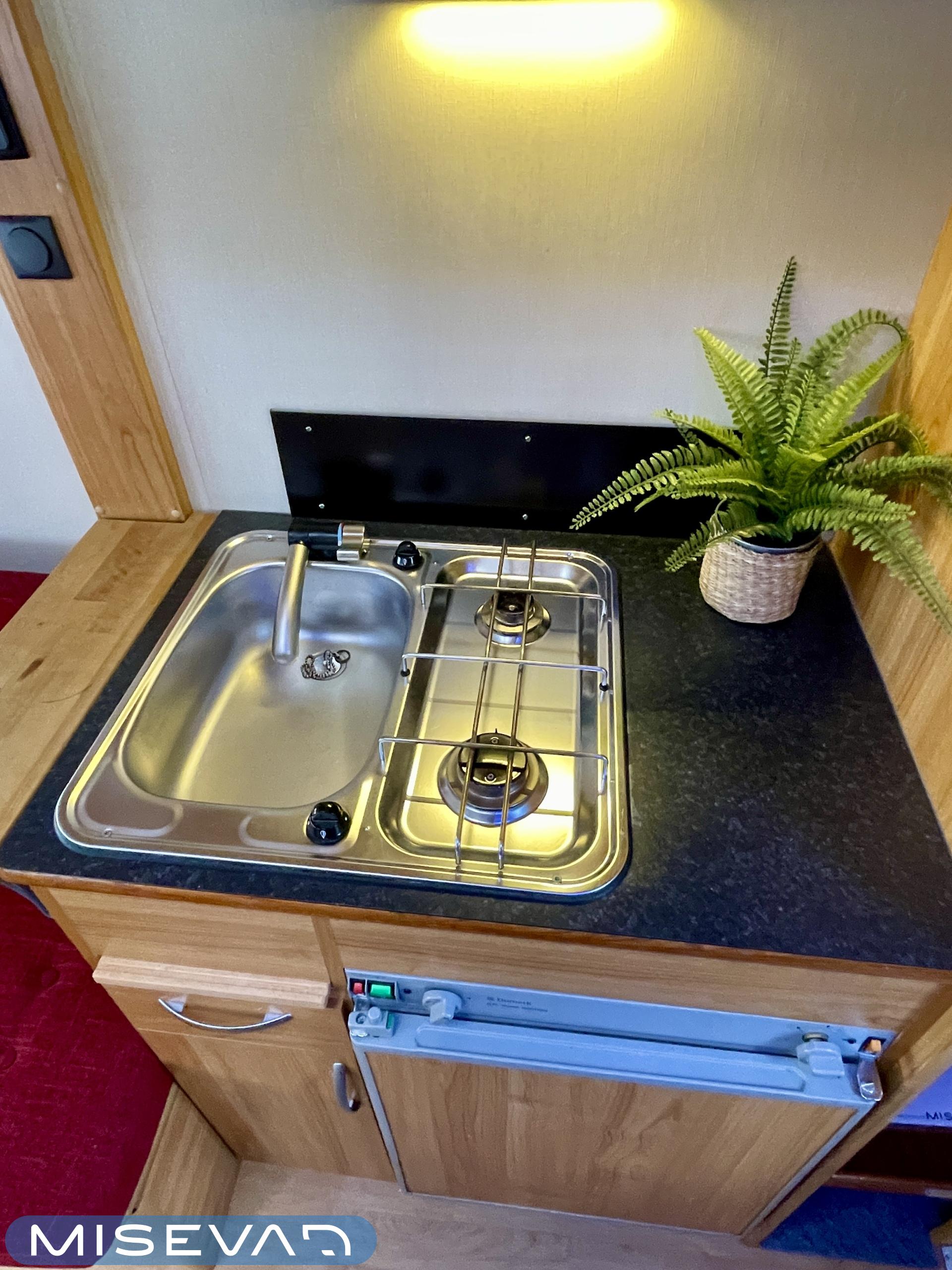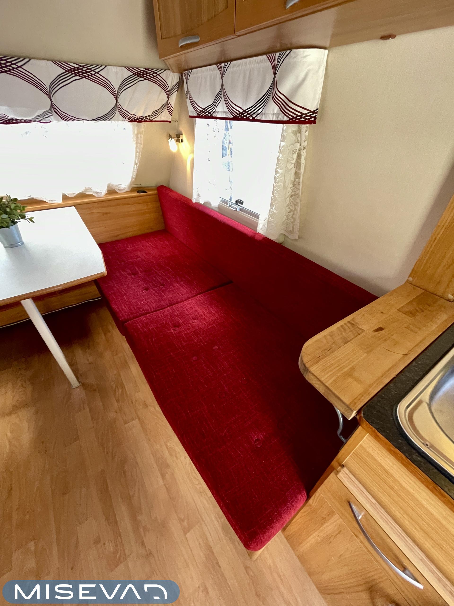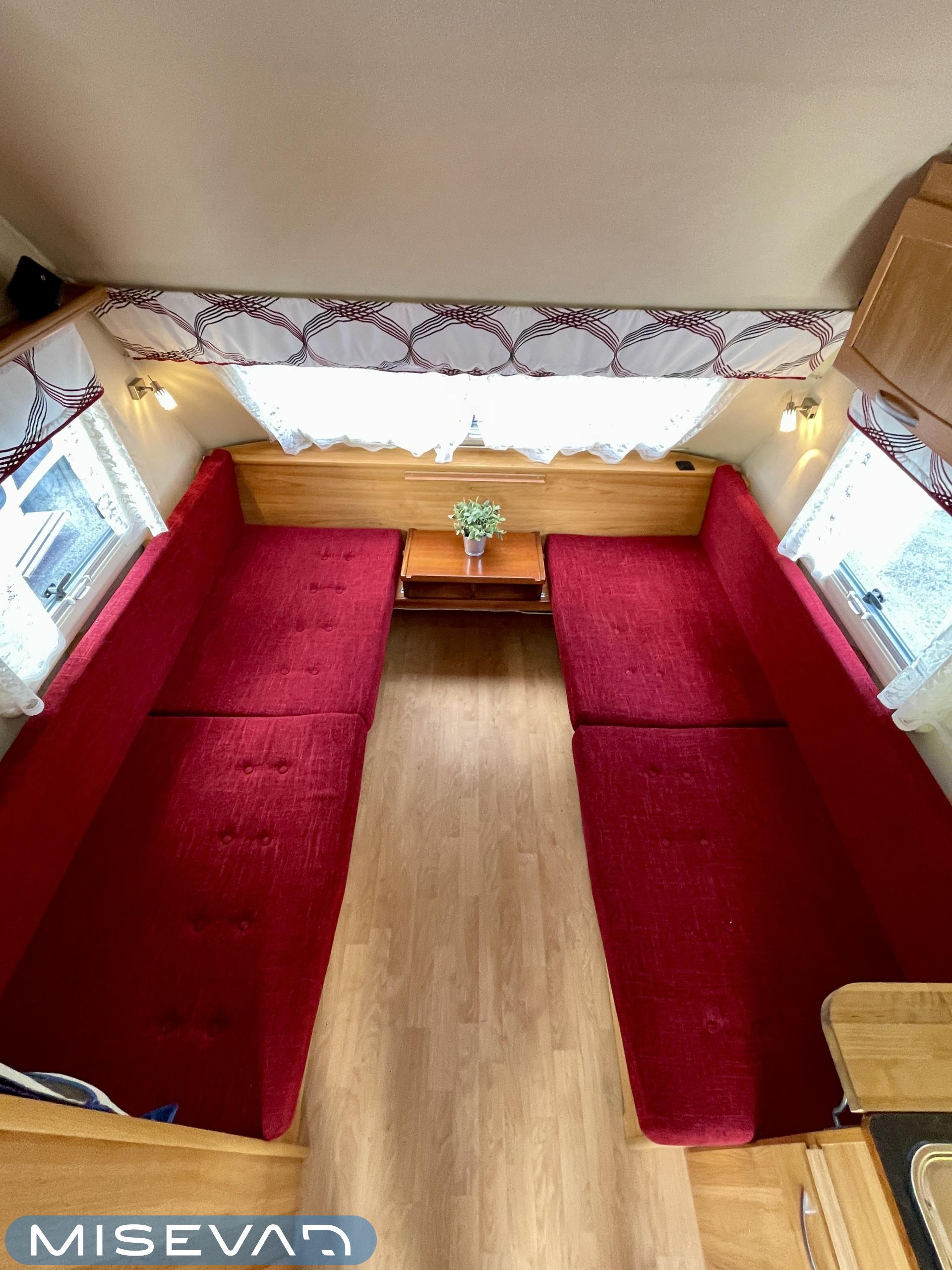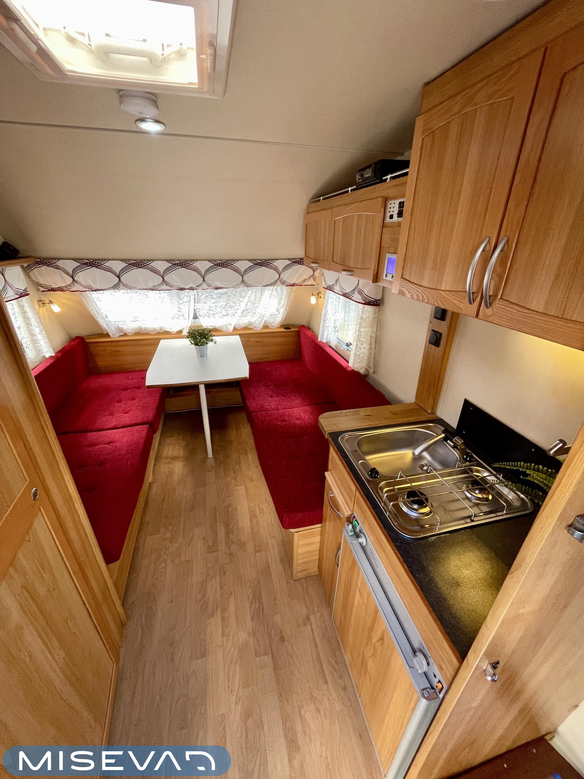 Lämminvesiboileri, Alde- nestekiertoinen keskuslämmitys, Alde, Sähköpatruuna, Jääkaappi, Kasetti WC, Kasettiverhot, Kattoluukku, Liesi, Nestekiertolämmitys, Pakastelokero, Pesuallas, Radio, TV-antenni tai lautasantenni, Tukijalat, televisioteline