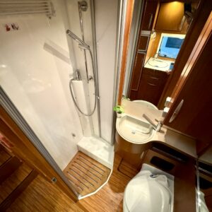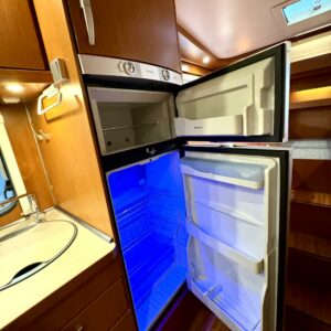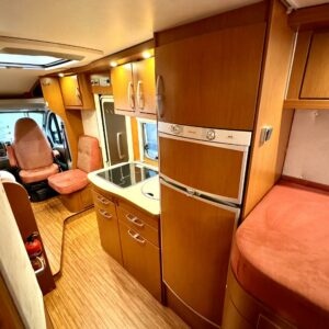 Edessä tilava pöytäryhmä ja keskellä ajoneuvoa tilava keittiö, josta löytyy erillinen jääkaappi ja pakastin sekä tilava saniteettitila josta löytyy myös suihkumahdollisuus. Tästä oiva vaihtoehto pariskunnille tai yksin matkaaville.