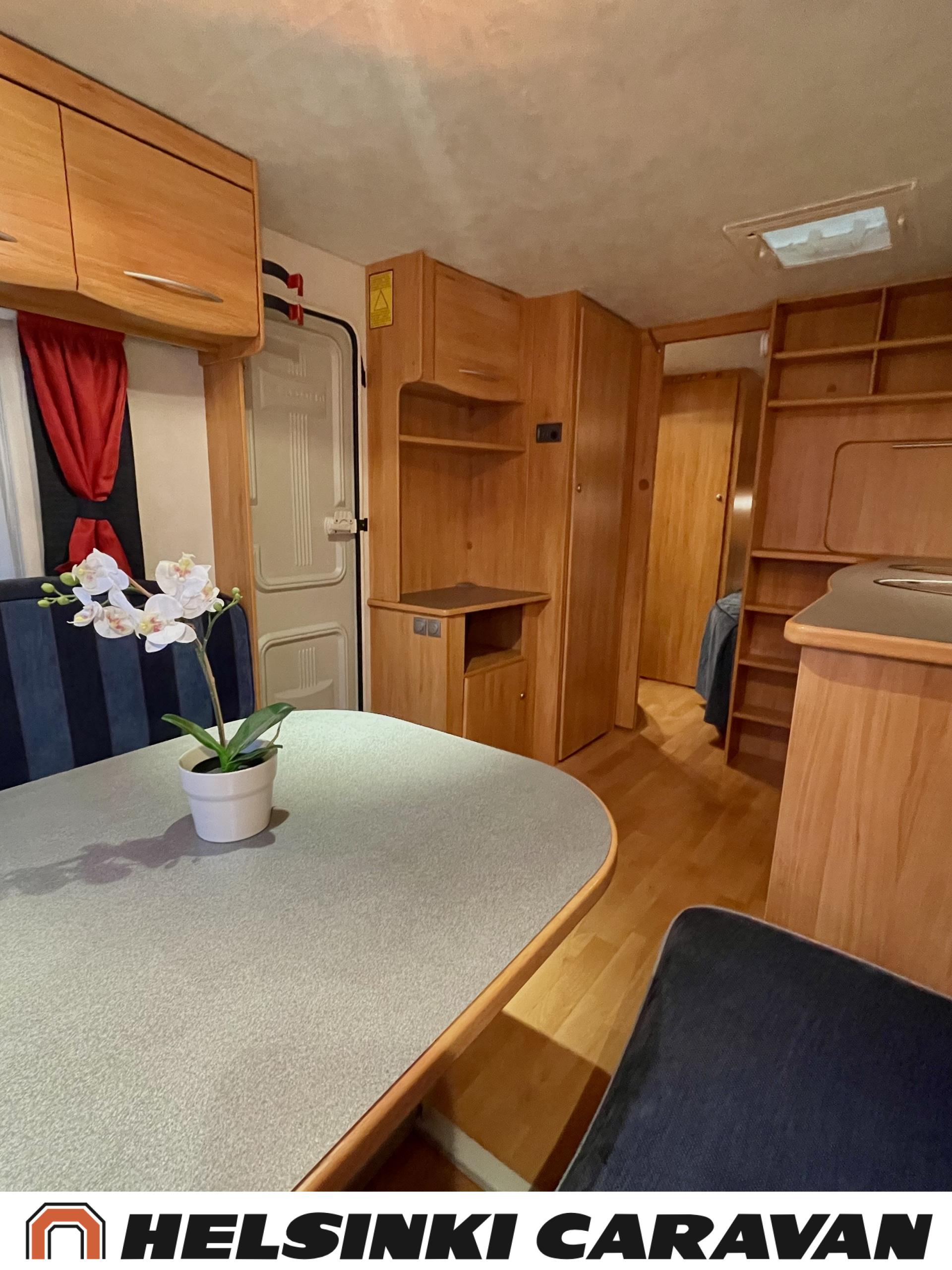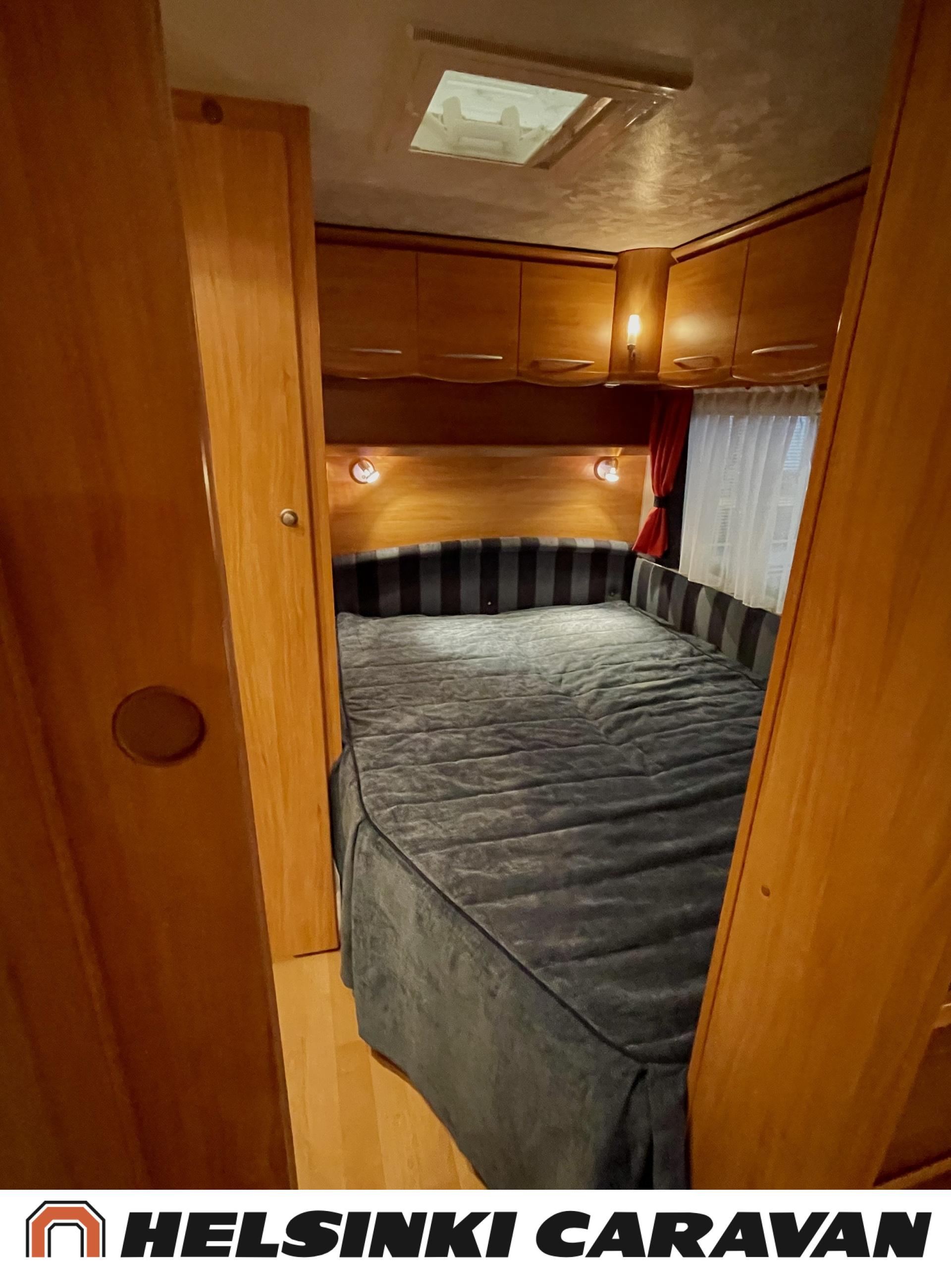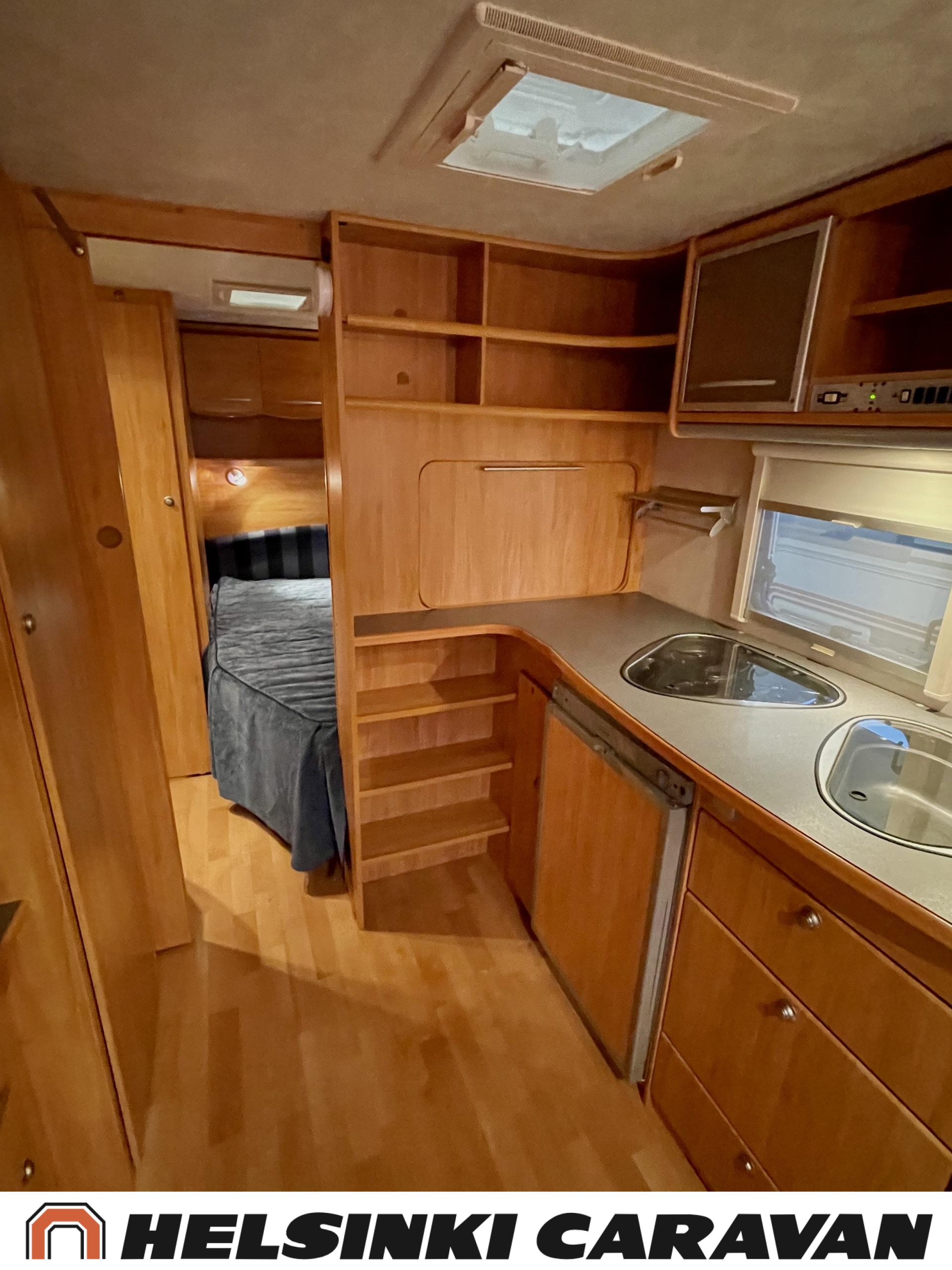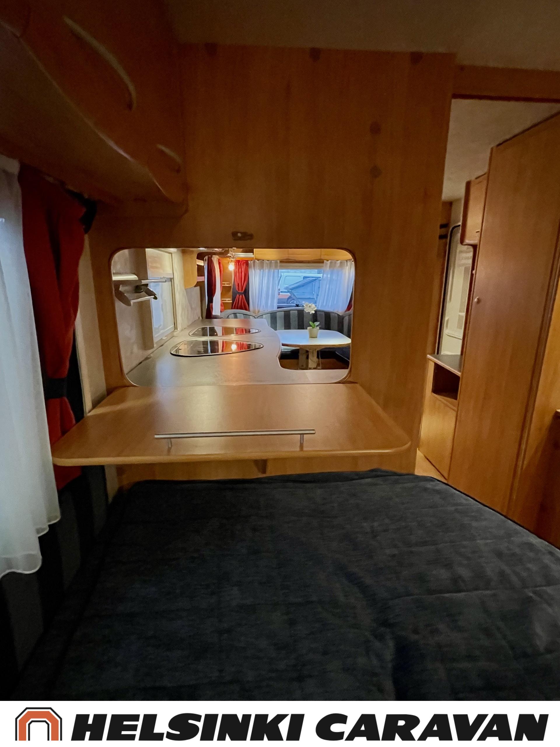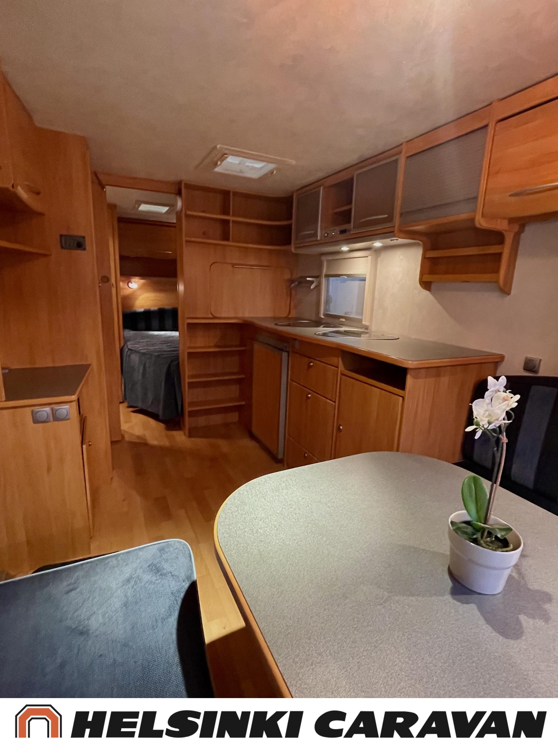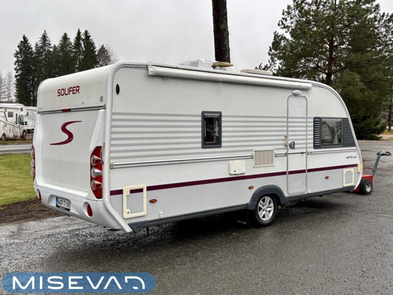 Ehdottomasti talvivaunu genreen laskettava tapaus! Pohjolan oloihin suunniteltu ja valmistettu ”Solikka”. Lämmitysjärjestelmänä Alden 6 kilowattinen (kaasulla) nestekiertolämmitys ja näissähän on myös aina lattiakierto yhdistettynä järjestelmään. Roikan päässä saadaan 3 kilowattia lisää sähkövastuksista, joten eiköhän ala riittämään keliin kun keliin. Muutenkin mukavasti varusteltu, eli löytyy vaununsiirtolaite, ilmastointi ja kaasu-uuni. Vaunun takaosasta löytyy makkari missä on pitkittäinen parivuode. Välittömässä läheisyydessä on kylppäritilat, sekä pieni työpöytä syvennys. Keskelle on asemoitu keittiö missä on varusteina mm. kaasu-uuni, sekä iso jääkappii ihanteelliselle käyttökorkeudelle sijoitettuna. Etuosaa hallitsee U-ryhmä mistä saadaan tarvittaessa vuode kahdelle henkilölle. Mainittavan arvoinen asia vaunun toiminnallisuuden kannalta on heti käyntioven läheisyydessä oleva vaatesyvennys, on kyllä kätevä heittää tähän sisään tullessa ulkovaatteet ja kengät eikä tarvitse alkaa niitä sullomaan johonkin vaunun vaatekaapeista. Vaunulla on ollut historiansa aikana vain yksi käyttäjäomistaja.