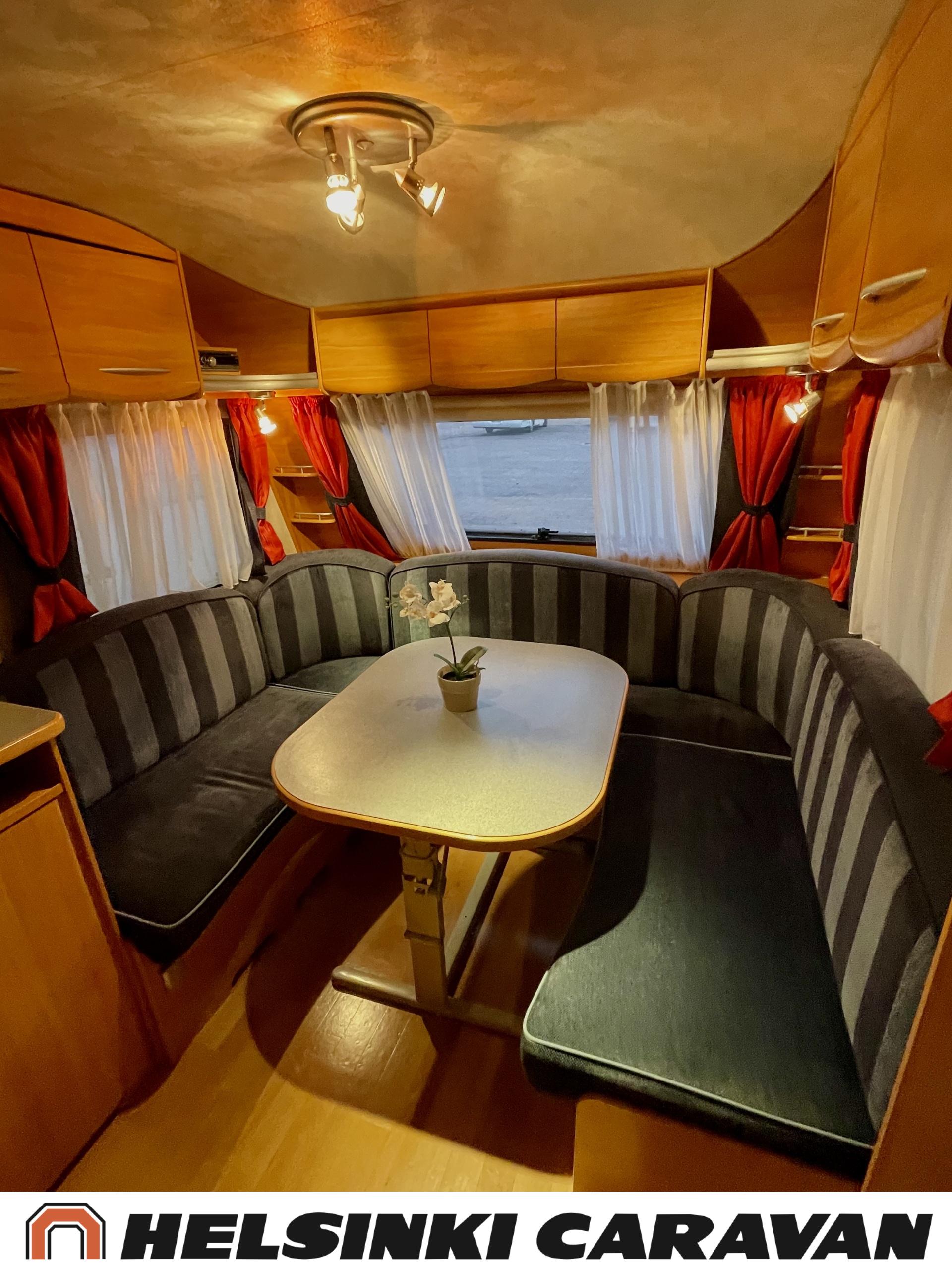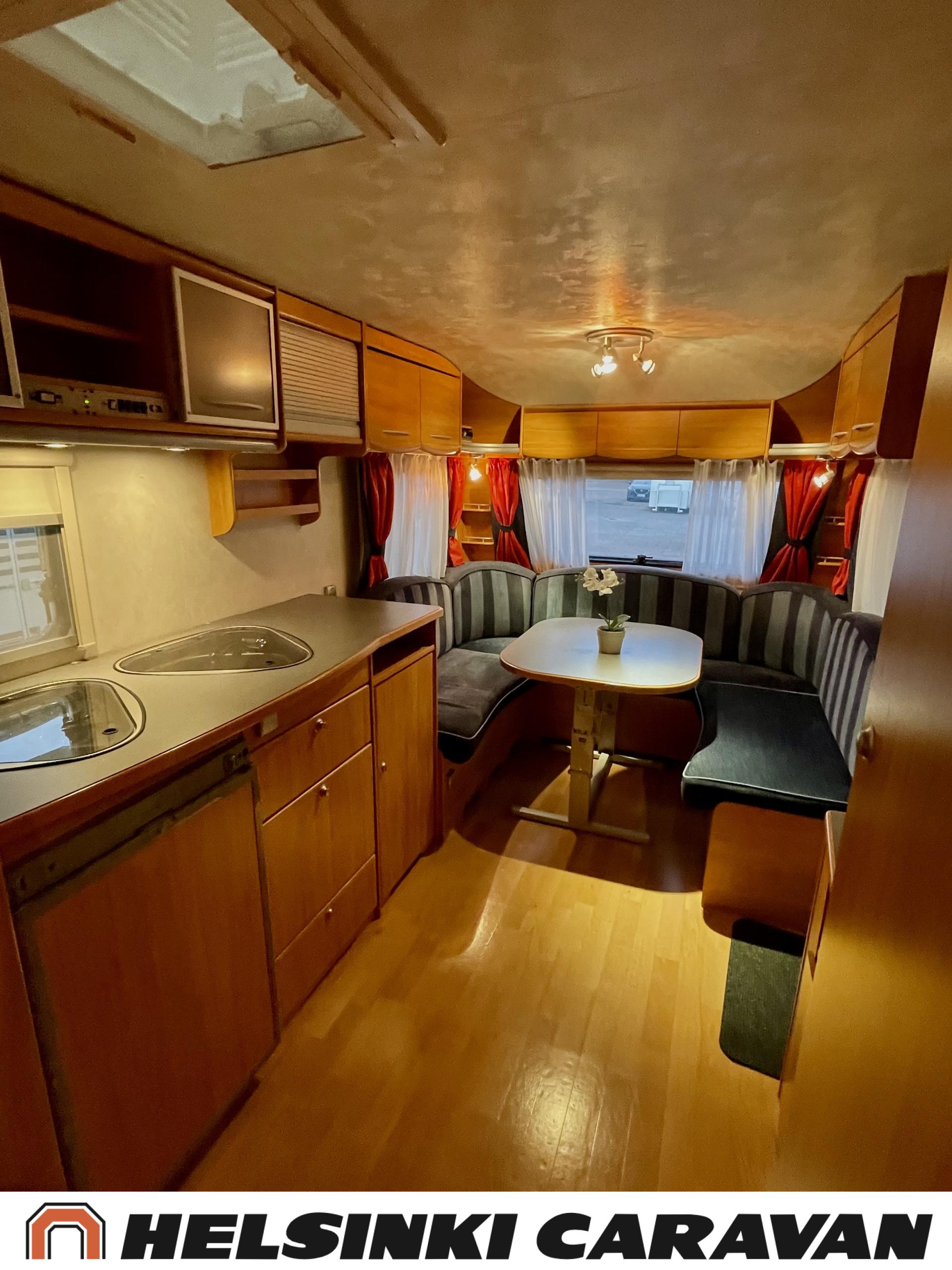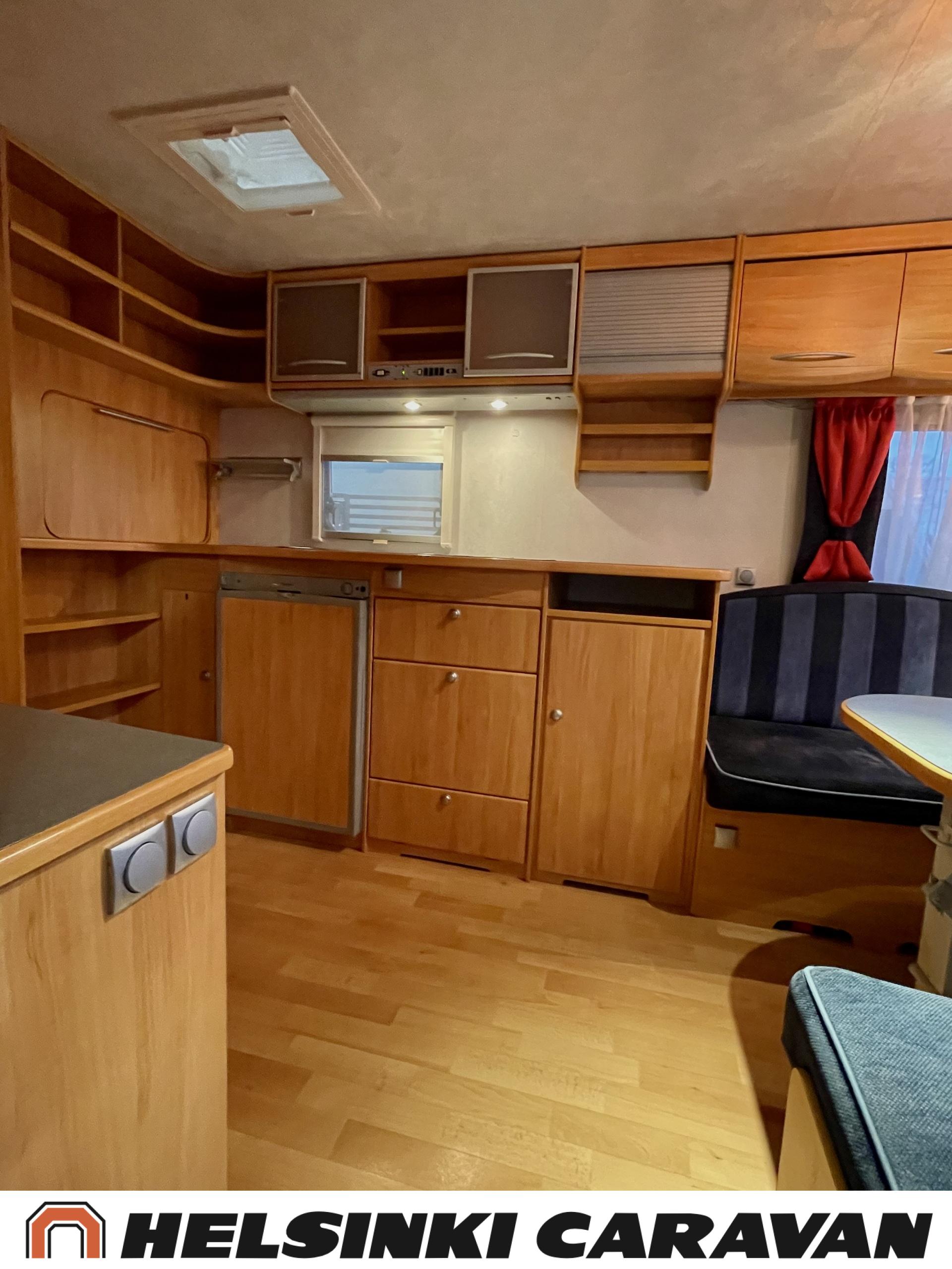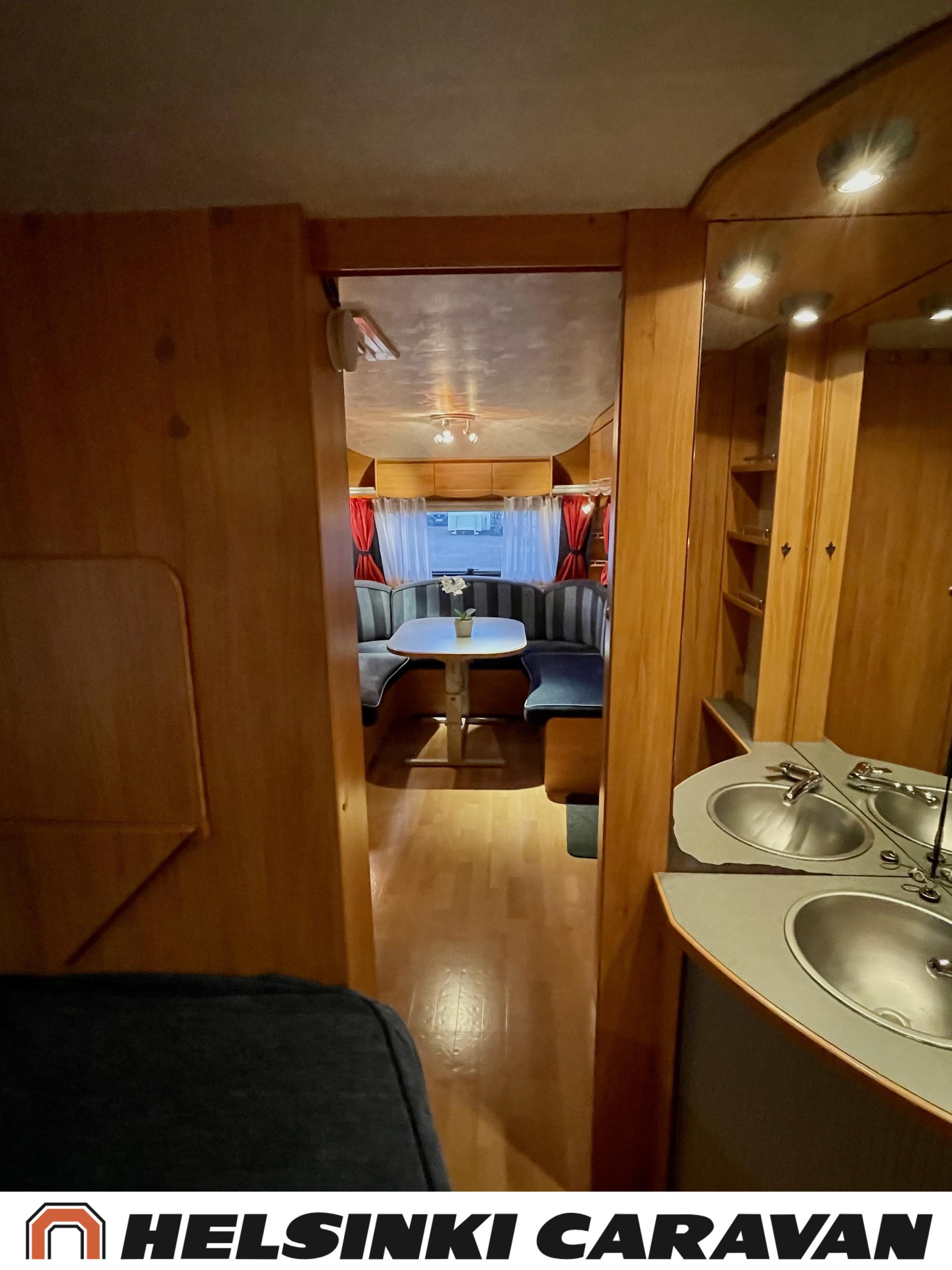 Ehdottomasti talvivaunu genreen laskettava tapaus! Pohjolan oloihin suunniteltu ja valmistettu ”Solikka”. Lämmitysjärjestelmänä Alden 6 kilowattinen (kaasulla) nestekiertolämmitys ja näissähän on myös aina lattiakierto yhdistettynä järjestelmään. Roikan päässä saadaan 3 kilowattia lisää sähkövastuksista, joten eiköhän ala riittämään keliin kun keliin. Muutenkin mukavasti varusteltu, eli löytyy vaununsiirtolaite, ilmastointi ja kaasu-uuni. Vaunun takaosasta löytyy makkari missä on pitkittäinen parivuode. Välittömässä läheisyydessä on kylppäritilat, sekä pieni työpöytä syvennys. Keskelle on asemoitu keittiö missä on varusteina mm. kaasu-uuni, sekä iso jääkappii ihanteelliselle käyttökorkeudelle sijoitettuna. Etuosaa hallitsee U-ryhmä mistä saadaan tarvittaessa vuode kahdelle henkilölle. Mainittavan arvoinen asia vaunun toiminnallisuuden kannalta on heti käyntioven läheisyydessä oleva vaatesyvennys, on kyllä kätevä heittää tähän sisään tullessa ulkovaatteet ja kengät eikä tarvitse alkaa niitä sullomaan johonkin vaunun vaatekaapeista. Vaunulla on ollut historiansa aikana vain yksi käyttäjäomistaja.