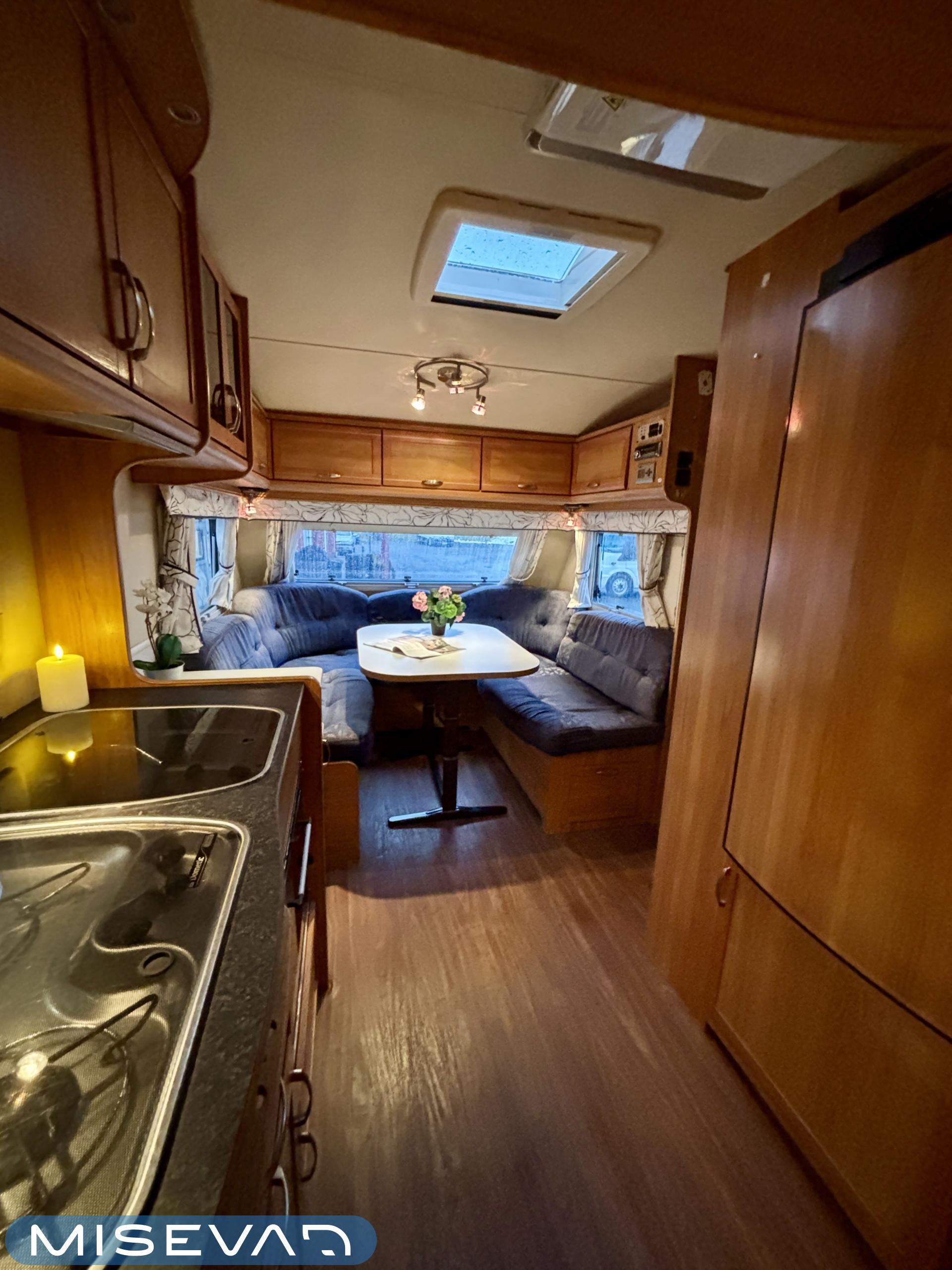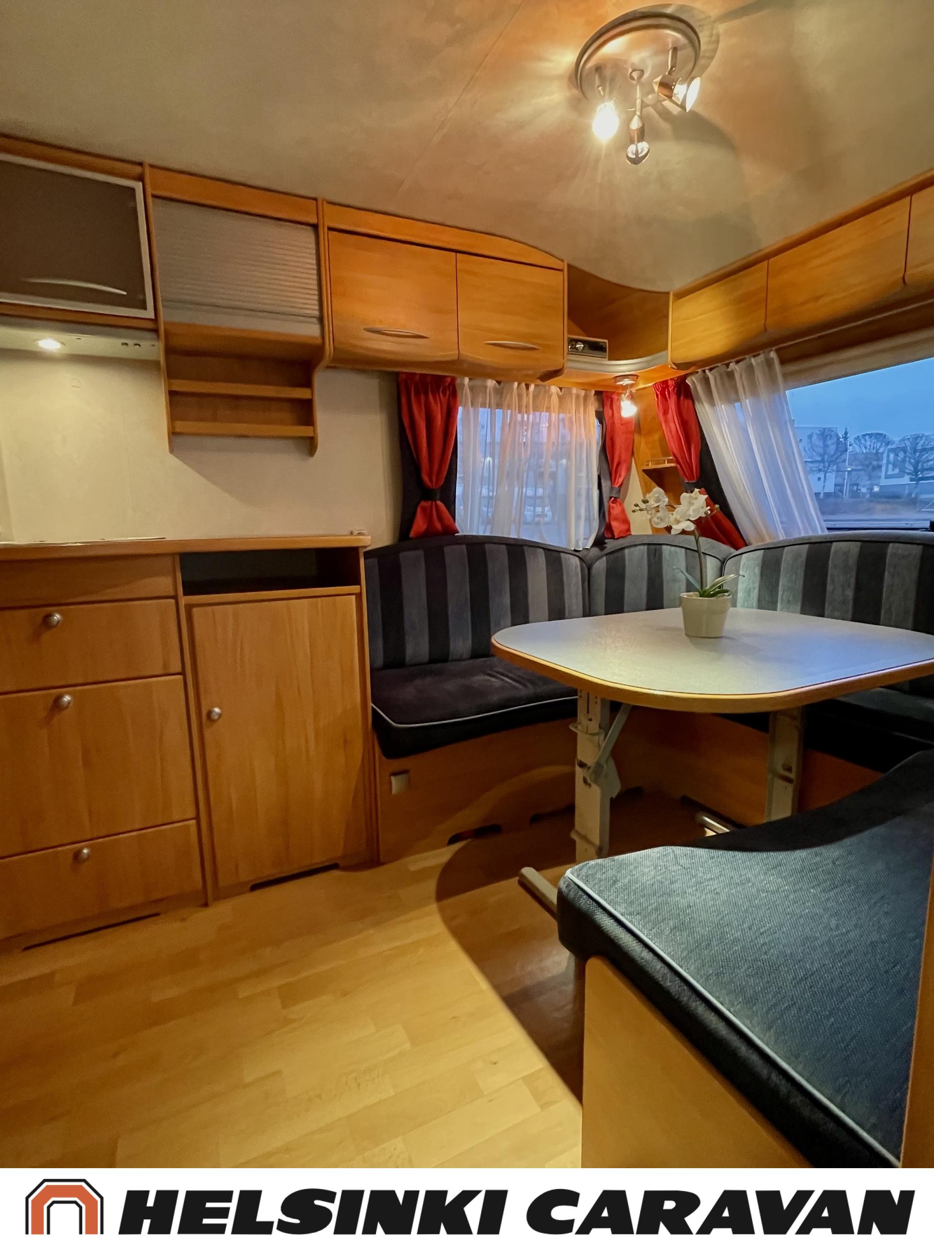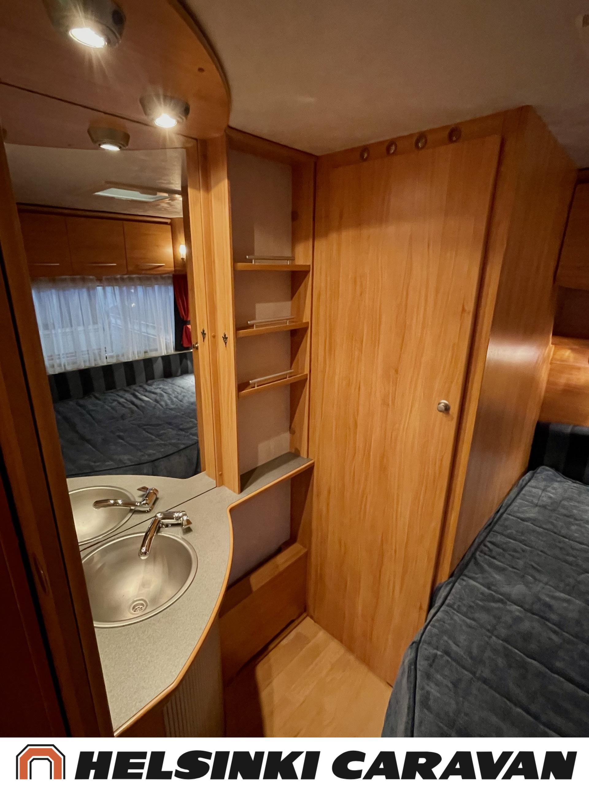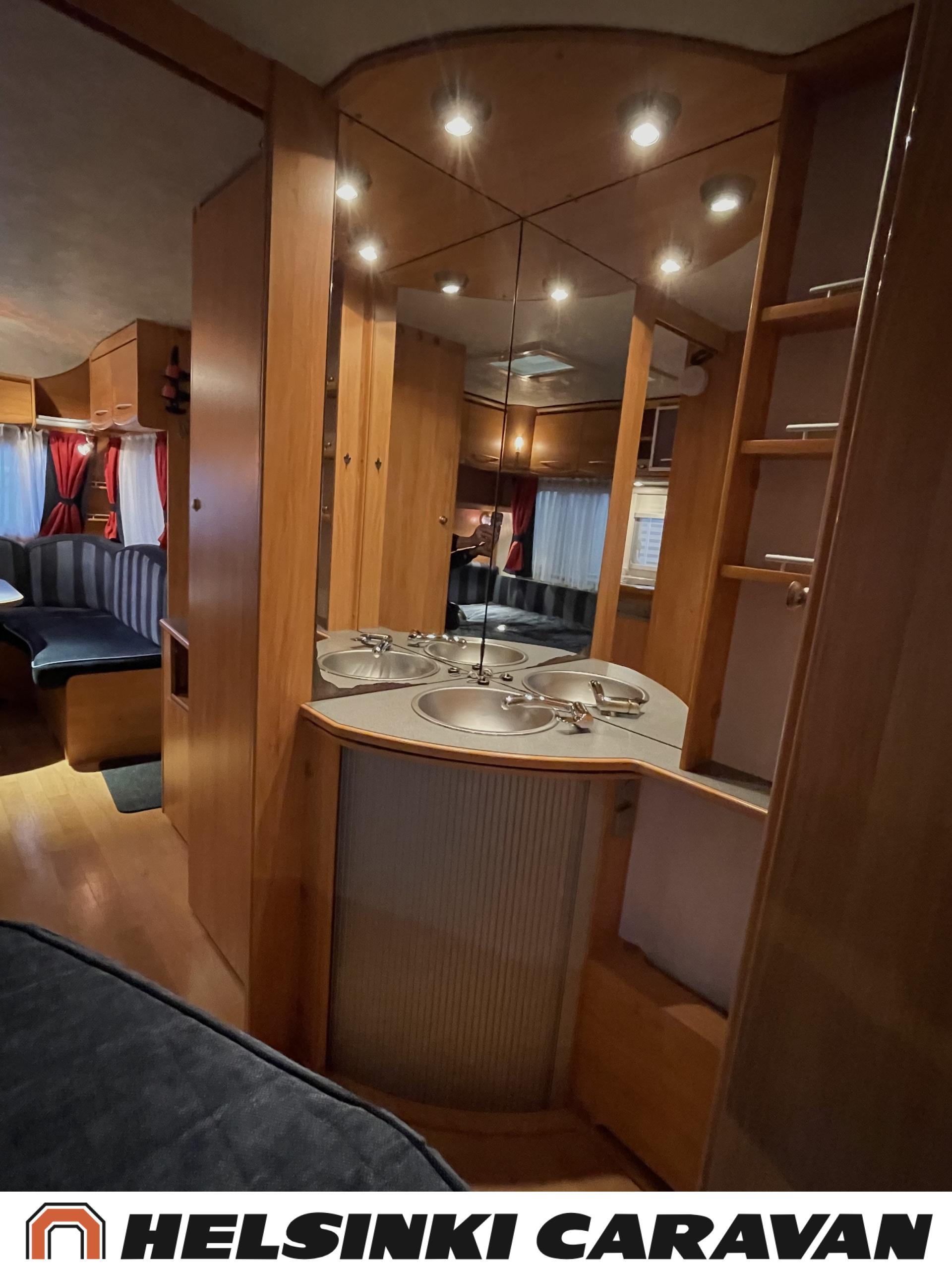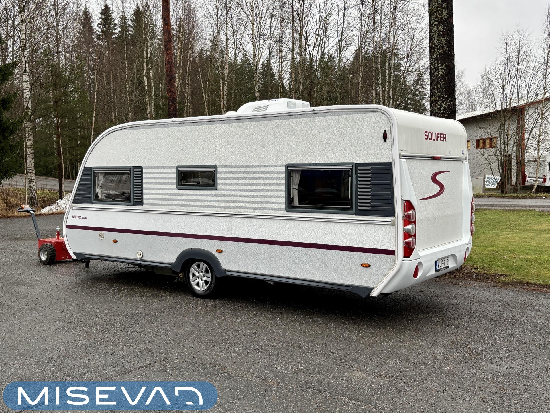 Ehdottomasti talvivaunu genreen laskettava tapaus! Pohjolan oloihin suunniteltu ja valmistettu ”Solikka”. Lämmitysjärjestelmänä Alden 6 kilowattinen (kaasulla) nestekiertolämmitys ja näissähän on myös aina lattiakierto yhdistettynä järjestelmään. Roikan päässä saadaan 3 kilowattia lisää sähkövastuksista, joten eiköhän ala riittämään keliin kun keliin. Muutenkin mukavasti varusteltu, eli löytyy vaununsiirtolaite, ilmastointi ja kaasu-uuni. Vaunun takaosasta löytyy makkari missä on pitkittäinen parivuode. Välittömässä läheisyydessä on kylppäritilat, sekä pieni työpöytä syvennys. Keskelle on asemoitu keittiö missä on varusteina mm. kaasu-uuni, sekä iso jääkappii ihanteelliselle käyttökorkeudelle sijoitettuna. Etuosaa hallitsee U-ryhmä mistä saadaan tarvittaessa vuode kahdelle henkilölle. Mainittavan arvoinen asia vaunun toiminnallisuuden kannalta on heti käyntioven läheisyydessä oleva vaatesyvennys, on kyllä kätevä heittää tähän sisään tullessa ulkovaatteet ja kengät eikä tarvitse alkaa niitä sullomaan johonkin vaunun vaatekaapeista. Vaunulla on ollut historiansa aikana vain yksi käyttäjäomistaja.
