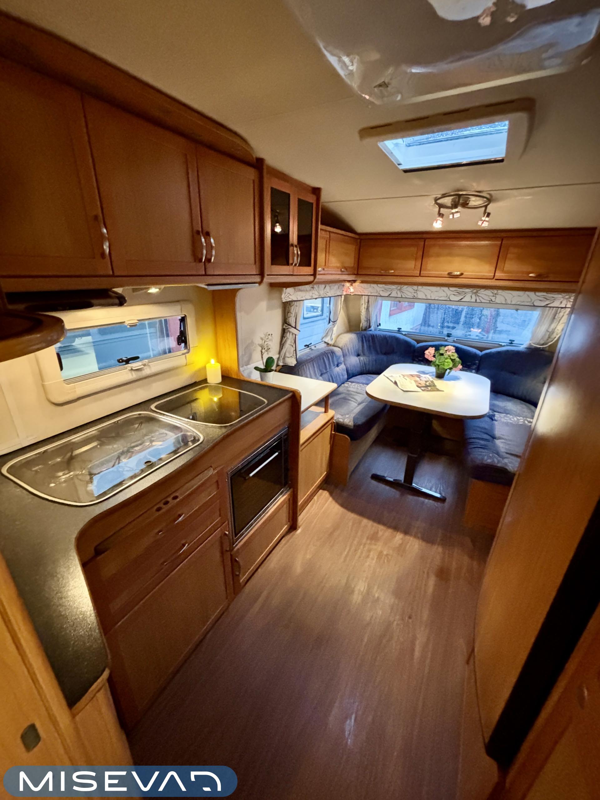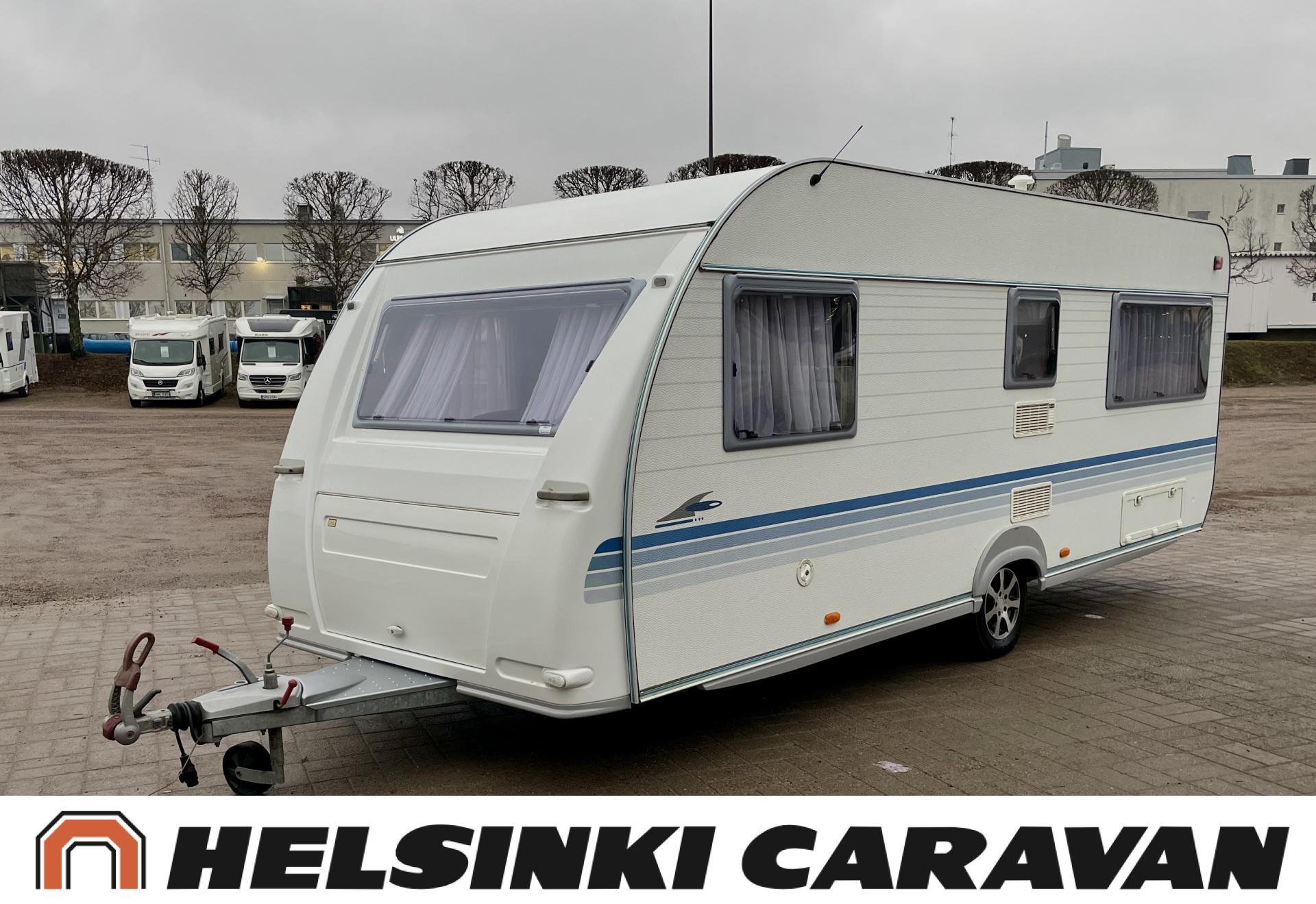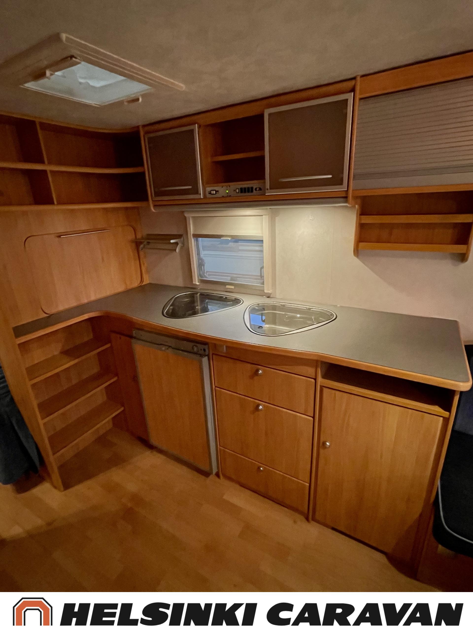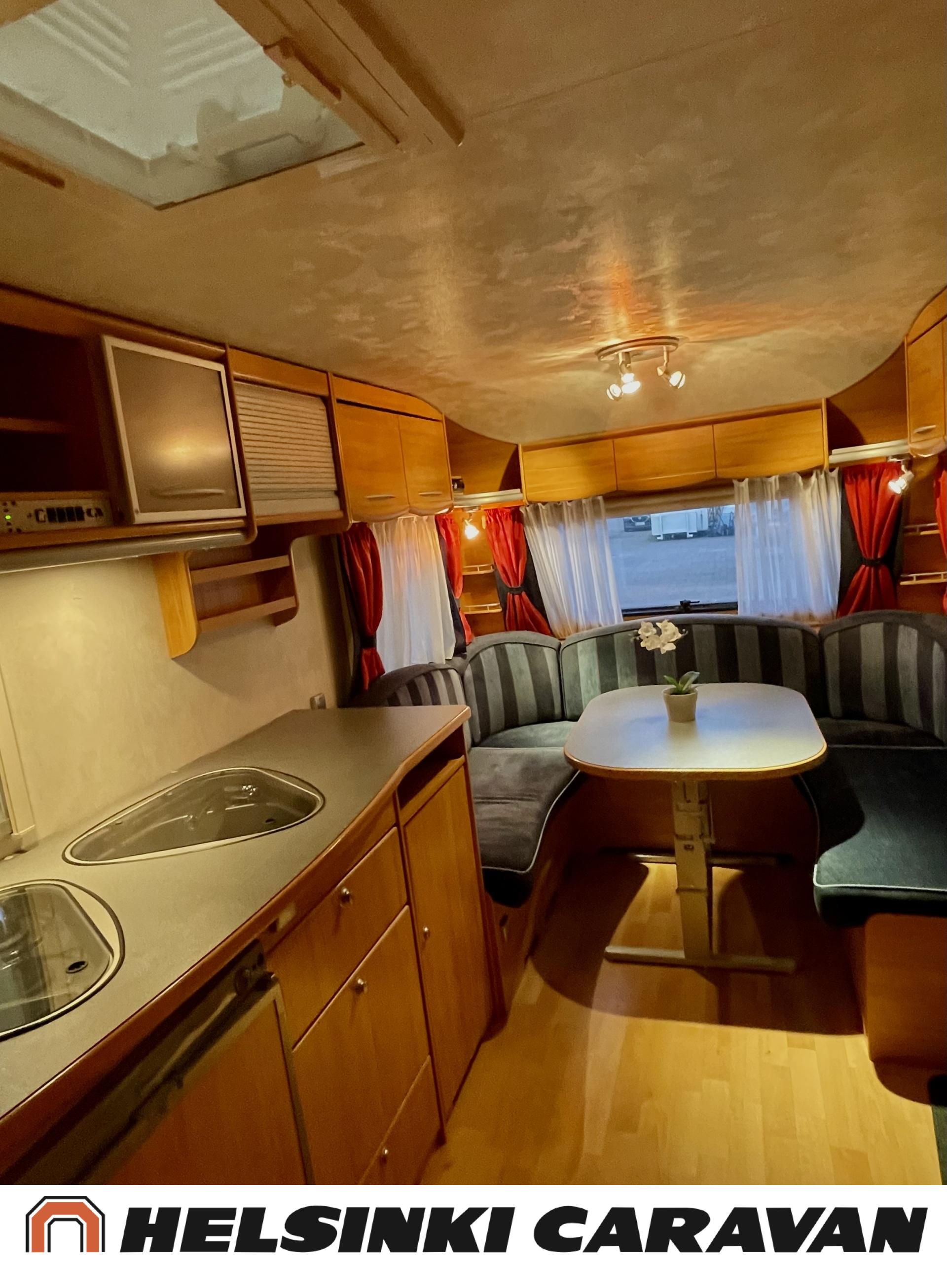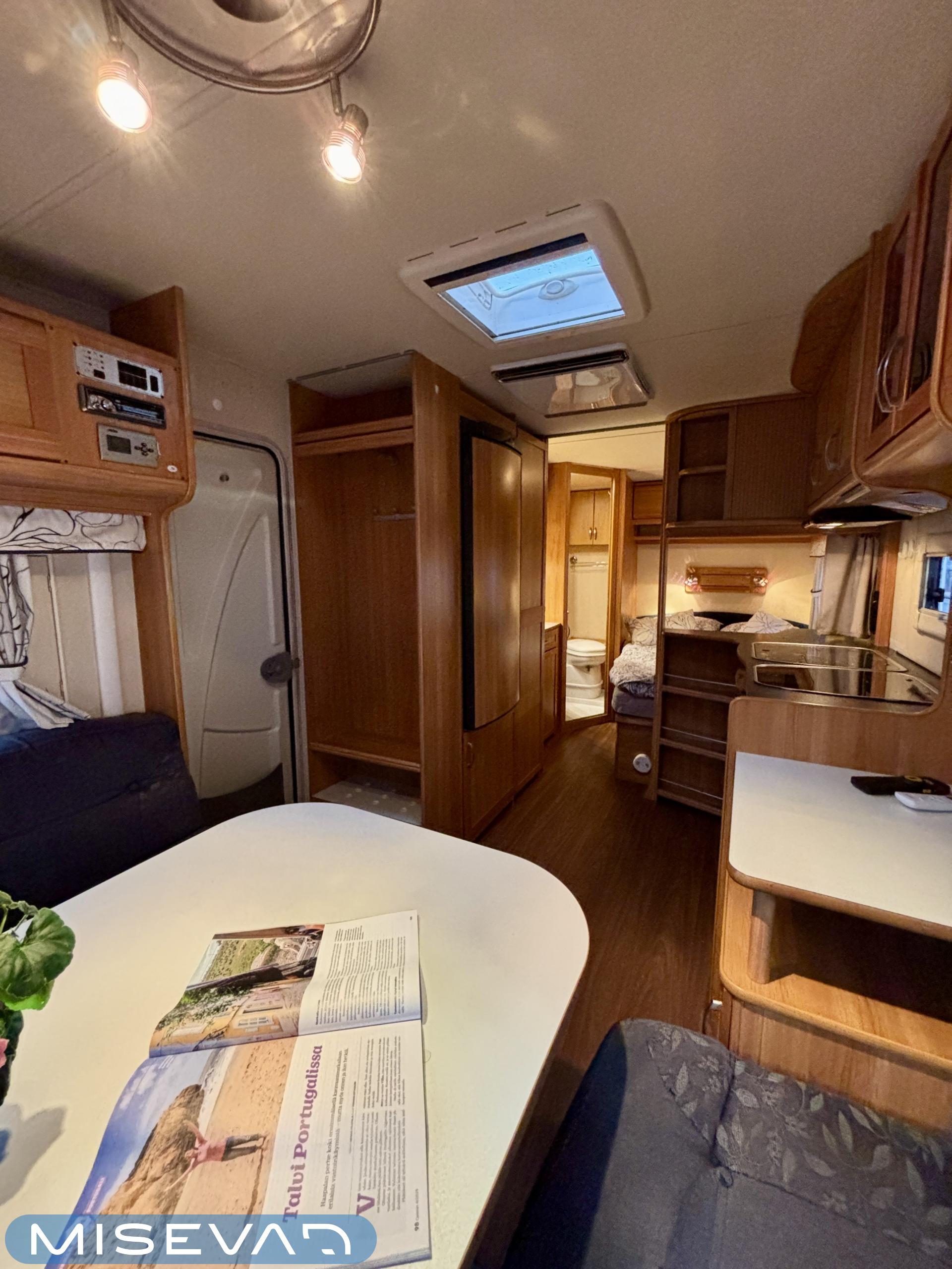 Ehdottomasti talvivaunu genreen laskettava tapaus! Pohjolan oloihin suunniteltu ja valmistettu ”Solikka”. Lämmitysjärjestelmänä Alden 6 kilowattinen (kaasulla) nestekiertolämmitys ja näissähän on myös aina lattiakierto yhdistettynä järjestelmään. Roikan päässä saadaan 3 kilowattia lisää sähkövastuksista, joten eiköhän ala riittämään keliin kun keliin. Muutenkin mukavasti varusteltu, eli löytyy vaununsiirtolaite, ilmastointi ja kaasu-uuni. Vaunun takaosasta löytyy makkari missä on pitkittäinen parivuode. Välittömässä läheisyydessä on kylppäritilat, sekä pieni työpöytä syvennys. Keskelle on asemoitu keittiö missä on varusteina mm. kaasu-uuni, sekä iso jääkappii ihanteelliselle käyttökorkeudelle sijoitettuna. Etuosaa hallitsee U-ryhmä mistä saadaan tarvittaessa vuode kahdelle henkilölle. Mainittavan arvoinen asia vaunun toiminnallisuuden kannalta on heti käyntioven läheisyydessä oleva vaatesyvennys, on kyllä kätevä heittää tähän sisään tullessa ulkovaatteet ja kengät eikä tarvitse alkaa niitä sullomaan johonkin vaunun vaatekaapeista. Vaunulla on ollut historiansa aikana vain yksi käyttäjäomistaja.