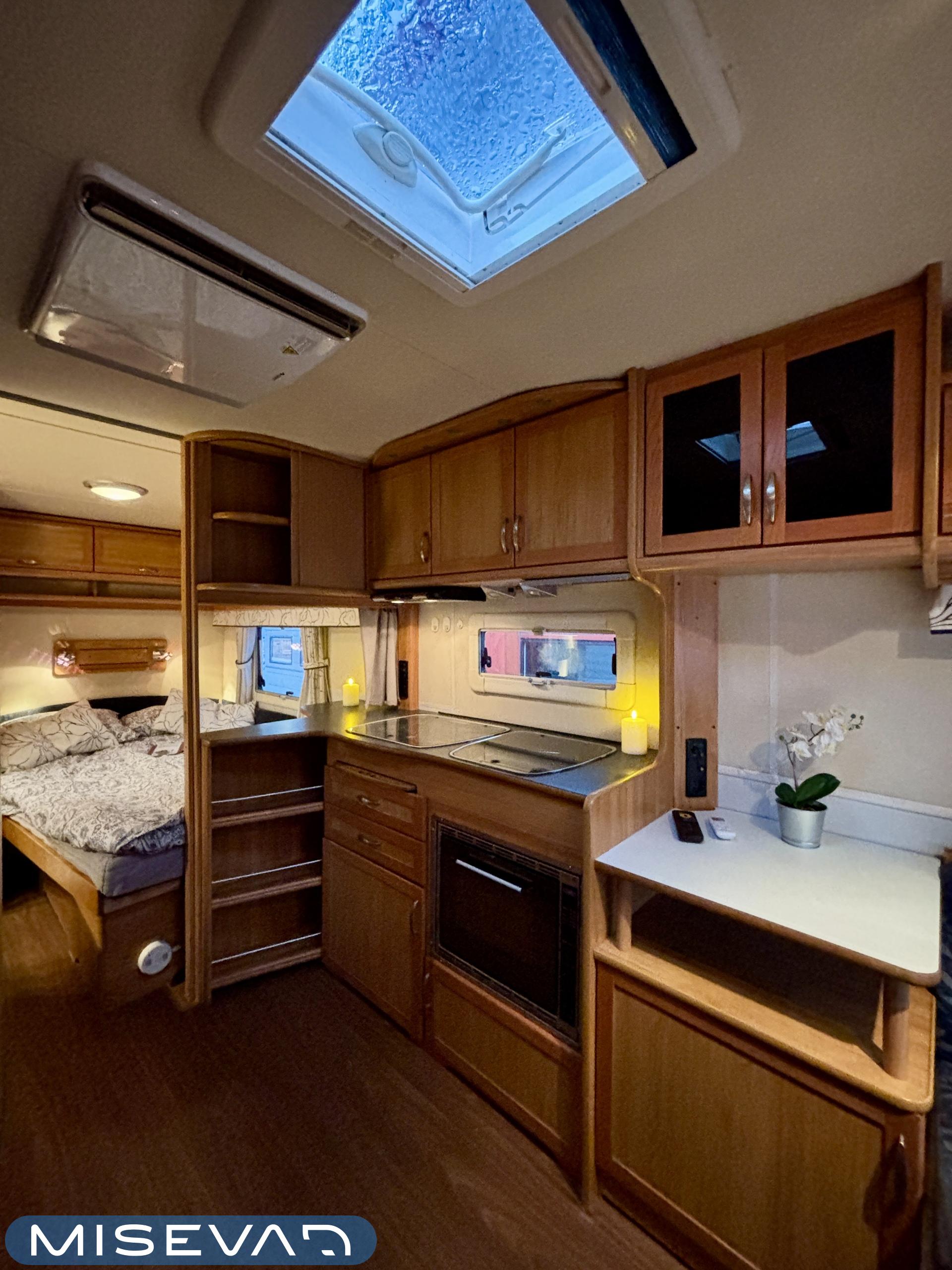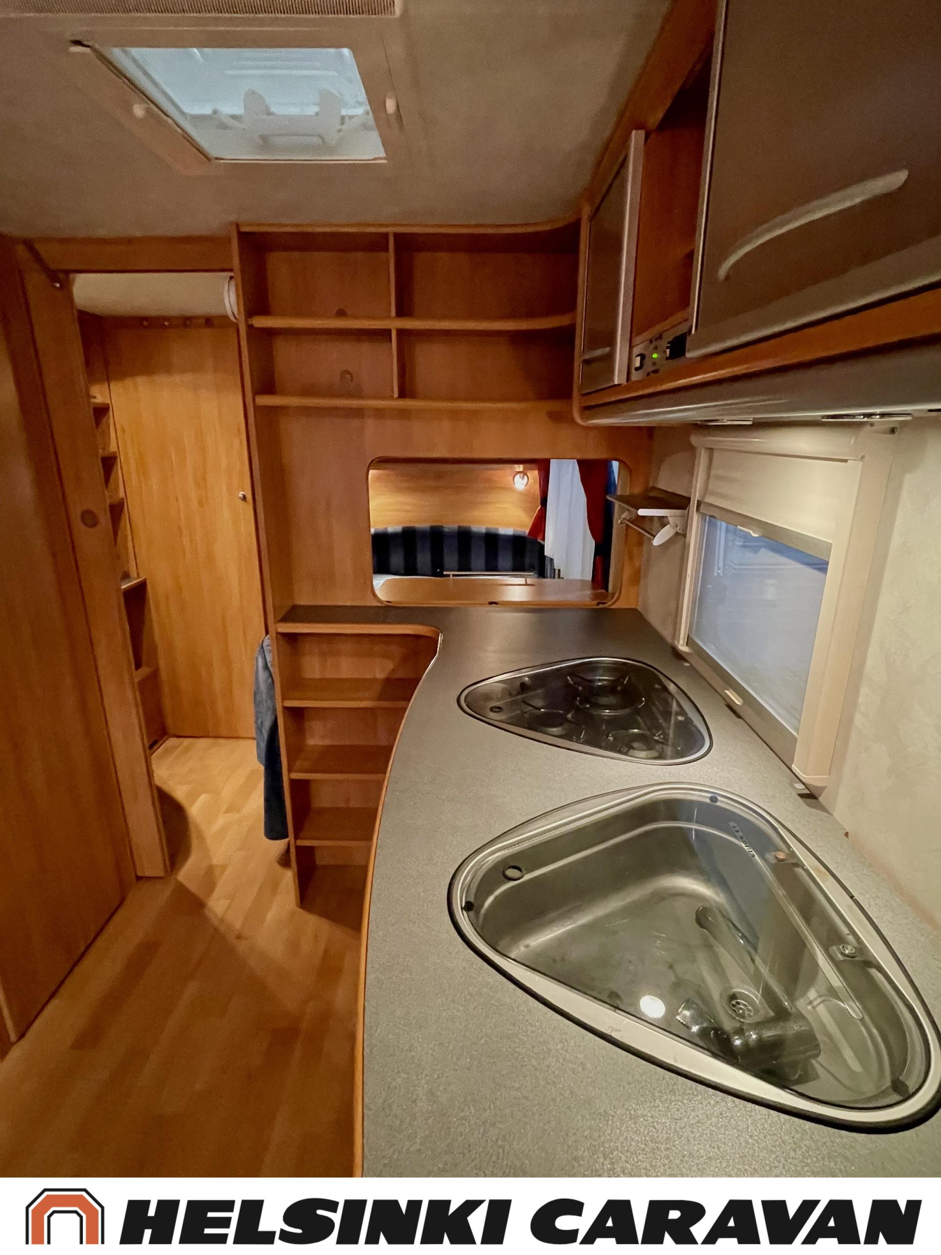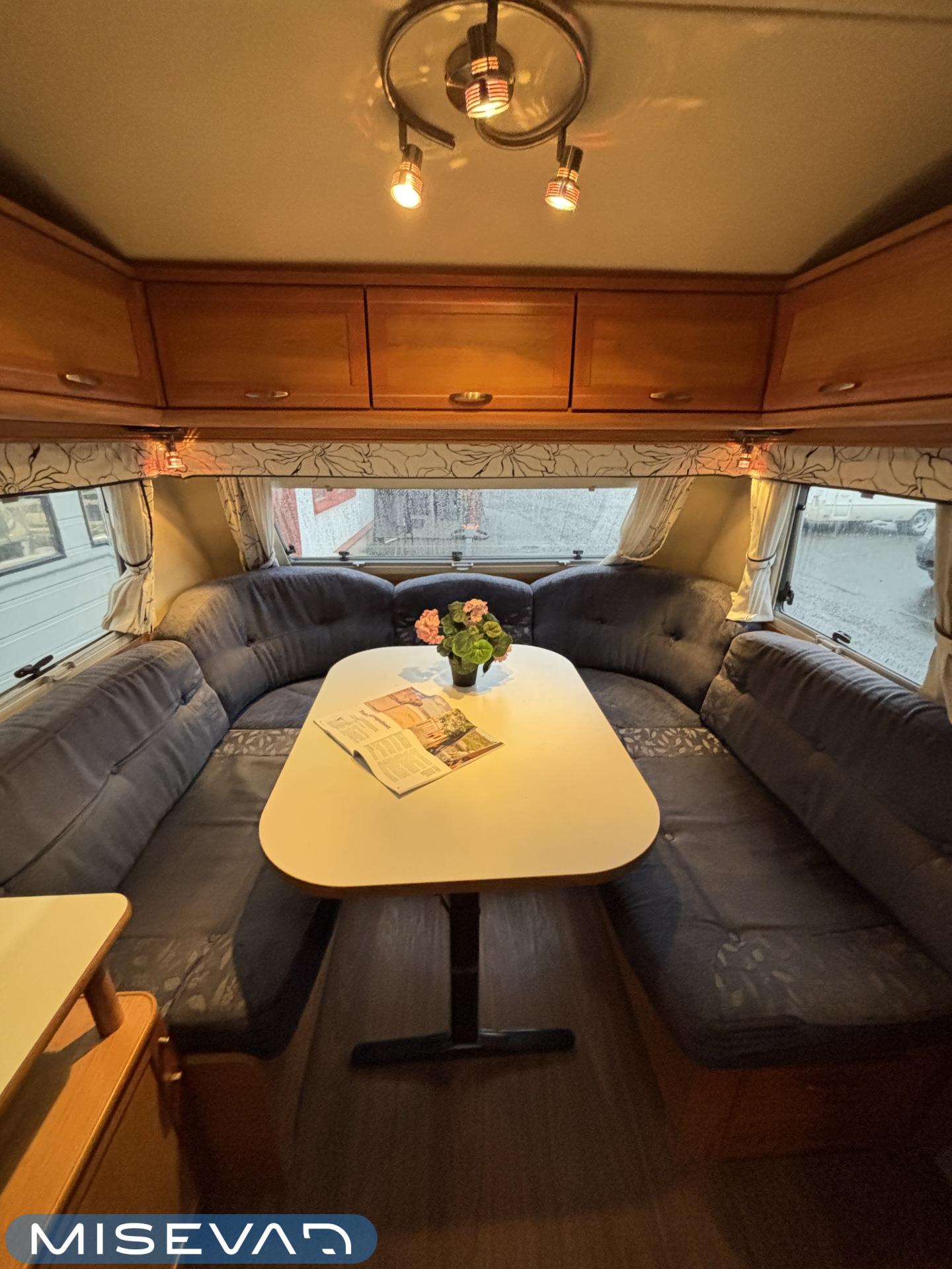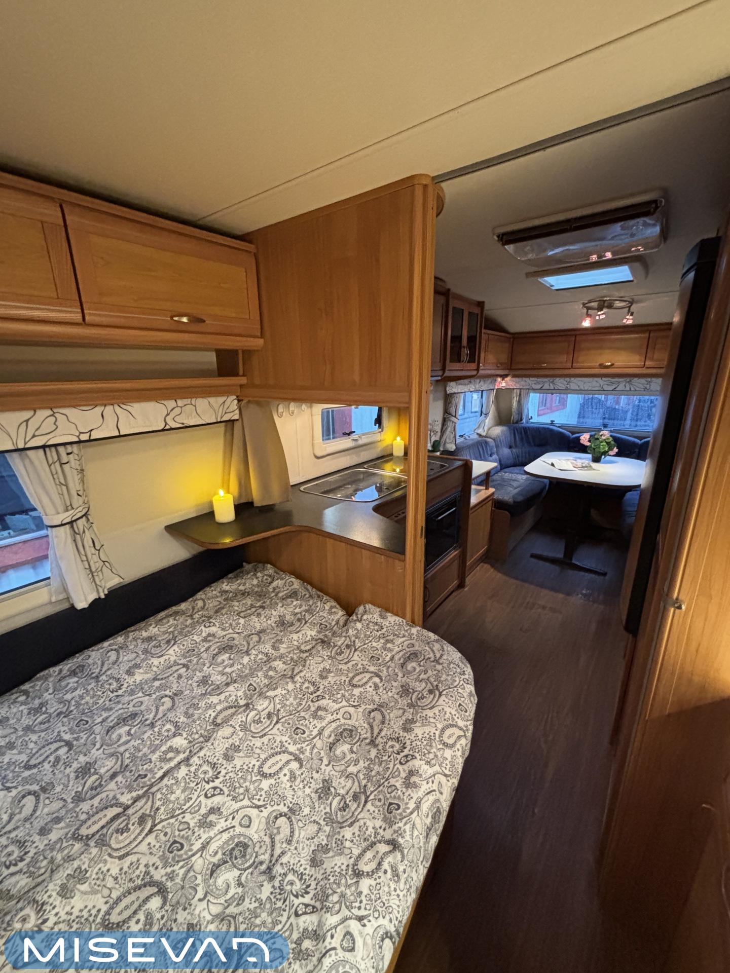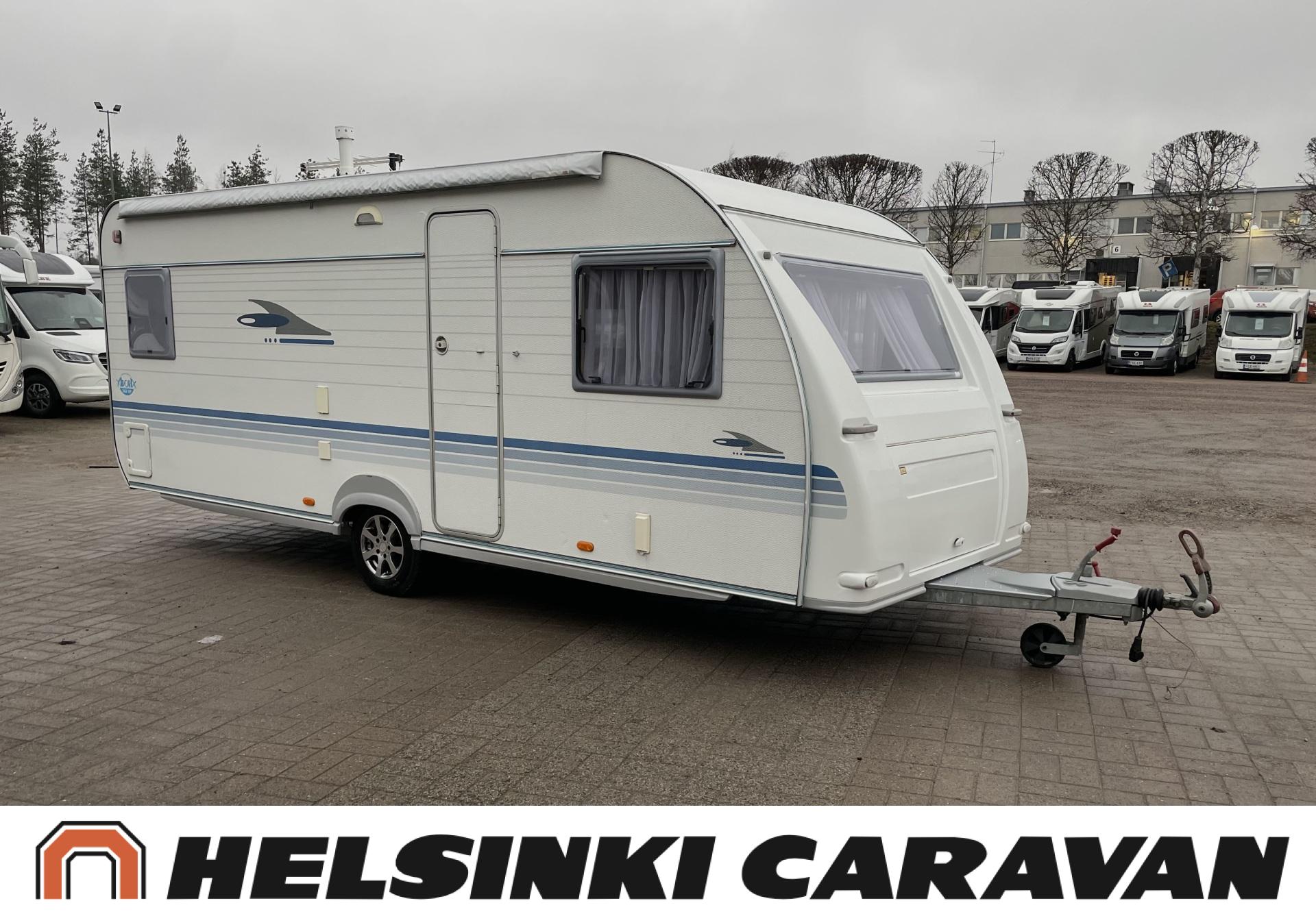 Ehdottomasti talvivaunu genreen laskettava tapaus! Pohjolan oloihin suunniteltu ja valmistettu ”Solikka”. Lämmitysjärjestelmänä Alden 6 kilowattinen (kaasulla) nestekiertolämmitys ja näissähän on myös aina lattiakierto yhdistettynä järjestelmään. Roikan päässä saadaan 3 kilowattia lisää sähkövastuksista, joten eiköhän ala riittämään keliin kun keliin. Muutenkin mukavasti varusteltu, eli löytyy vaununsiirtolaite, ilmastointi ja kaasu-uuni. Vaunun takaosasta löytyy makkari missä on pitkittäinen parivuode. Välittömässä läheisyydessä on kylppäritilat, sekä pieni työpöytä syvennys. Keskelle on asemoitu keittiö missä on varusteina mm. kaasu-uuni, sekä iso jääkappii ihanteelliselle käyttökorkeudelle sijoitettuna. Etuosaa hallitsee U-ryhmä mistä saadaan tarvittaessa vuode kahdelle henkilölle. Mainittavan arvoinen asia vaunun toiminnallisuuden kannalta on heti käyntioven läheisyydessä oleva vaatesyvennys, on kyllä kätevä heittää tähän sisään tullessa ulkovaatteet ja kengät eikä tarvitse alkaa niitä sullomaan johonkin vaunun vaatekaapeista. Vaunulla on ollut historiansa aikana vain yksi käyttäjäomistaja.