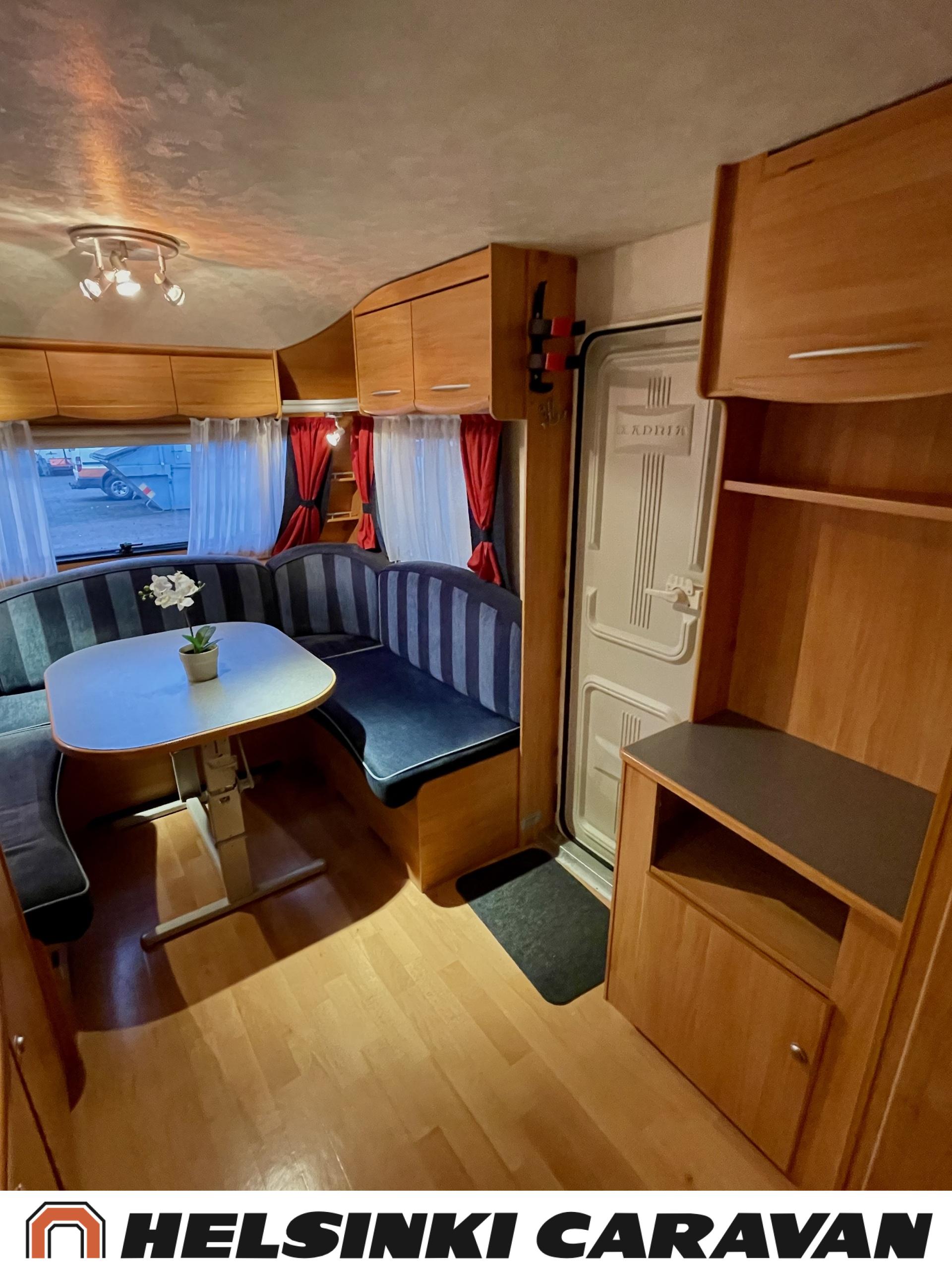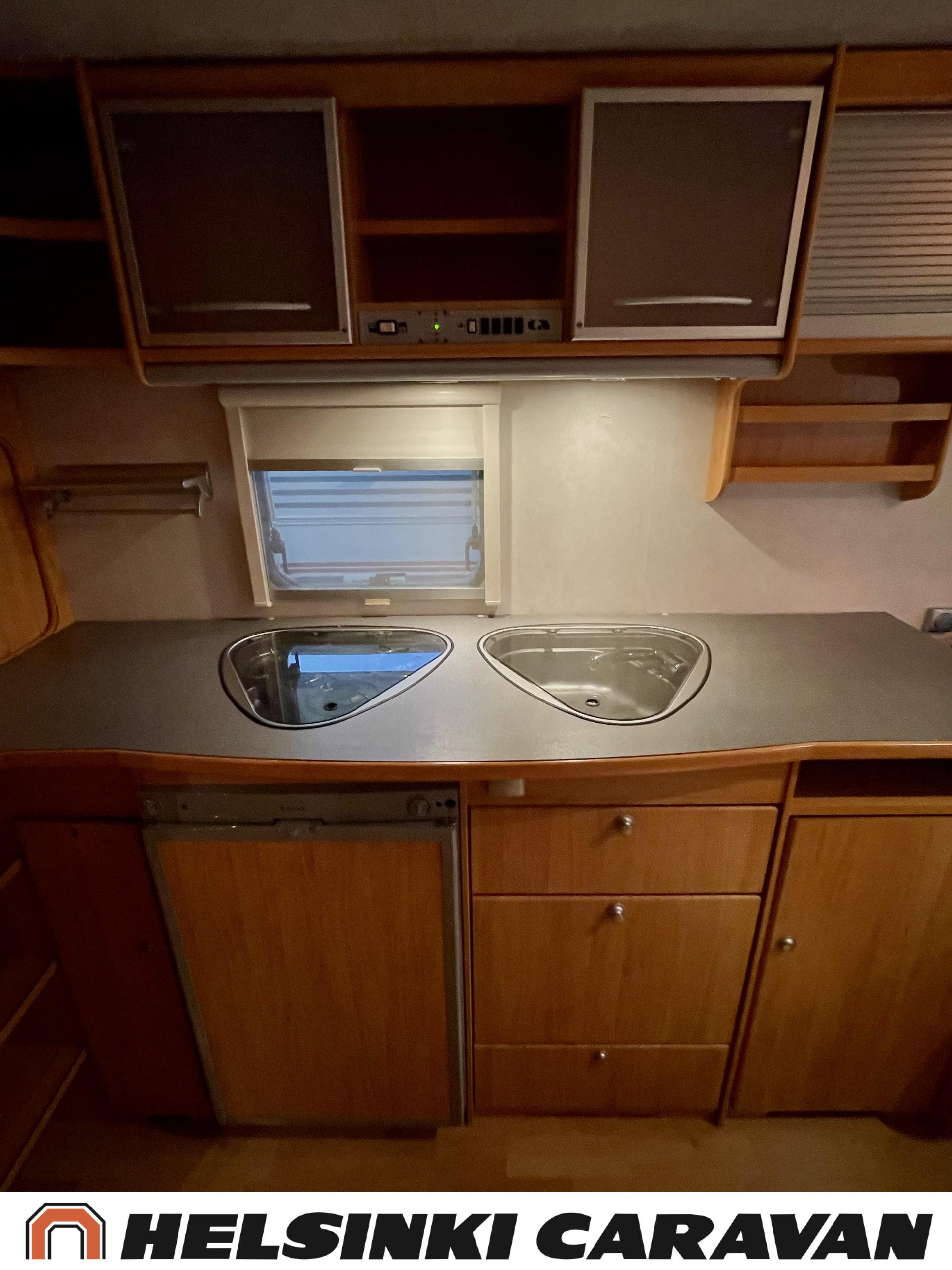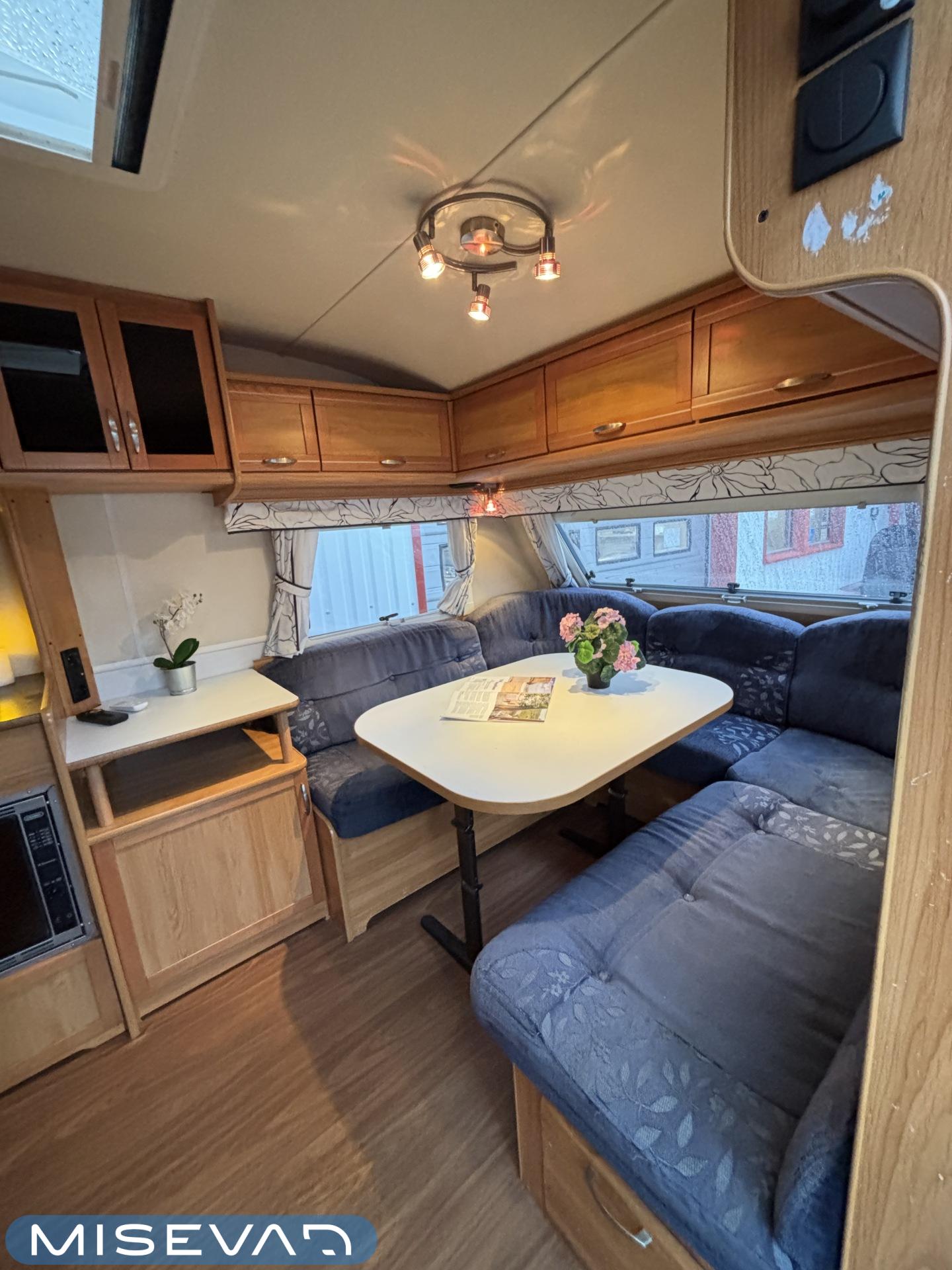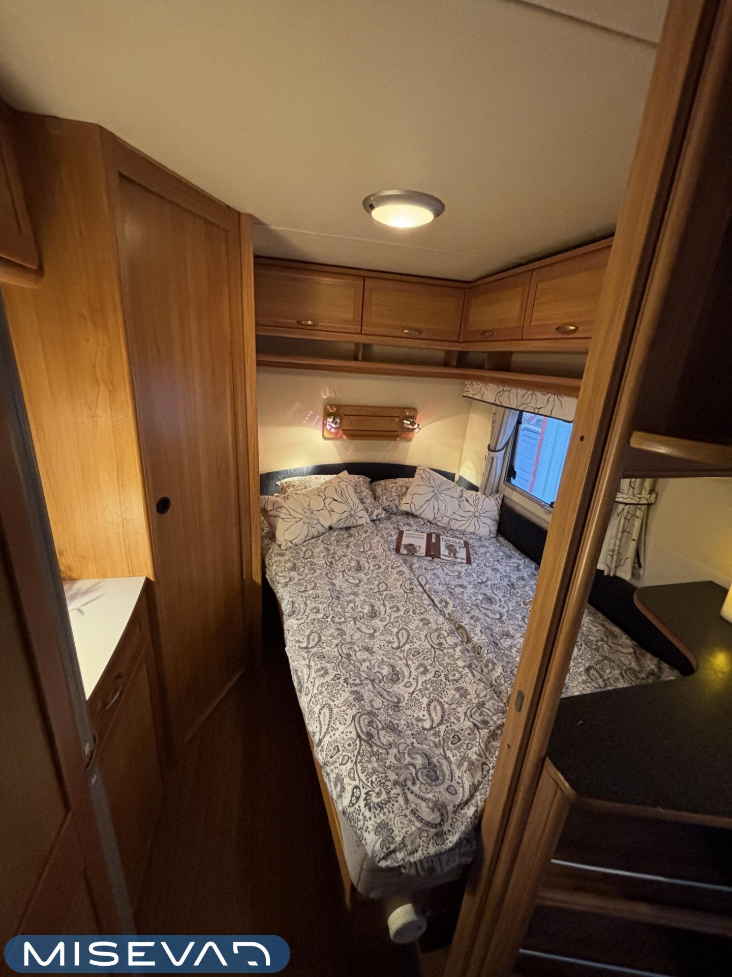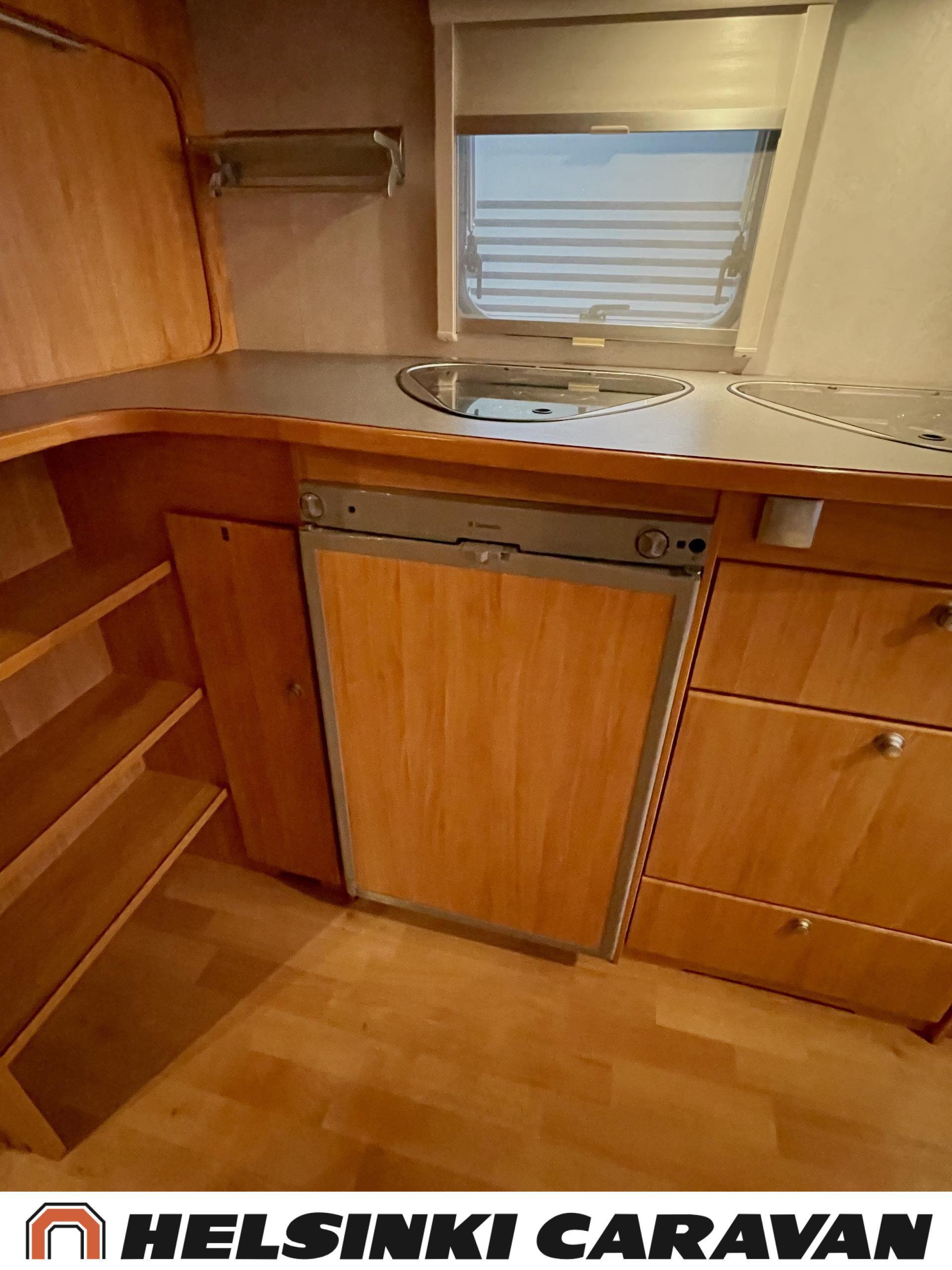 Ehdottomasti talvivaunu genreen laskettava tapaus! Pohjolan oloihin suunniteltu ja valmistettu ”Solikka”. Lämmitysjärjestelmänä Alden 6 kilowattinen (kaasulla) nestekiertolämmitys ja näissähän on myös aina lattiakierto yhdistettynä järjestelmään. Roikan päässä saadaan 3 kilowattia lisää sähkövastuksista, joten eiköhän ala riittämään keliin kun keliin. Muutenkin mukavasti varusteltu, eli löytyy vaununsiirtolaite, ilmastointi ja kaasu-uuni. Vaunun takaosasta löytyy makkari missä on pitkittäinen parivuode. Välittömässä läheisyydessä on kylppäritilat, sekä pieni työpöytä syvennys. Keskelle on asemoitu keittiö missä on varusteina mm. kaasu-uuni, sekä iso jääkappii ihanteelliselle käyttökorkeudelle sijoitettuna. Etuosaa hallitsee U-ryhmä mistä saadaan tarvittaessa vuode kahdelle henkilölle. Mainittavan arvoinen asia vaunun toiminnallisuuden kannalta on heti käyntioven läheisyydessä oleva vaatesyvennys, on kyllä kätevä heittää tähän sisään tullessa ulkovaatteet ja kengät eikä tarvitse alkaa niitä sullomaan johonkin vaunun vaatekaapeista. Vaunulla on ollut historiansa aikana vain yksi käyttäjäomistaja.