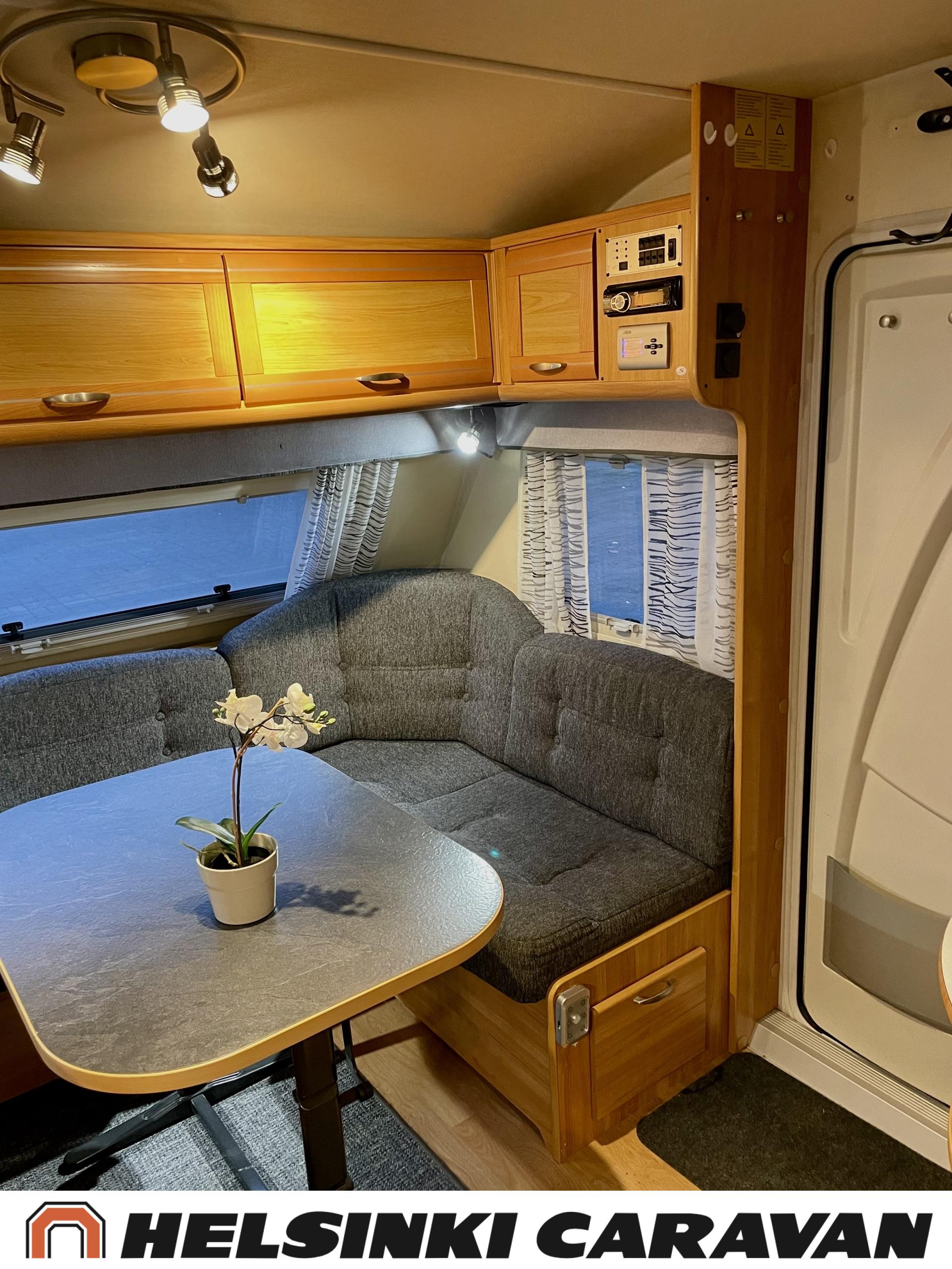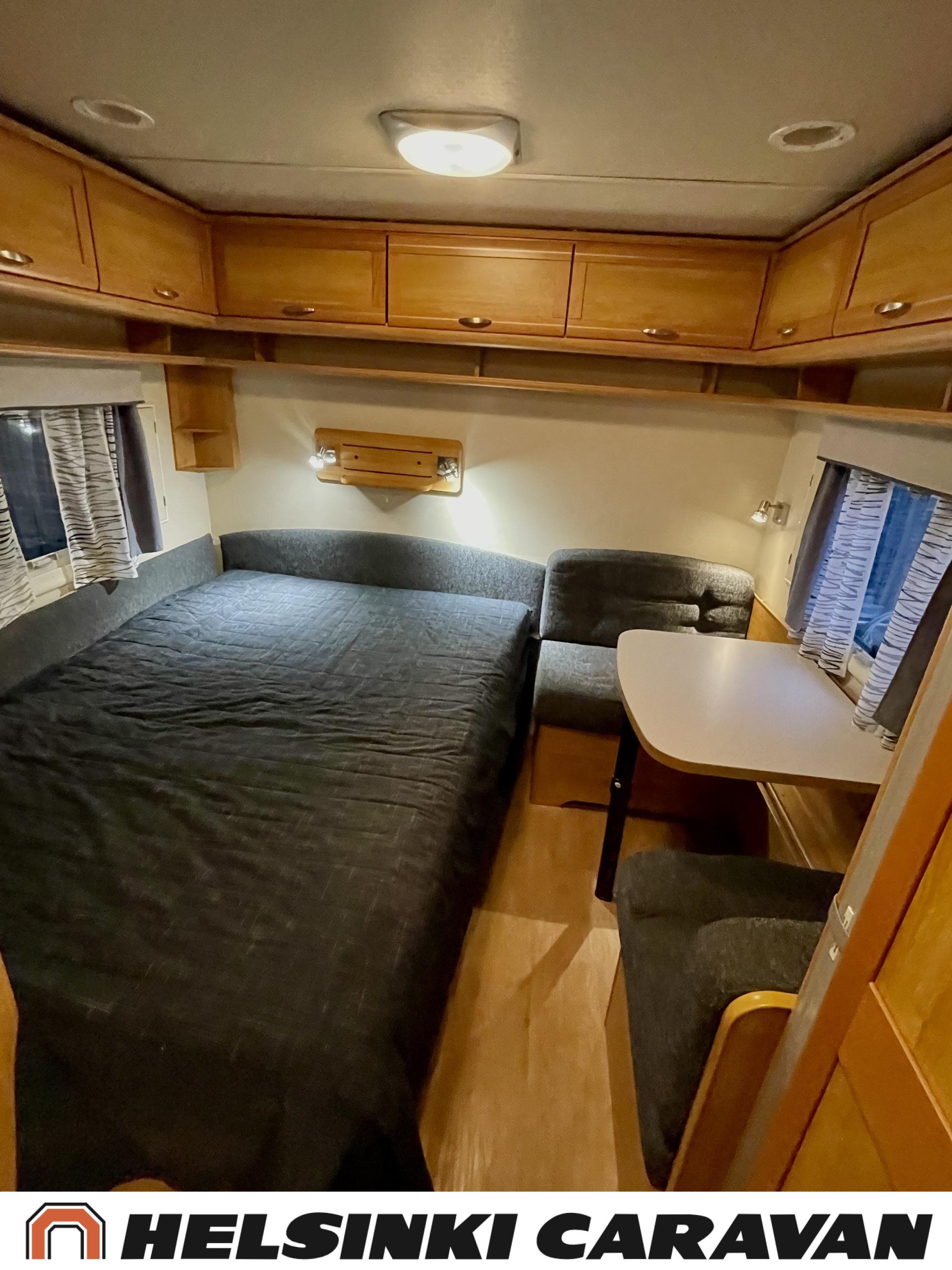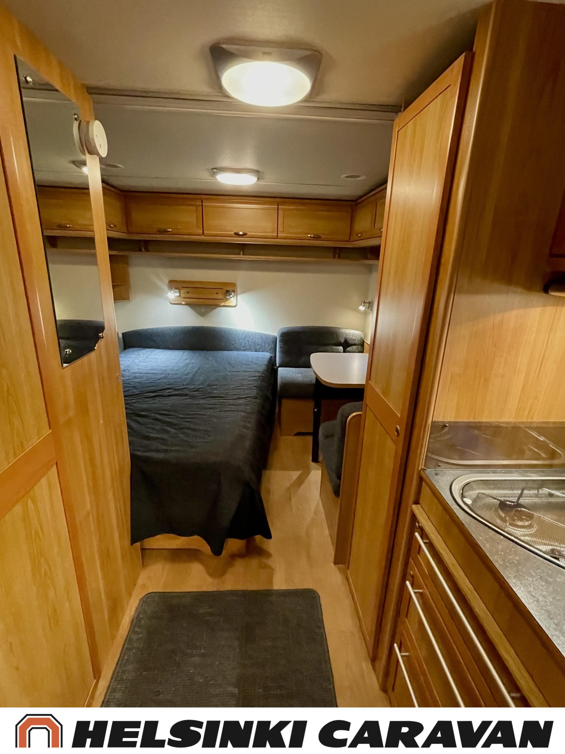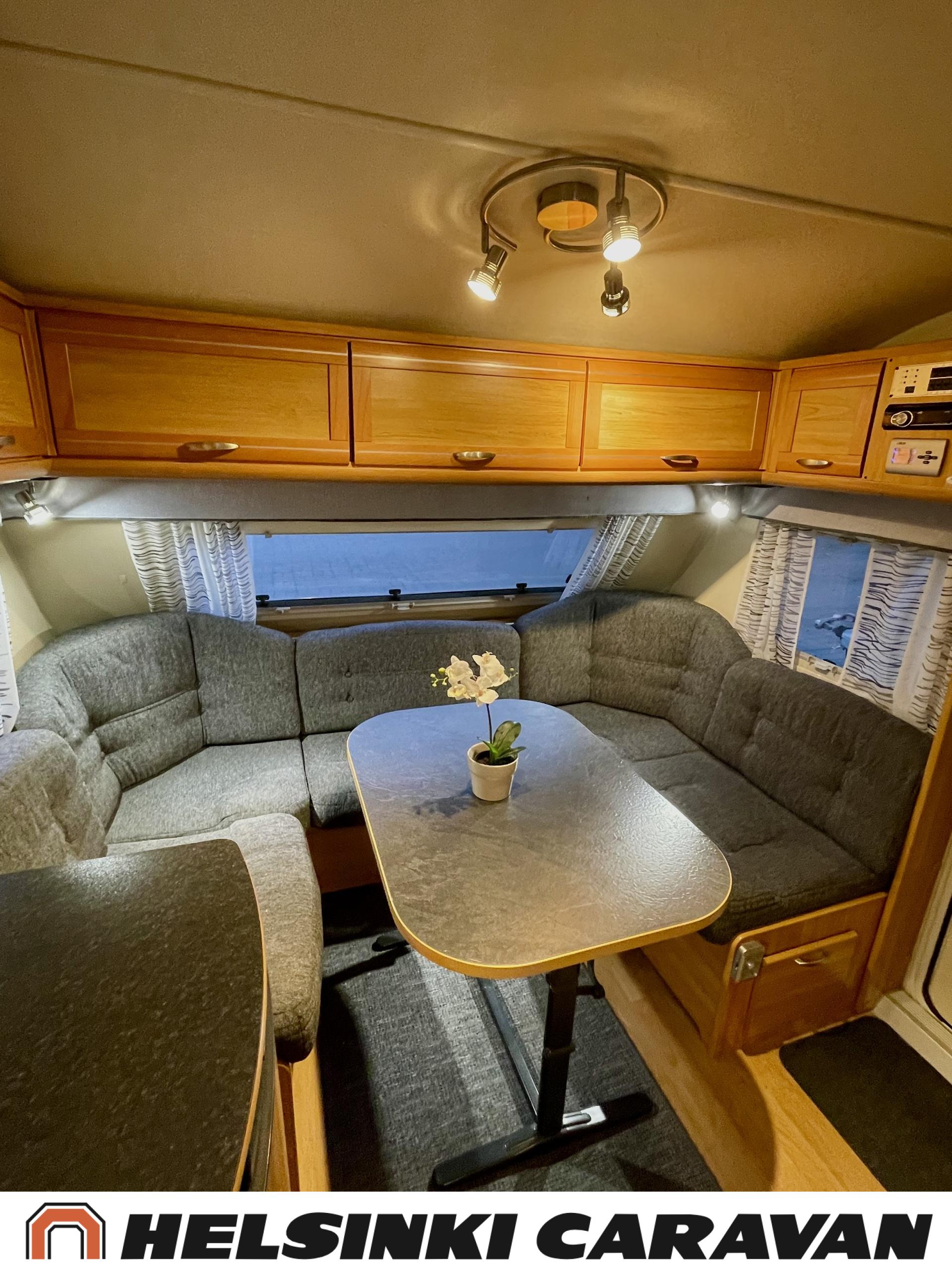 Ehdottomasti talvivaunu genreen laskettava tapaus! Pohjolan oloihin suunniteltu ja valmistettu ”Solikka”. Lämmitysjärjestelmänä Alden 6 kilowattinen (kaasulla) nestekiertolämmitys ja näissähän on myös aina lattiakierto yhdistettynä järjestelmään. Roikan päässä saadaan 3 kilowattia lisää sähkövastuksista, joten eiköhän ala riittämään keliin kun keliin. Muutenkin mukavasti varusteltu, eli löytyy vaununsiirtolaite, ilmastointi ja kaasu-uuni. Vaunun takaosasta löytyy makkari missä on pitkittäinen parivuode. Välittömässä läheisyydessä on kylppäritilat, sekä pieni työpöytä syvennys. Keskelle on asemoitu keittiö missä on varusteina mm. kaasu-uuni, sekä iso jääkappii ihanteelliselle käyttökorkeudelle sijoitettuna. Etuosaa hallitsee U-ryhmä mistä saadaan tarvittaessa vuode kahdelle henkilölle. Mainittavan arvoinen asia vaunun toiminnallisuuden kannalta on heti käyntioven läheisyydessä oleva vaatesyvennys, on kyllä kätevä heittää tähän sisään tullessa ulkovaatteet ja kengät eikä tarvitse alkaa niitä sullomaan johonkin vaunun vaatekaapeista. Vaunulla on ollut historiansa aikana vain yksi käyttäjäomistaja.