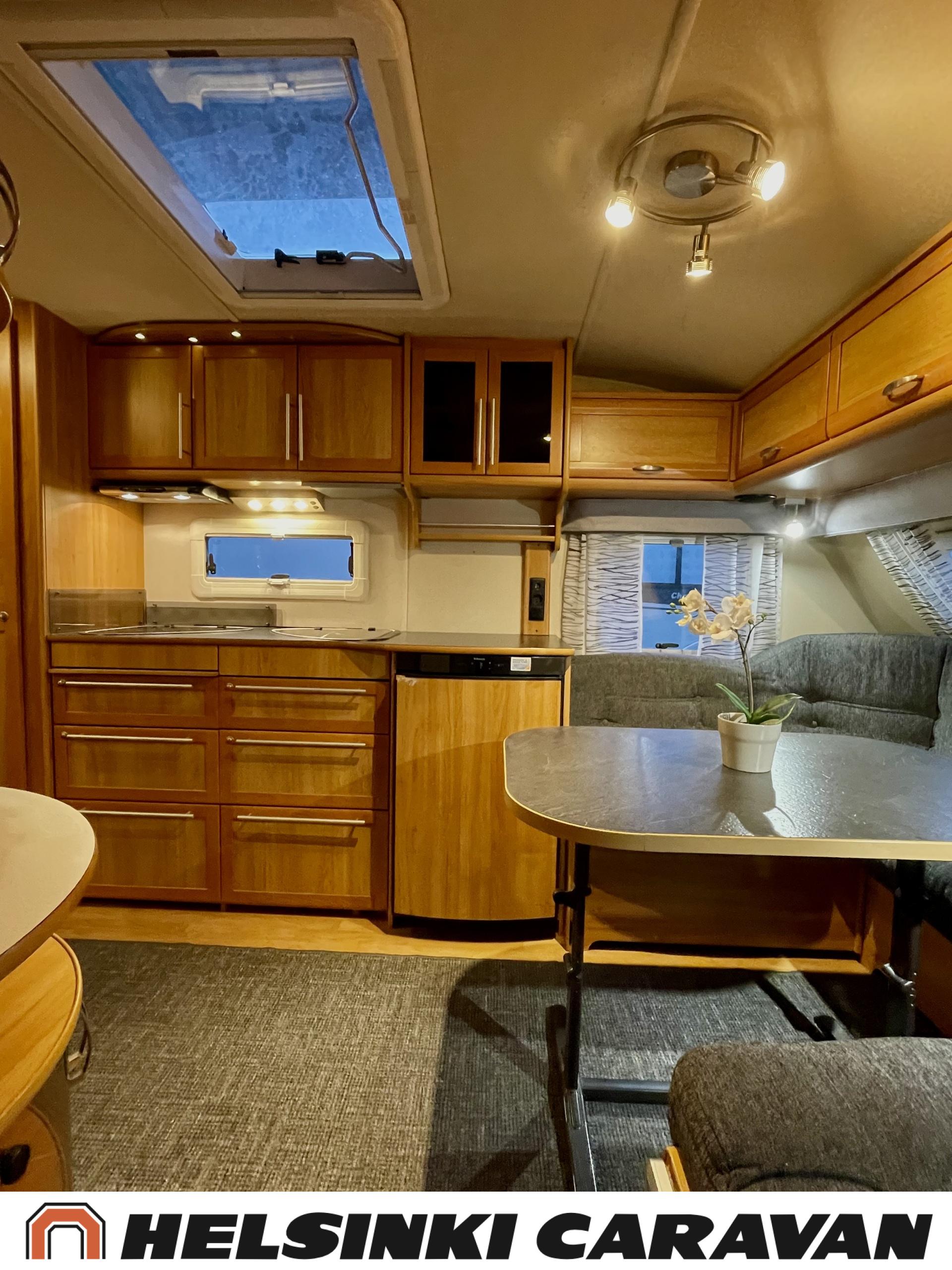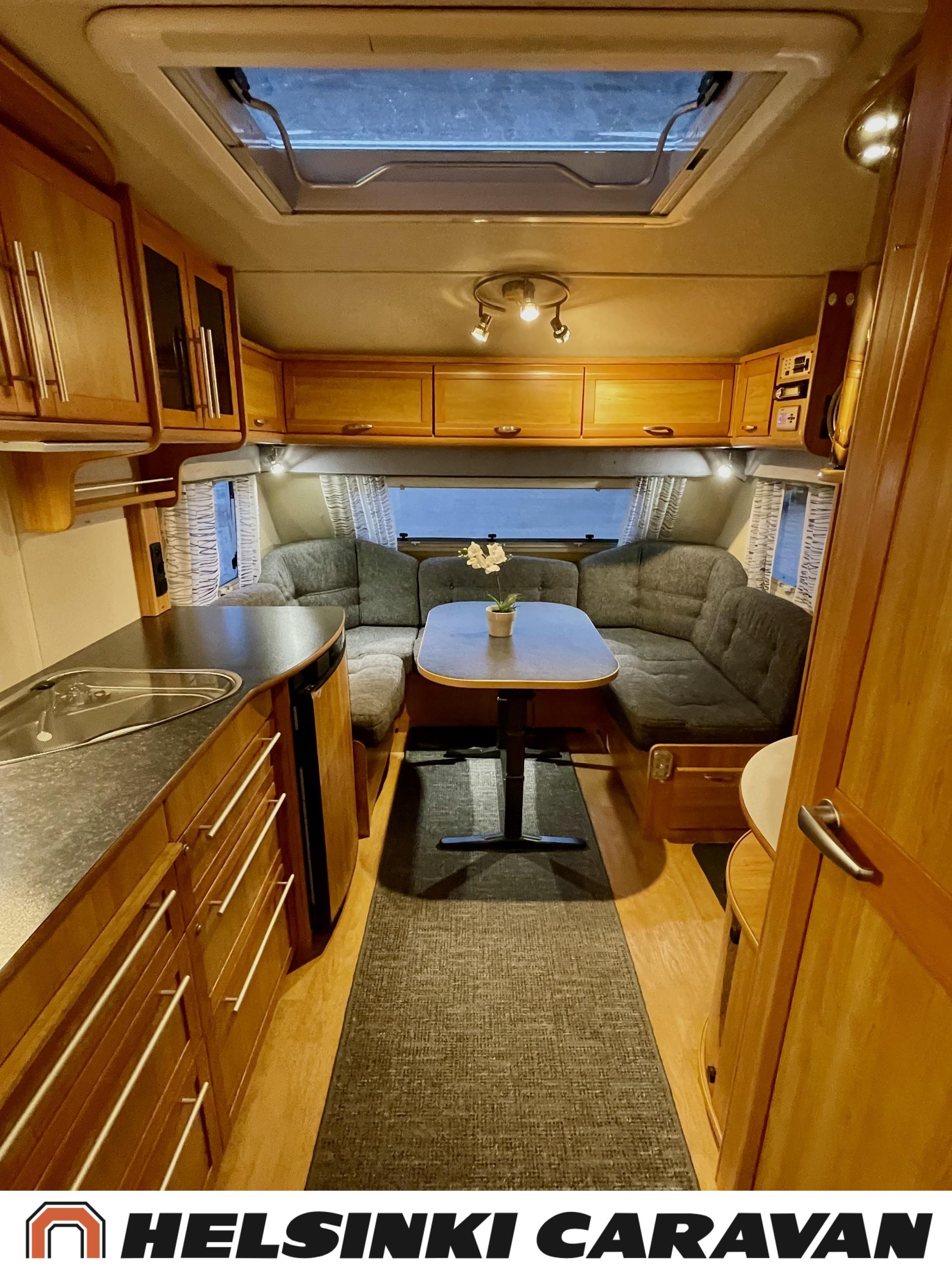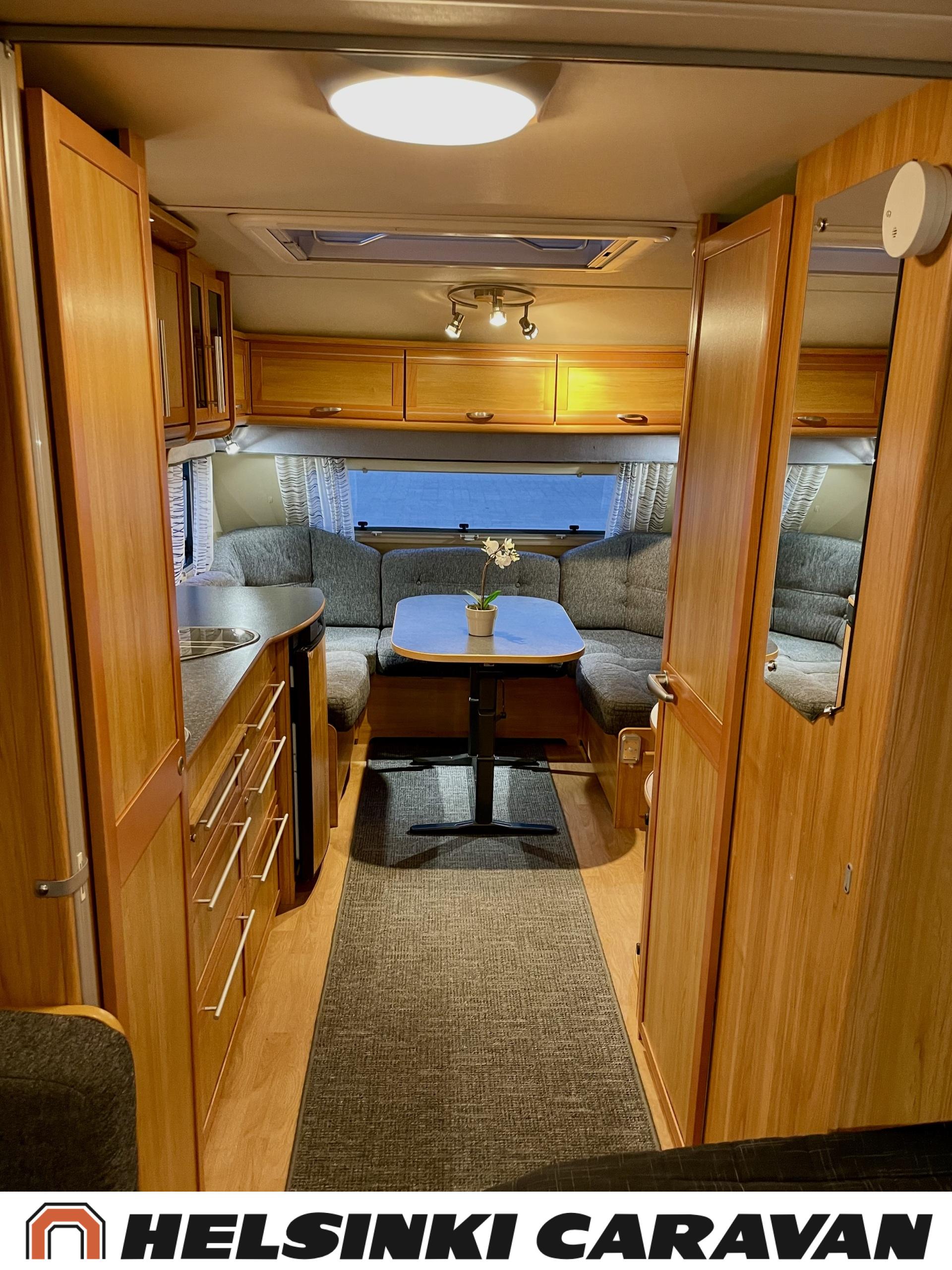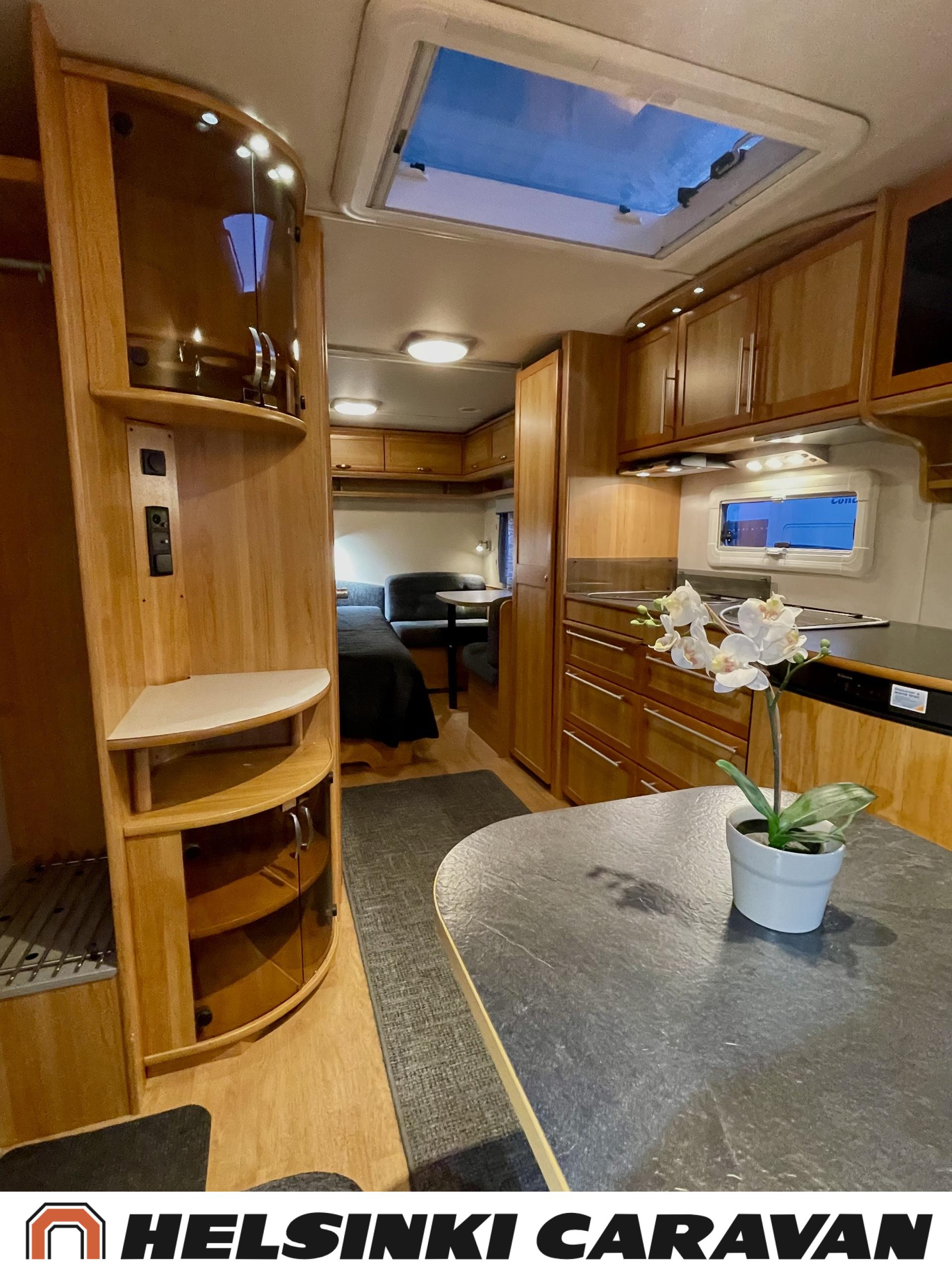 Ehdottomasti talvivaunu genreen laskettava tapaus! Pohjolan oloihin suunniteltu ja valmistettu ”Solikka”. Lämmitysjärjestelmänä Alden 6 kilowattinen (kaasulla) nestekiertolämmitys ja näissähän on myös aina lattiakierto yhdistettynä järjestelmään. Roikan päässä saadaan 3 kilowattia lisää sähkövastuksista, joten eiköhän ala riittämään keliin kun keliin. Muutenkin mukavasti varusteltu, eli löytyy vaununsiirtolaite, ilmastointi ja kaasu-uuni. Vaunun takaosasta löytyy makkari missä on pitkittäinen parivuode. Välittömässä läheisyydessä on kylppäritilat, sekä pieni työpöytä syvennys. Keskelle on asemoitu keittiö missä on varusteina mm. kaasu-uuni, sekä iso jääkappii ihanteelliselle käyttökorkeudelle sijoitettuna. Etuosaa hallitsee U-ryhmä mistä saadaan tarvittaessa vuode kahdelle henkilölle. Mainittavan arvoinen asia vaunun toiminnallisuuden kannalta on heti käyntioven läheisyydessä oleva vaatesyvennys, on kyllä kätevä heittää tähän sisään tullessa ulkovaatteet ja kengät eikä tarvitse alkaa niitä sullomaan johonkin vaunun vaatekaapeista. Vaunulla on ollut historiansa aikana vain yksi käyttäjäomistaja.