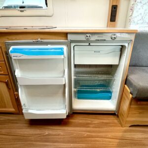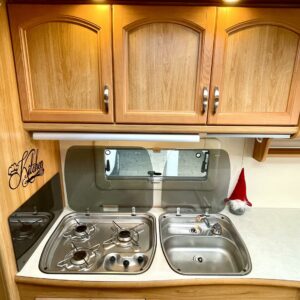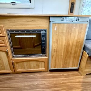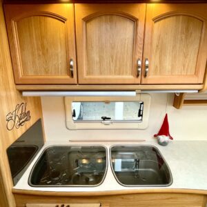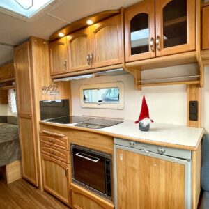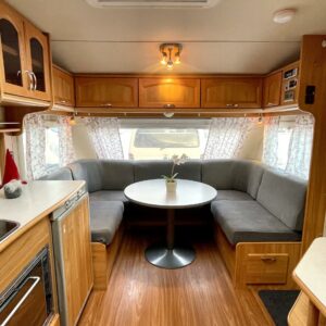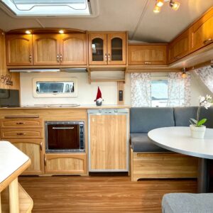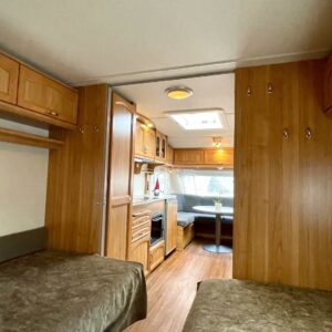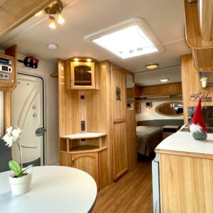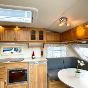 Vaunun etuosaa hallitsee tilava U-pöytäryhmä, jonka verhoilu on uusittu ja pöytä vaihdettu tyylikkääseen ja kätevän kokoiseen pyöreään malliin. Keskiosan avarassa tuvassa on hyvällä laskutilalla ja kaasu-uunilla varusteltu keittiö sekä täysikokoinen vaatekaappi. Keittiötä vastapäätä sijaitsevat takkinaulakon taakseen kätkevä TV-kaluste ja tilava kylpyhuone bidee-suihkulla ja kasetti-WC:llä. Vaunun takaosan makuuhuoneen rauhasta löytyvät täysikokoiset erillisvuoteet kahdelle aikuiselle.
