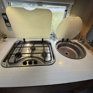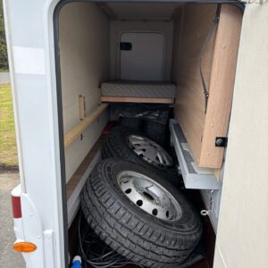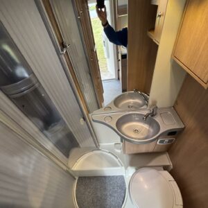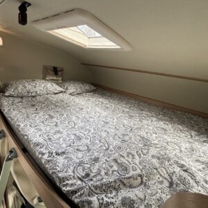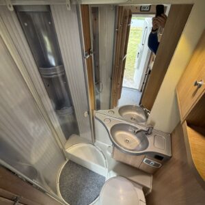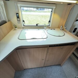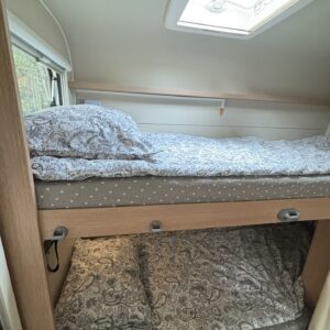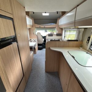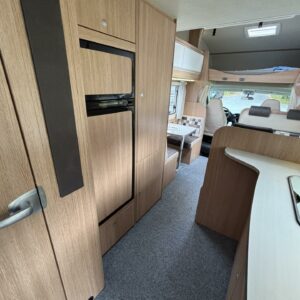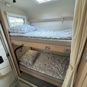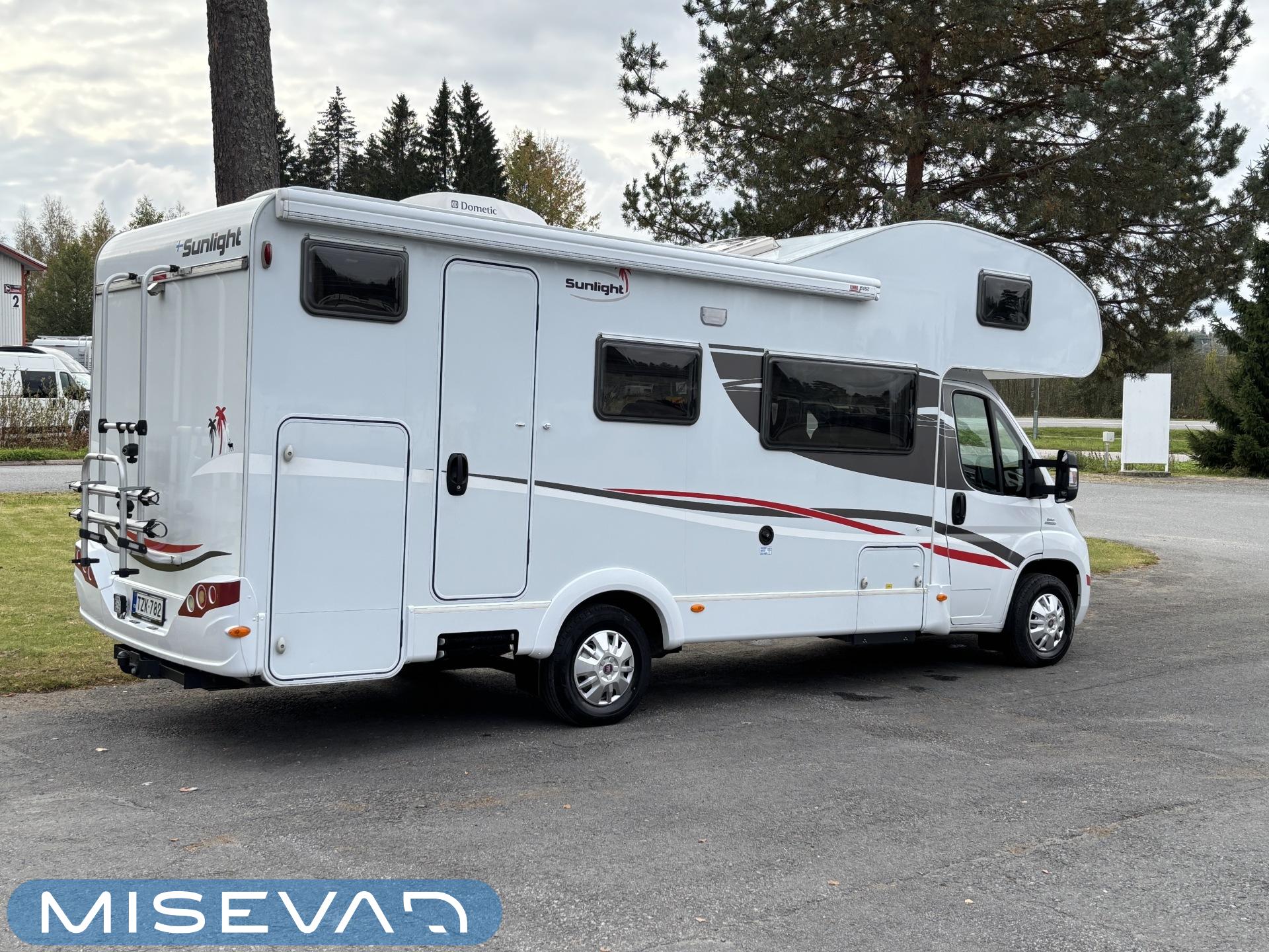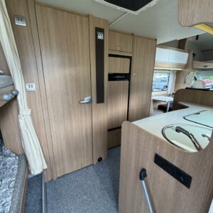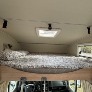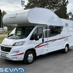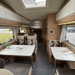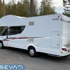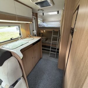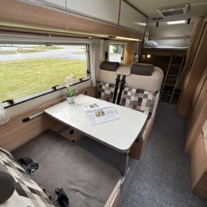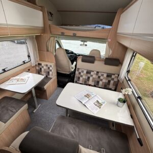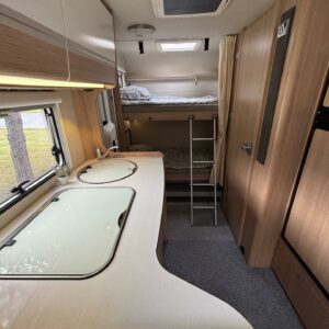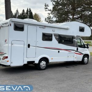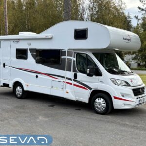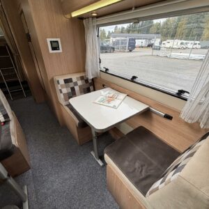 Nyt on tilaa temmeltää! Tämä todellinen perhevankkuri kerrosvuoteilla ja kahdella pöytäryhmällä tarjoaa vuodepaikat jopa seitsemälle yöpyjälle (rek. matkustuspaikat kuudelle). Ohjaamon päällä olevassa alkovissa köllöttelee mukavasti kaksi henkilöä. 2+2 ja 1+1 pöytäryhmistä saadaan tarvittaessa sijattua vuoteet kolmelle henkilölle. Ja loput kaksi makoilee taakse poikittain sijoitetuissa kerrosvuoteissa. Kerrosvuoteista alemman saa nostettua ylös, jolloin tarjolla on ”takatalli” säilytystilaa tavaroille. Tietysti tästä löytyy vielä keittiö, sekä WC/kylppäritilat. Lämmitysjärjestelmänä toimii Trumaticin tehokkain (6kw) ilmakeskuslämmitys sähkövastuksilla marinoituna. Autossa on oikein mallikas varustelu jo valmiiksi asennettuna. Ilmastointi on ohjaamossa, sekä asuintilassa ja ohjaamon varusteissa myös vakionopeuden säädin ja peruutuskamera. Pihapuolen varusteluista mainittakkoon markiisi, vetokoukku ja pyöräteline. Aika nätti kokonaisuus kyseessä.