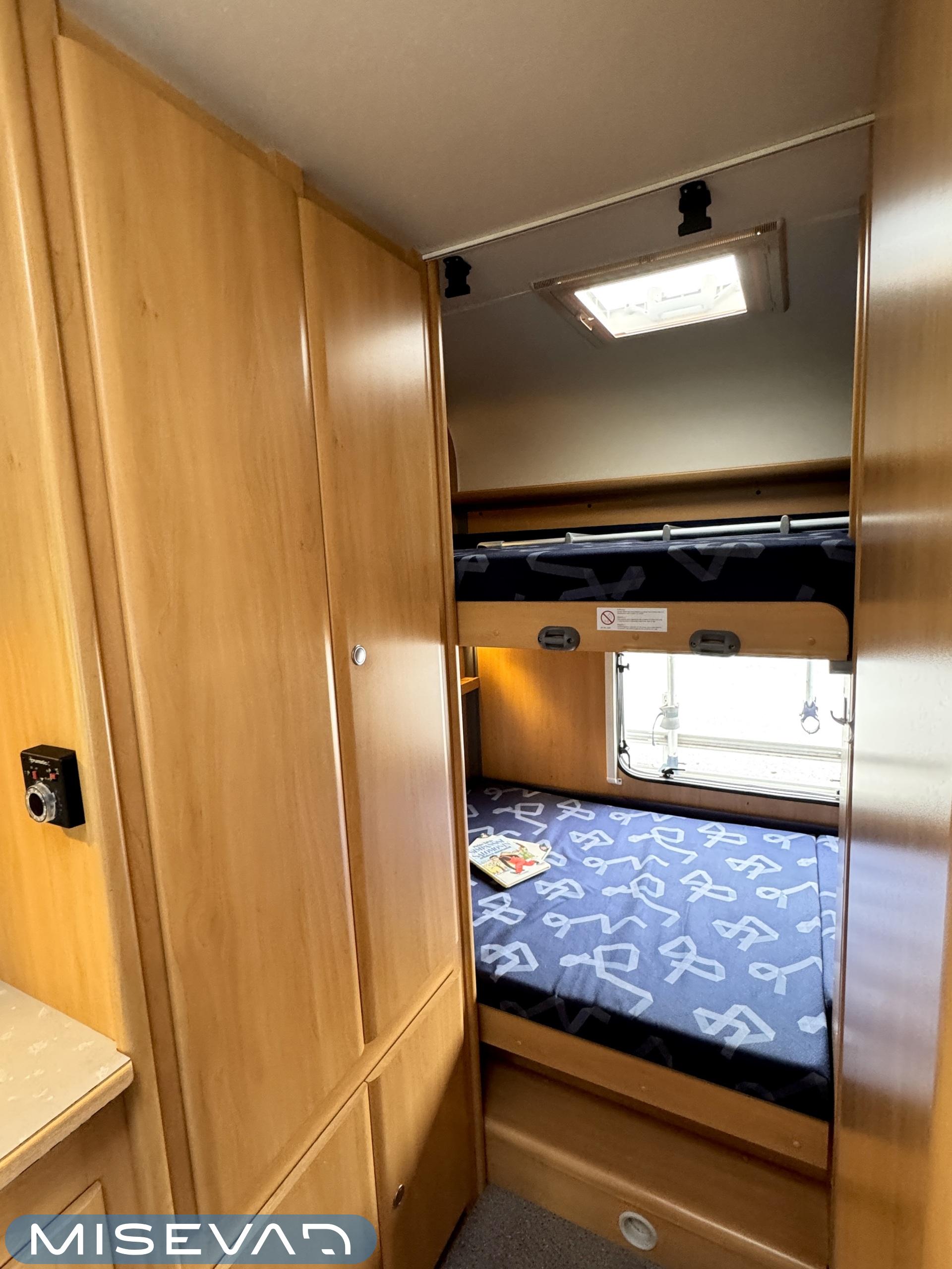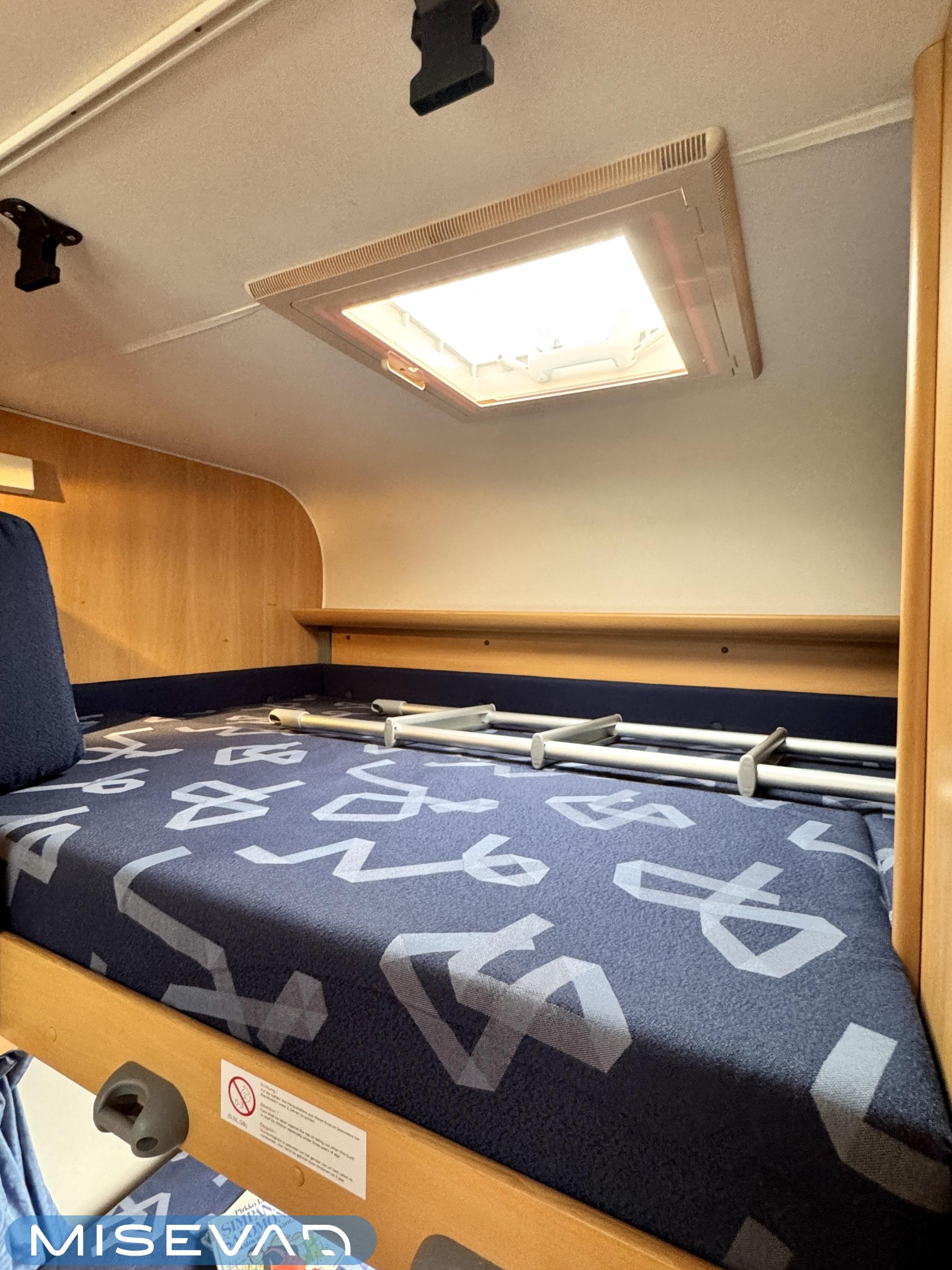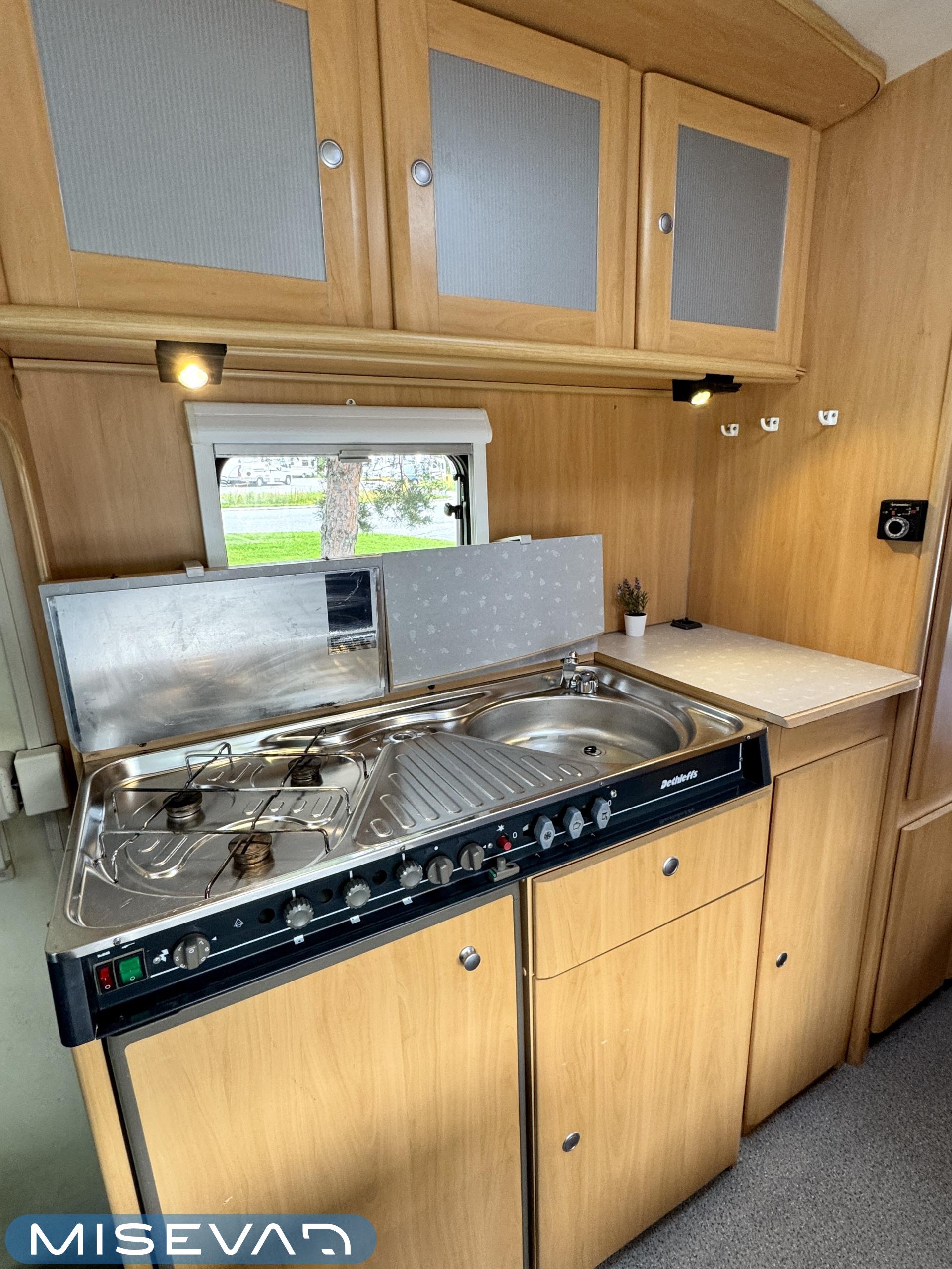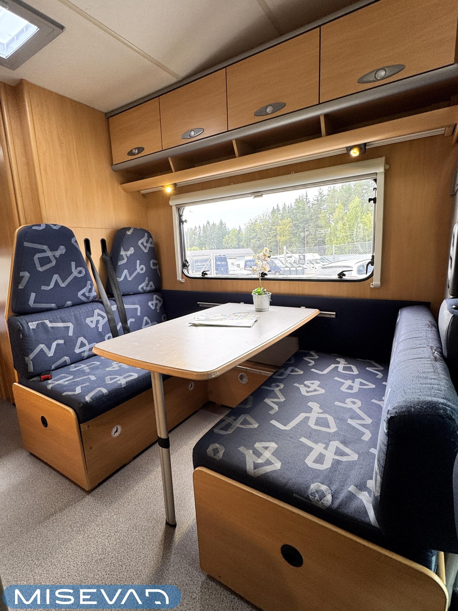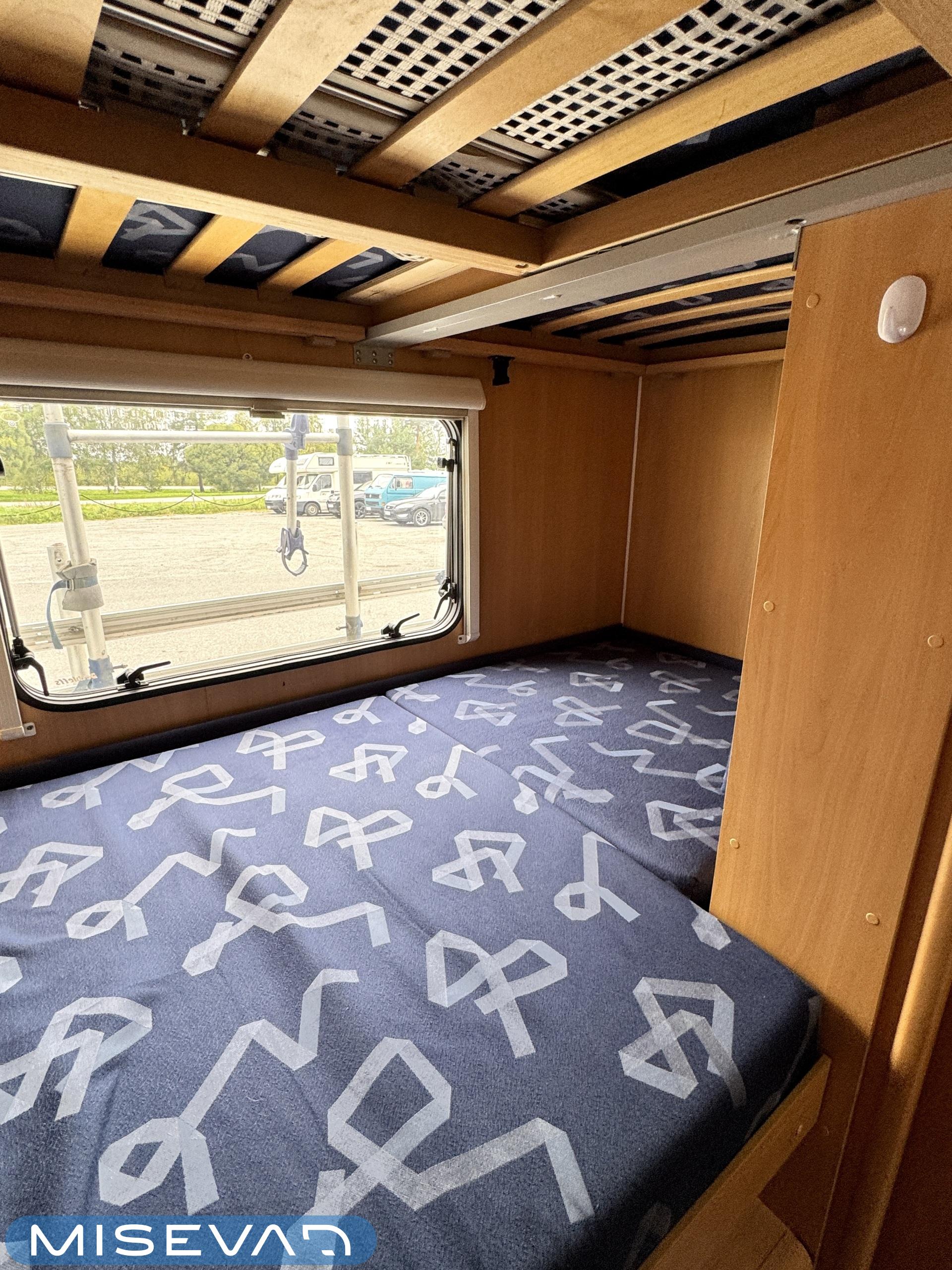 Sisätiloissa viihtyy pidemmälläkin reissulla: saarekevuode ja alaslaskusänky tarjoavat reilusti nukkumatilaa, keittiössä on jenkkijääkaappi ja liesi sekä kaasun ulosotto. Erillinen WC sekä erillinen suihku lisäävät asumismukavuutta. Takatalliin mahtuvat harrastusvälineet, ja markiisin alle luot mukavan oleskelutilan.
