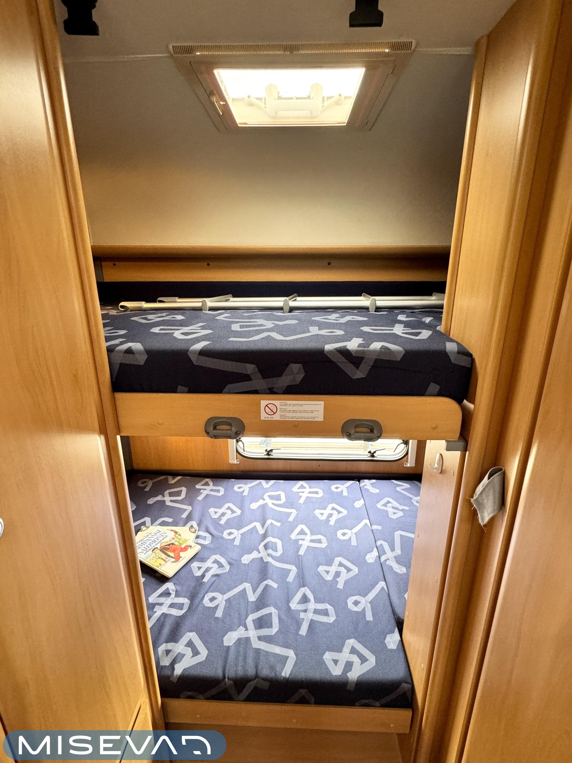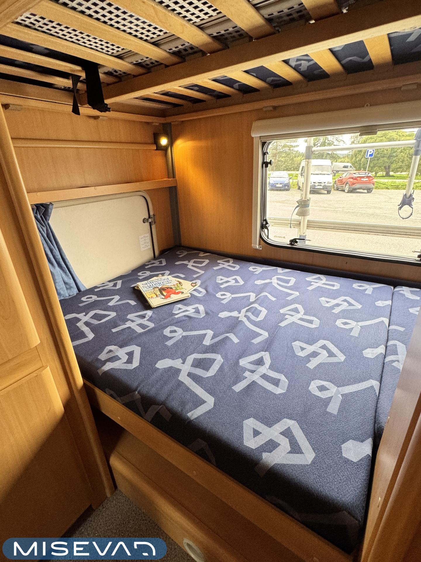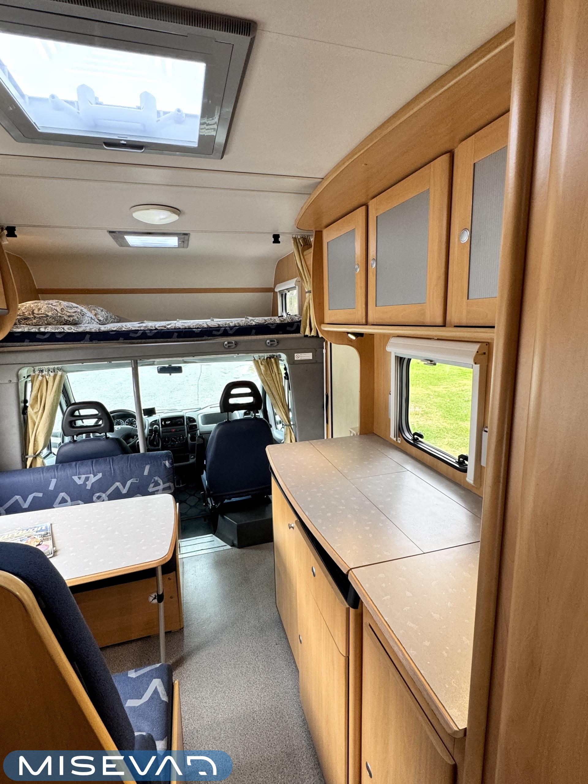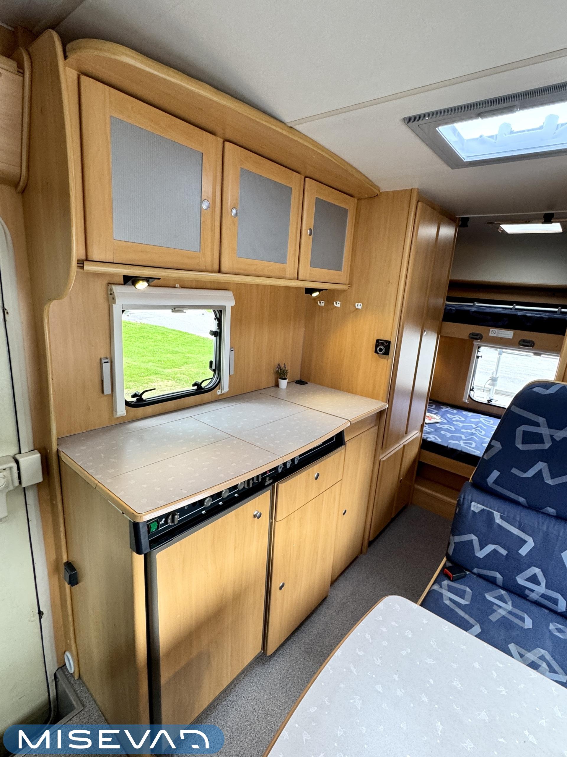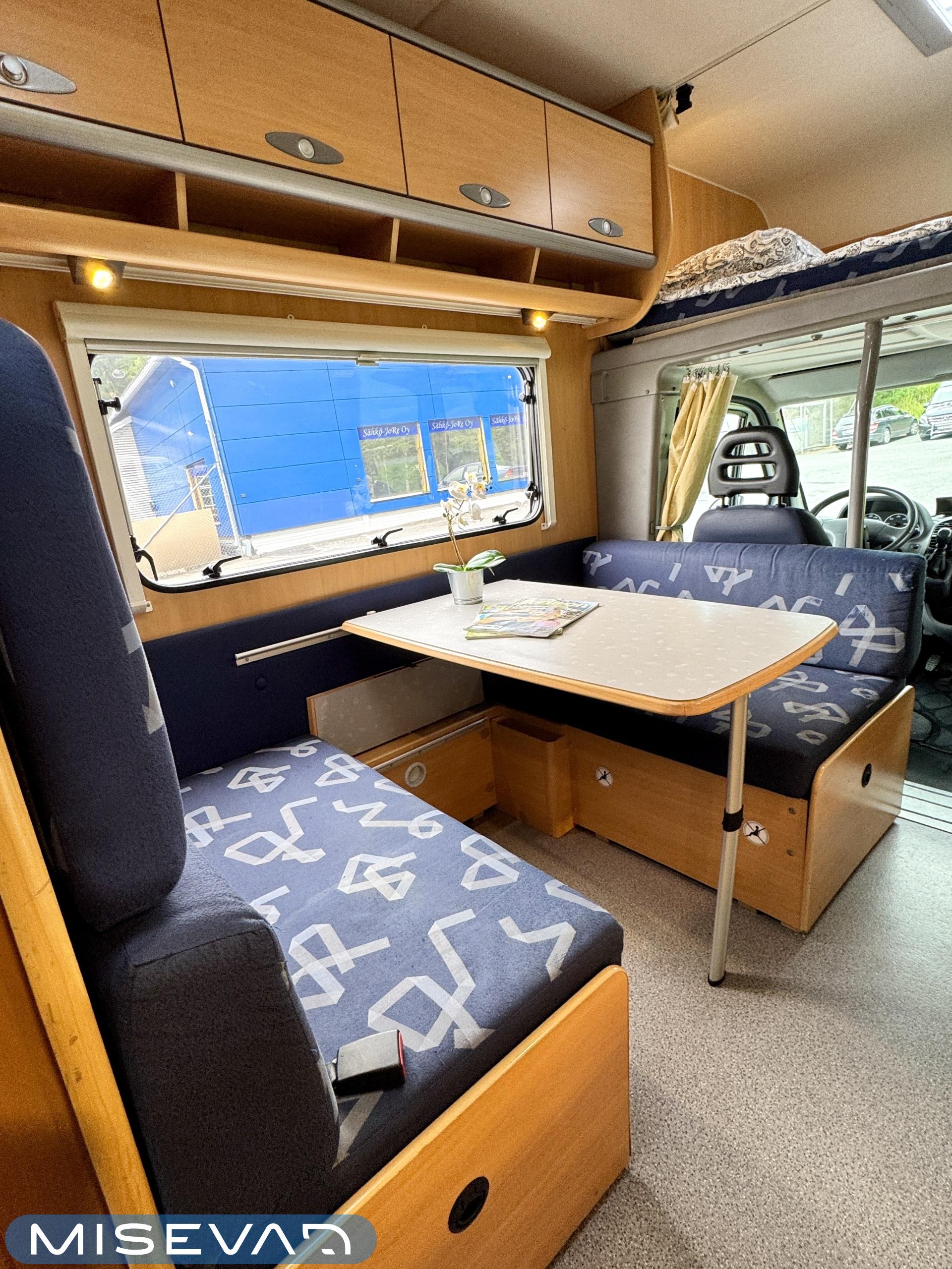 Sisätiloissa viihtyy pidemmälläkin reissulla: saarekevuode ja alaslaskusänky tarjoavat reilusti nukkumatilaa, keittiössä on jenkkijääkaappi ja liesi sekä kaasun ulosotto. Erillinen WC sekä erillinen suihku lisäävät asumismukavuutta. Takatalliin mahtuvat harrastusvälineet, ja markiisin alle luot mukavan oleskelutilan.