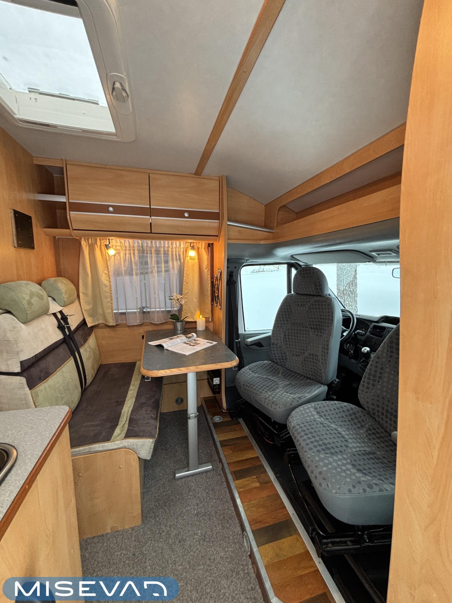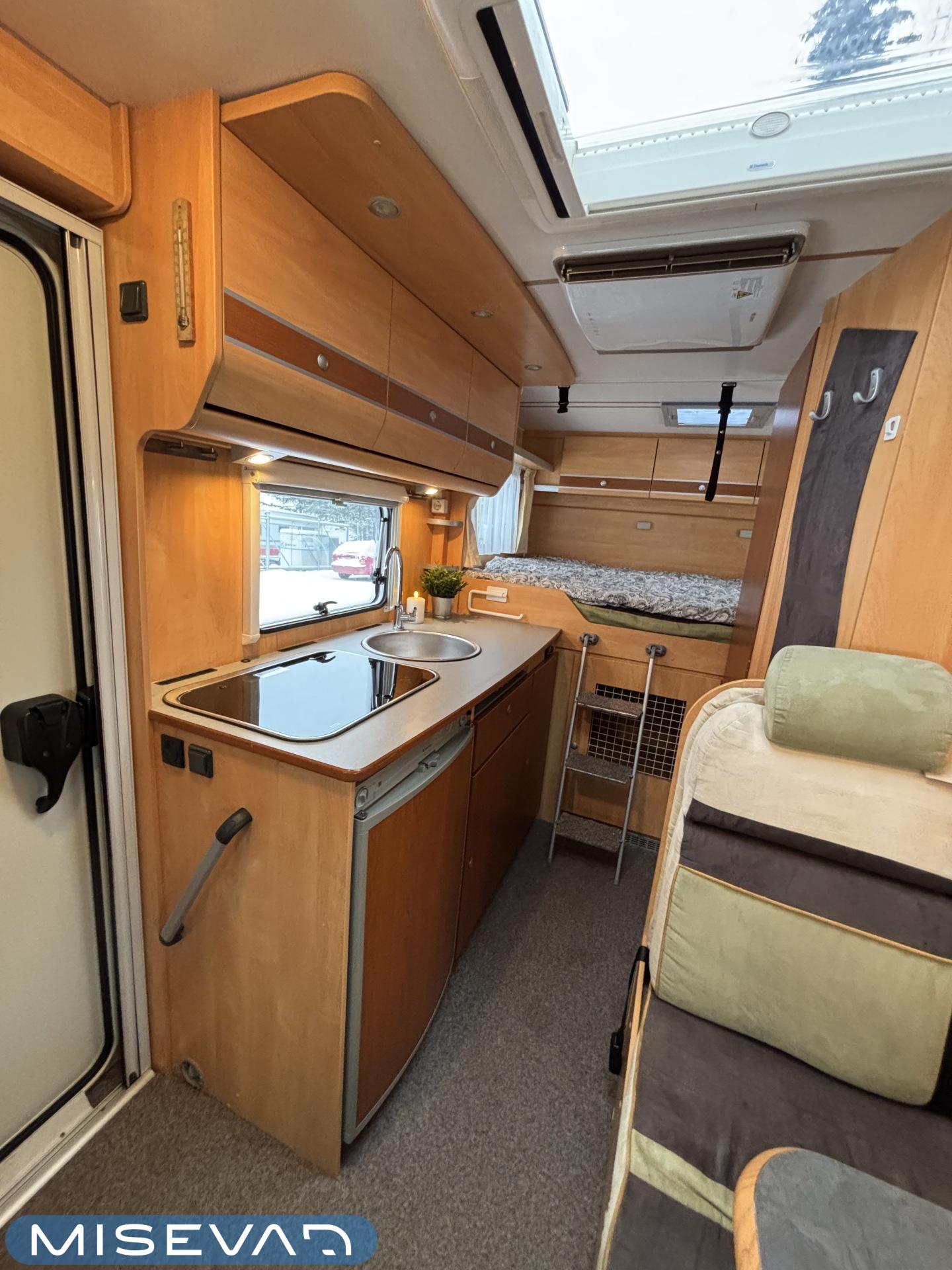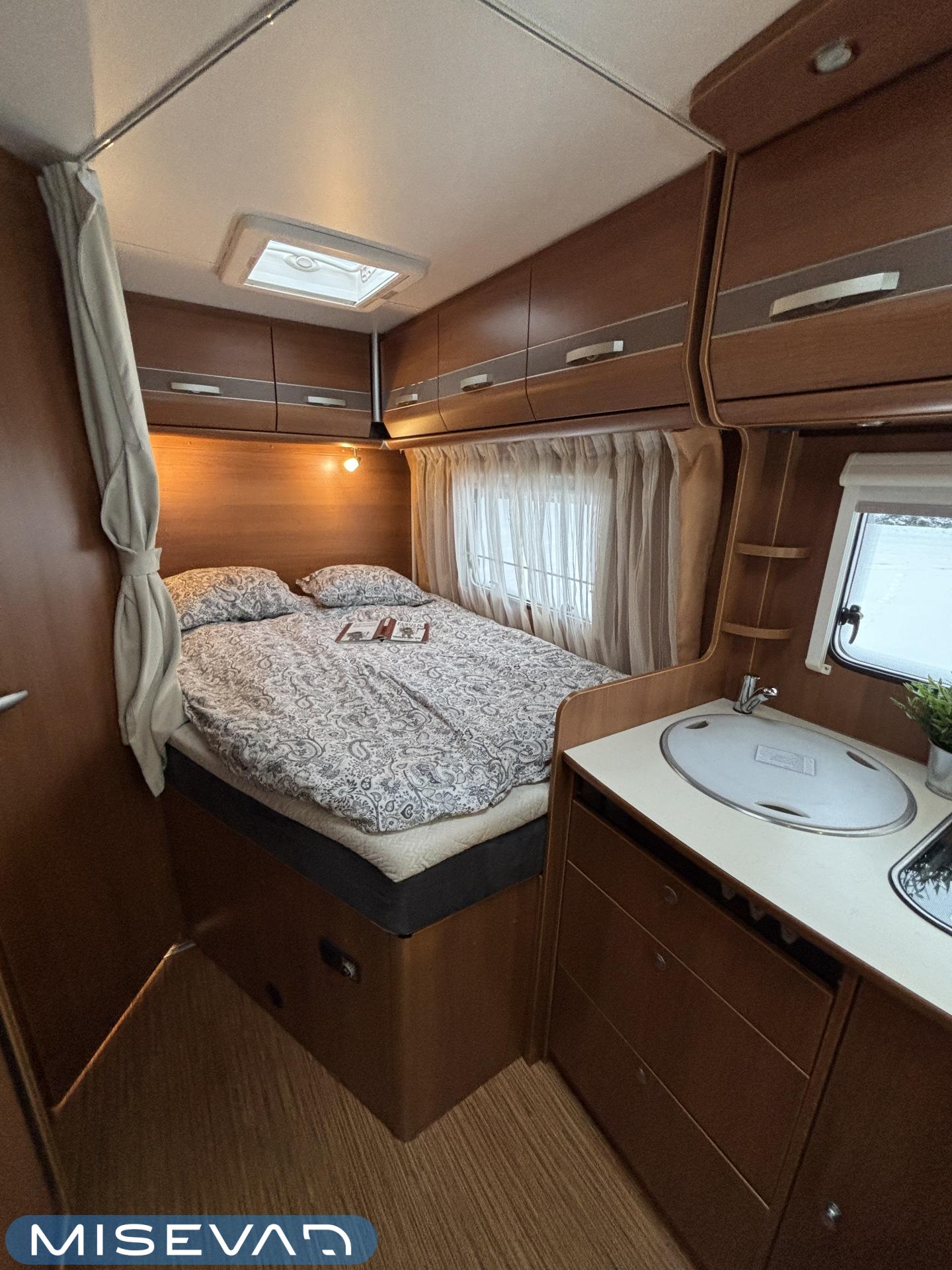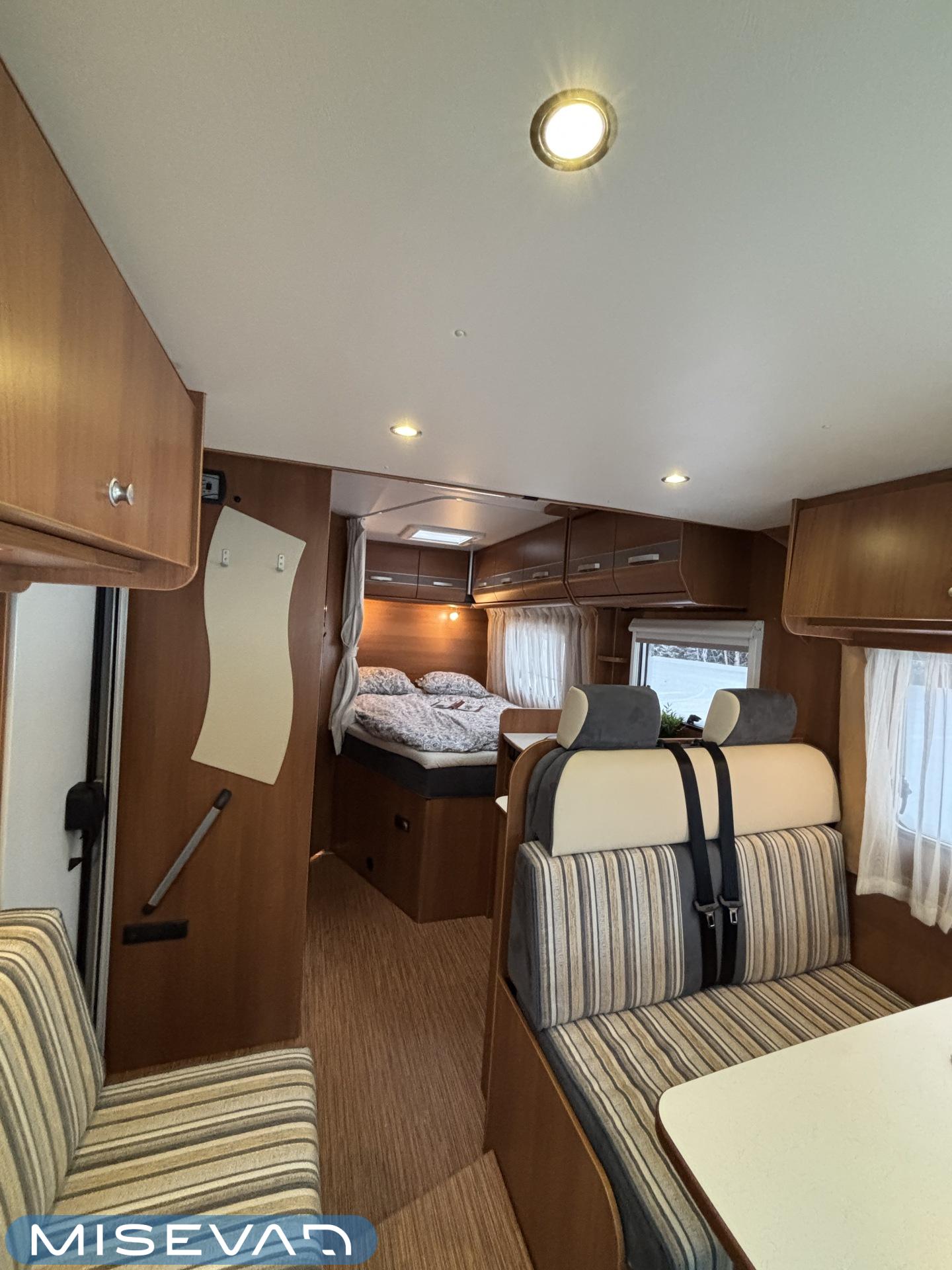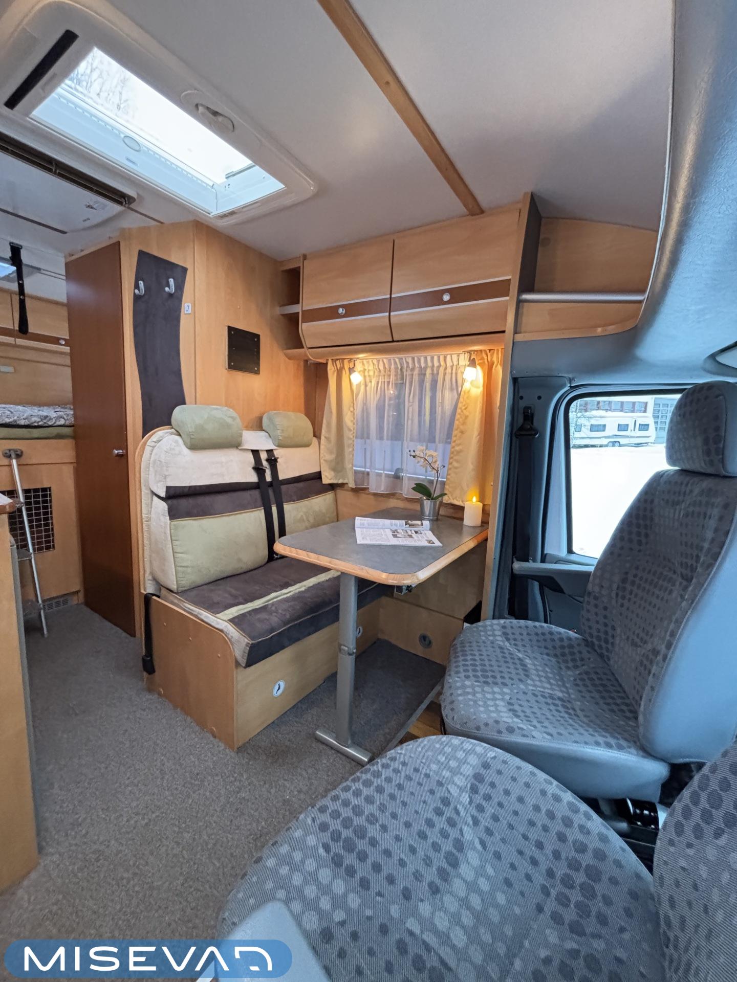 Poikittaisella parivuoteella ja takatallilla varustettu alle seiskametrinen matkakoti esimerkiksi pariskunnille. Tässä yksilössä ajomääräkin on vielä ihan maltillisella tasolla. Auton takaosassa on poikittainen parivuode ja sen alle jää mukavasti säilytystiloja. Keskelle autoa asemoituu keittiötilat ja toiselta sivulta löytyy kylppäritilat. Edessä on pöytäryhmä minne yhdistyvät kääntyvät ohjaamon penkit. Lämmön pirttiin toimittaa Trumaticin tehokkainta mallia (6kw) oleva ilmapuhalluslämmitin ja se on kaasukäyttöinen. Autossa on tietysti myös normaalit matkailuajoneuvon varusteet, eli löytyy jääkaappi, lämminvesiboileri, sekä liesi. Kesäkuumalla viilennys tapahtuu ajon aikana ohjaamoilmastoinnilla ja leirissä kattoilmastoinnin avulla (tarvitaan verkkovirta). Pari fillaria matkaa kätevästi mukana takaseinälle sijoitetussa pyörätelineessä. Löytyypä autosta vielä pienille verkkovirtalaitteille tarkoitettu 600W siniaaltoinvertterikin ja aurinkopaneeli. Ajettavissa henkilöauton B-kortilla ja rekisteröidyt matkustuspaikat neljälle henkilölle.