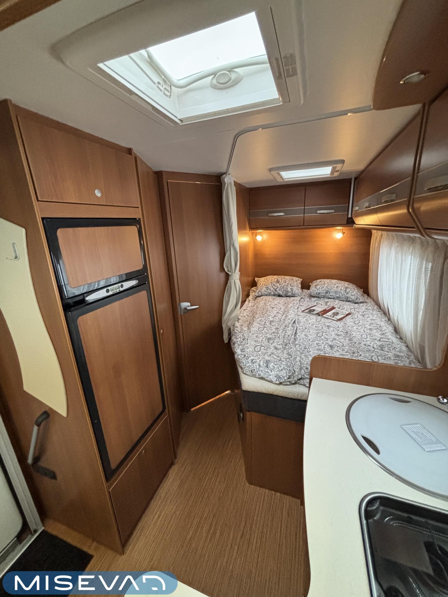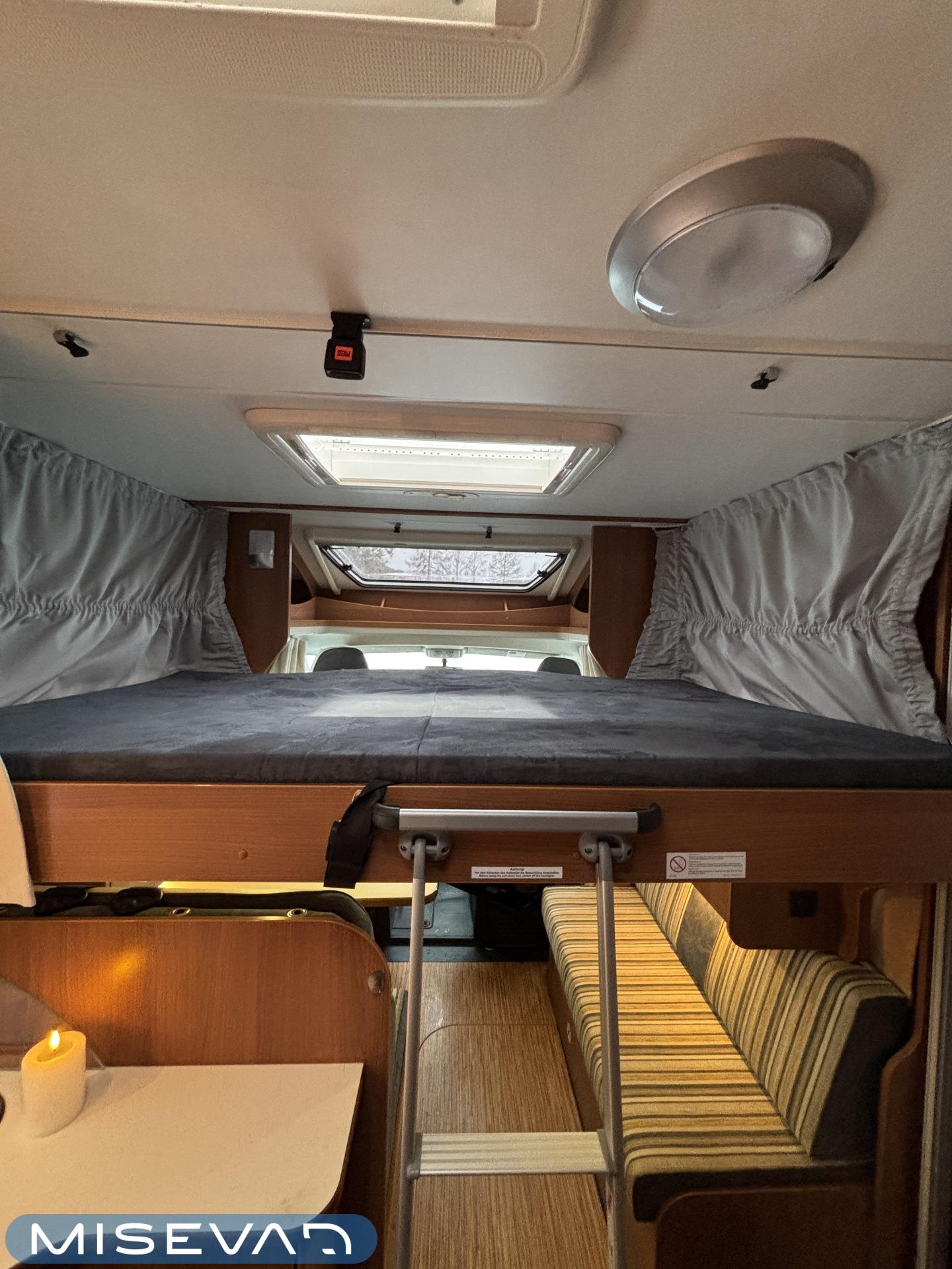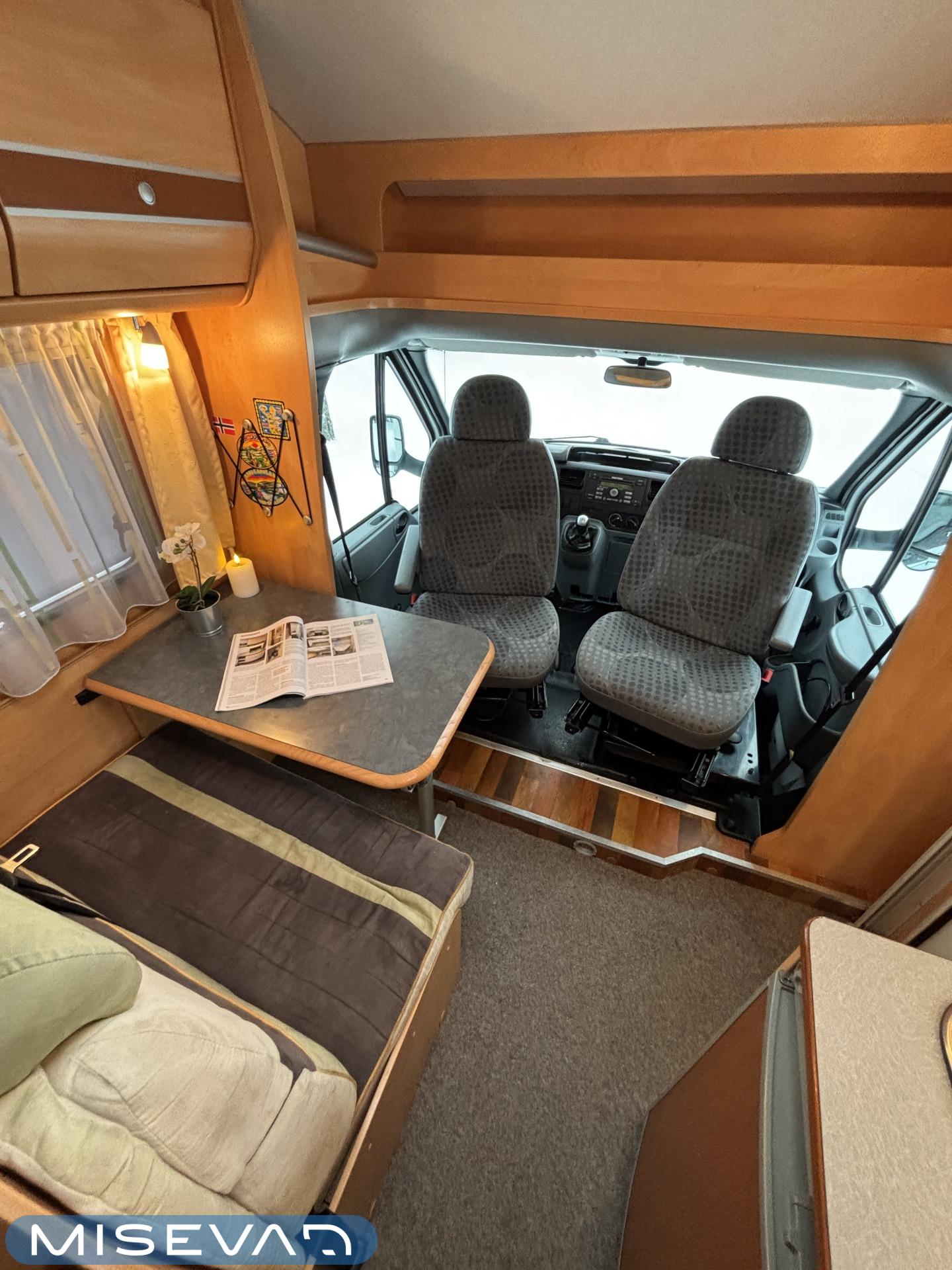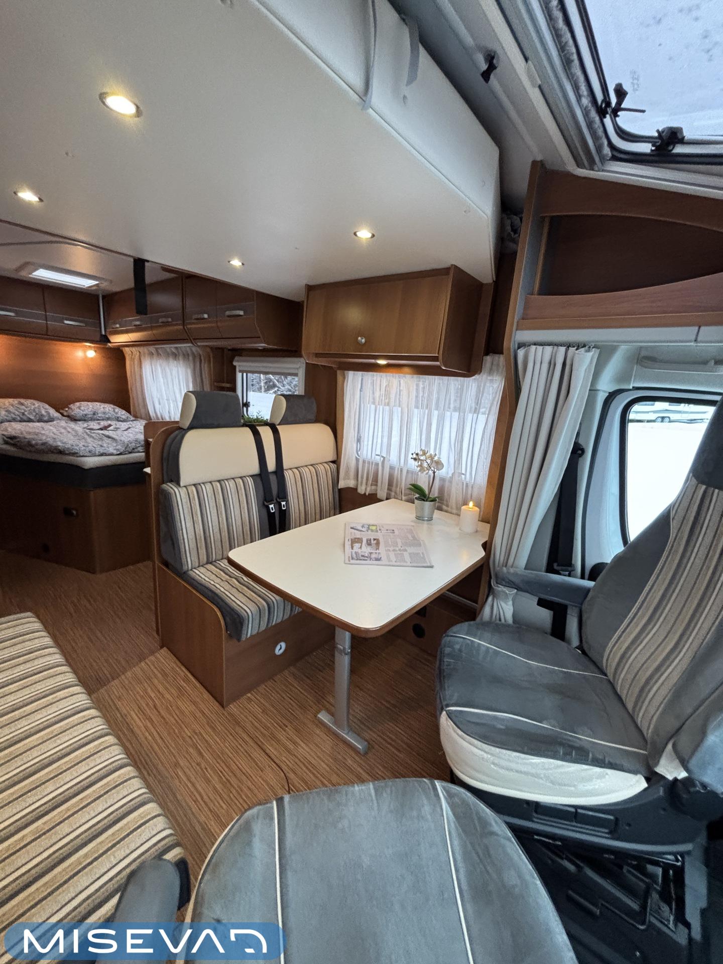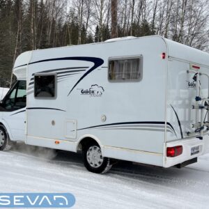 Poikittaisella parivuoteella ja takatallilla varustettu alle seiskametrinen matkakoti esimerkiksi pariskunnille. Tässä yksilössä ajomääräkin on vielä ihan maltillisella tasolla. Auton takaosassa on poikittainen parivuode ja sen alle jää mukavasti säilytystiloja. Keskelle autoa asemoituu keittiötilat ja toiselta sivulta löytyy kylppäritilat. Edessä on pöytäryhmä minne yhdistyvät kääntyvät ohjaamon penkit. Lämmön pirttiin toimittaa Trumaticin tehokkainta mallia (6kw) oleva ilmapuhalluslämmitin ja se on kaasukäyttöinen. Autossa on tietysti myös normaalit matkailuajoneuvon varusteet, eli löytyy jääkaappi, lämminvesiboileri, sekä liesi. Kesäkuumalla viilennys tapahtuu ajon aikana ohjaamoilmastoinnilla ja leirissä kattoilmastoinnin avulla (tarvitaan verkkovirta). Pari fillaria matkaa kätevästi mukana takaseinälle sijoitetussa pyörätelineessä. Löytyypä autosta vielä pienille verkkovirtalaitteille tarkoitettu 600W siniaaltoinvertterikin ja aurinkopaneeli. Ajettavissa henkilöauton B-kortilla ja rekisteröidyt matkustuspaikat neljälle henkilölle.