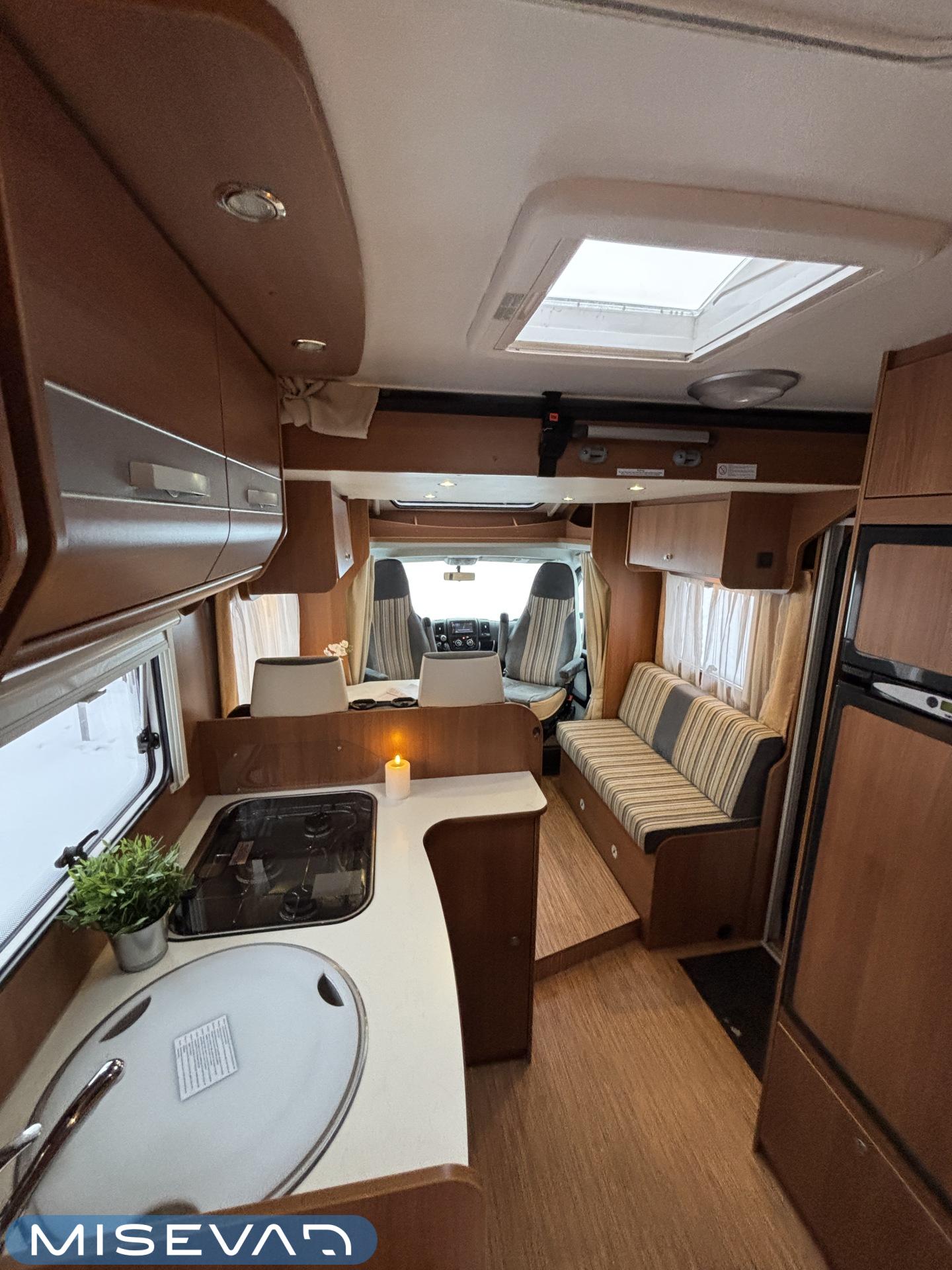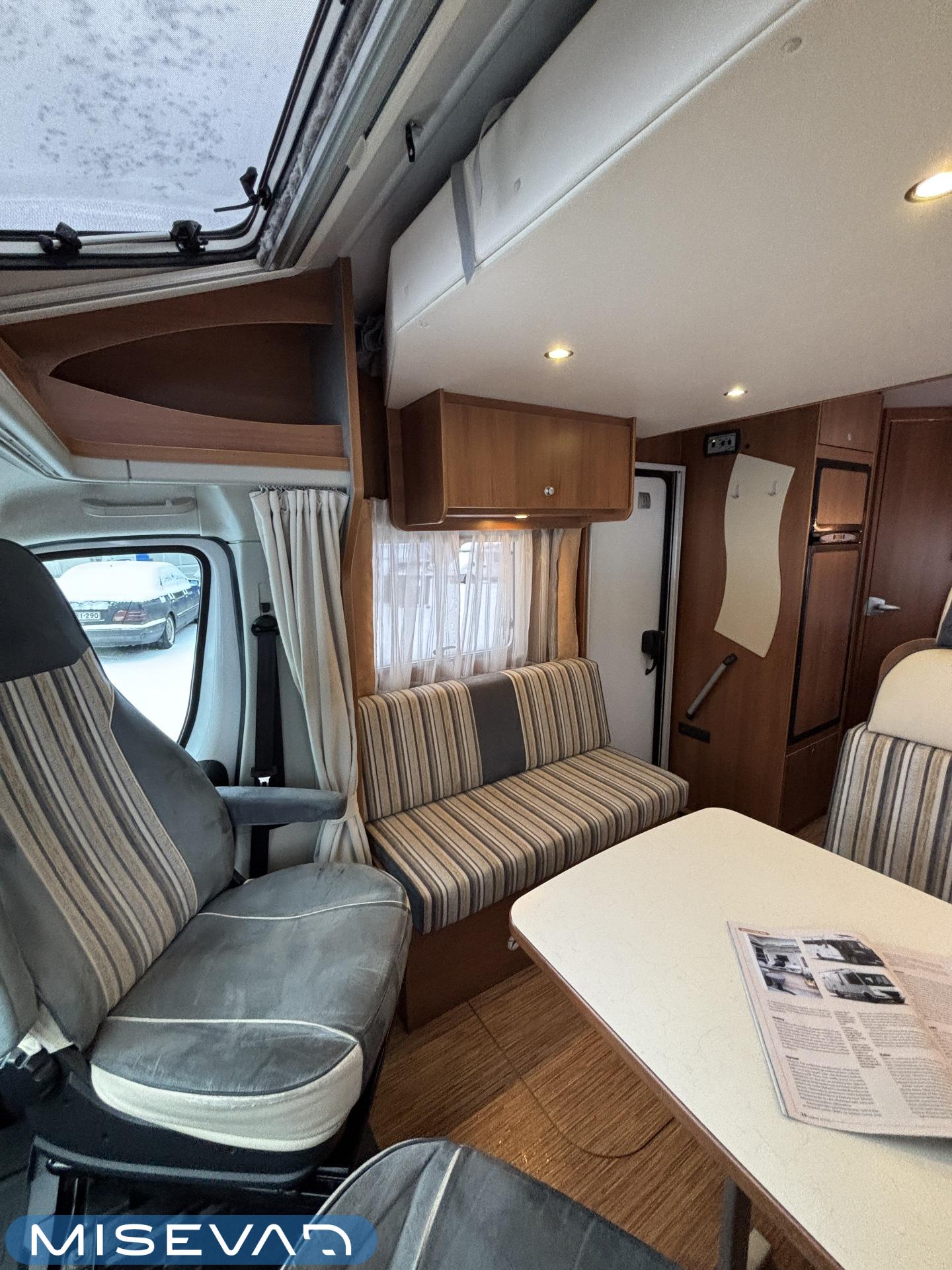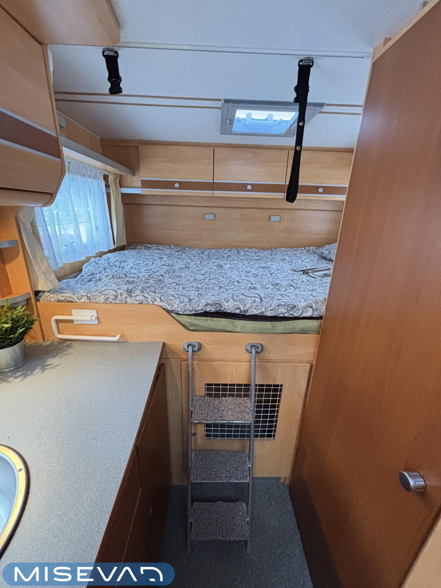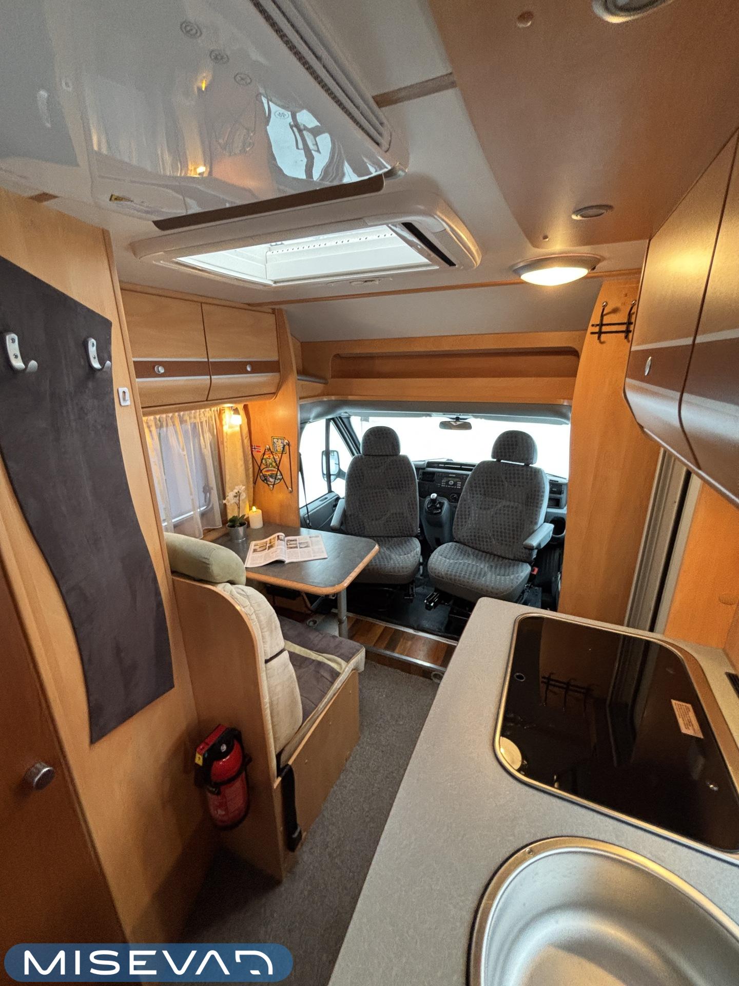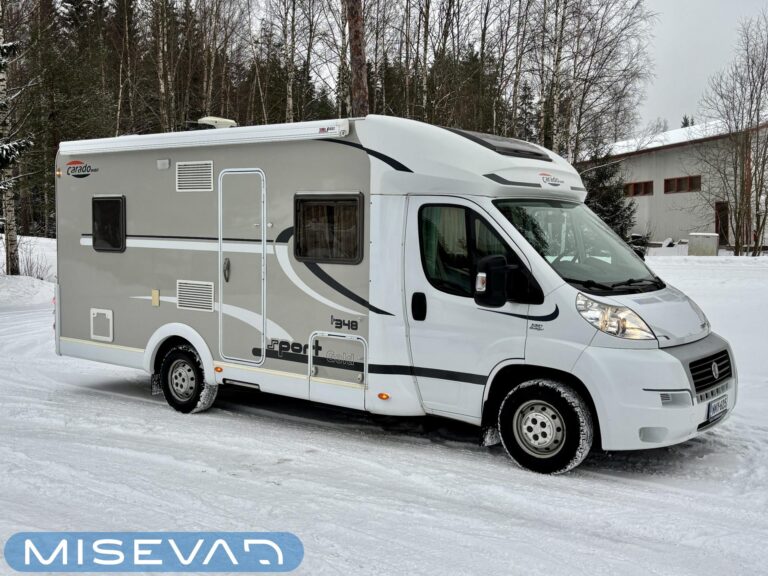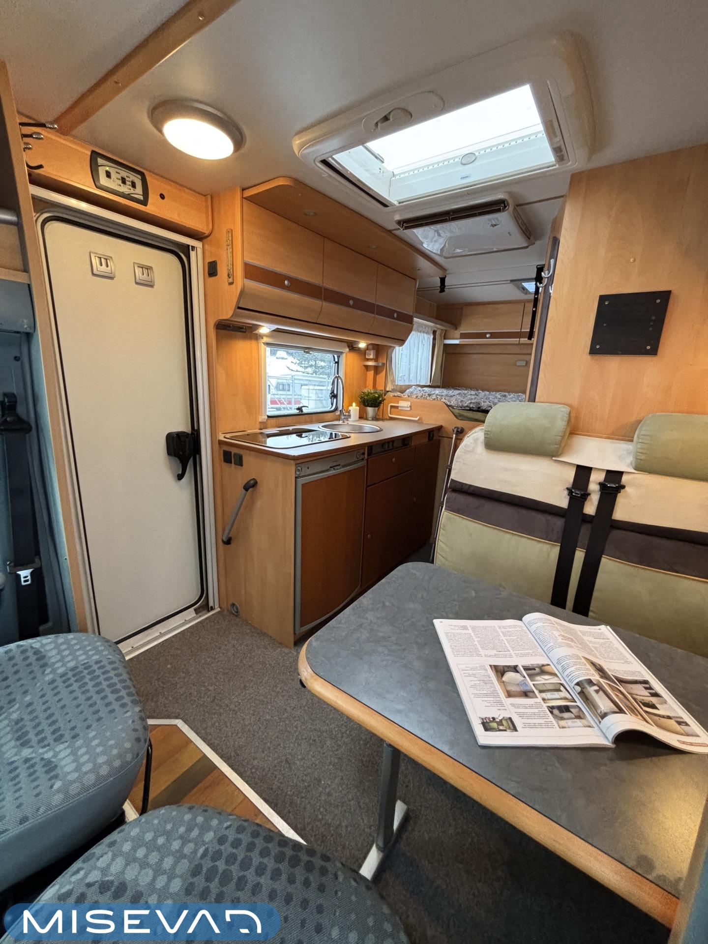 Poikittaisella parivuoteella ja takatallilla varustettu alle seiskametrinen matkakoti esimerkiksi pariskunnille. Tässä yksilössä ajomääräkin on vielä ihan maltillisella tasolla. Auton takaosassa on poikittainen parivuode ja sen alle jää mukavasti säilytystiloja. Keskelle autoa asemoituu keittiötilat ja toiselta sivulta löytyy kylppäritilat. Edessä on pöytäryhmä minne yhdistyvät kääntyvät ohjaamon penkit. Lämmön pirttiin toimittaa Trumaticin tehokkainta mallia (6kw) oleva ilmapuhalluslämmitin ja se on kaasukäyttöinen. Autossa on tietysti myös normaalit matkailuajoneuvon varusteet, eli löytyy jääkaappi, lämminvesiboileri, sekä liesi. Kesäkuumalla viilennys tapahtuu ajon aikana ohjaamoilmastoinnilla ja leirissä kattoilmastoinnin avulla (tarvitaan verkkovirta). Pari fillaria matkaa kätevästi mukana takaseinälle sijoitetussa pyörätelineessä. Löytyypä autosta vielä pienille verkkovirtalaitteille tarkoitettu 600W siniaaltoinvertterikin ja aurinkopaneeli. Ajettavissa henkilöauton B-kortilla ja rekisteröidyt matkustuspaikat neljälle henkilölle.
